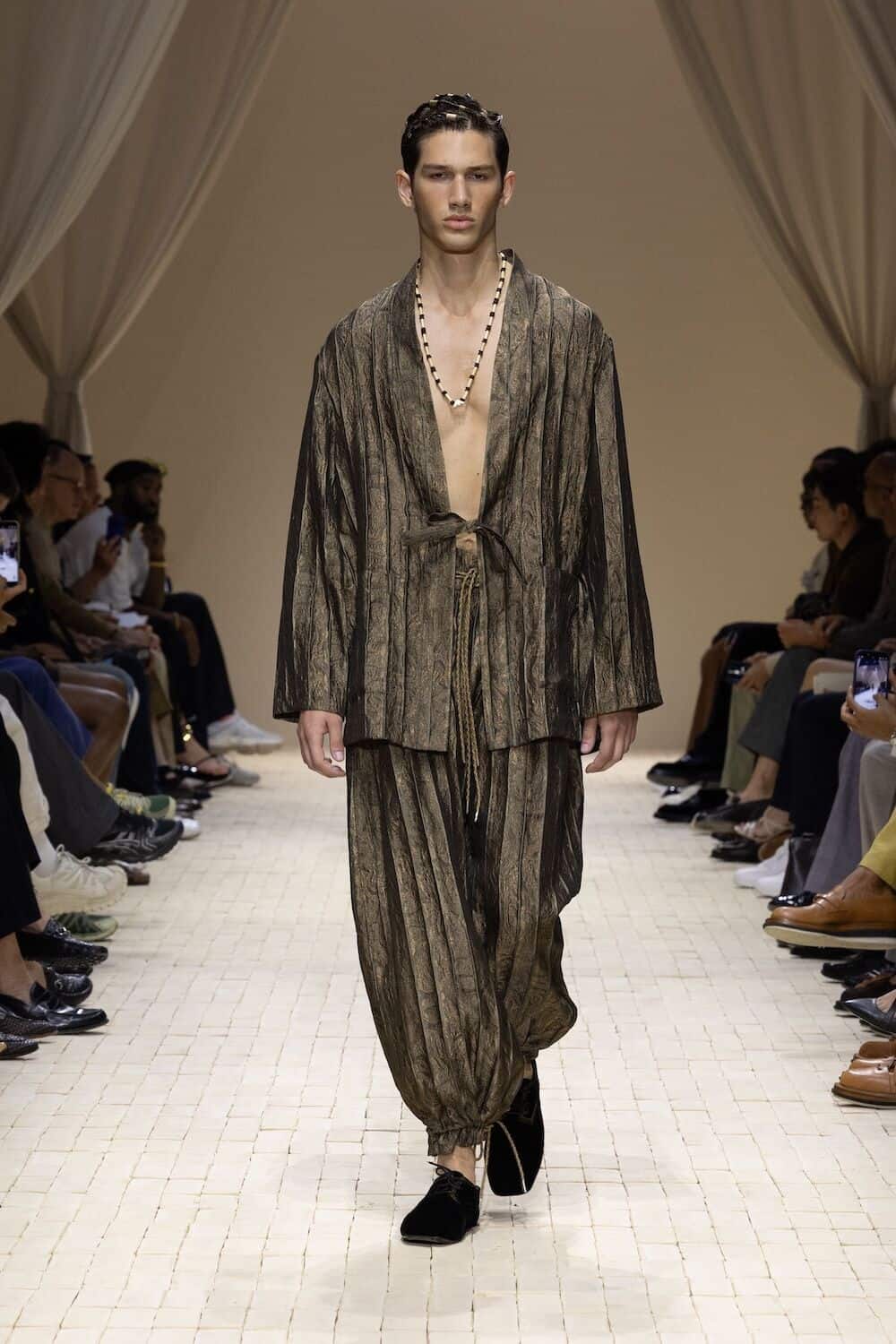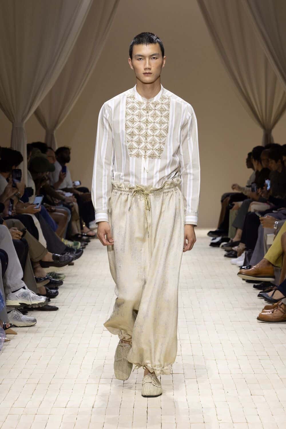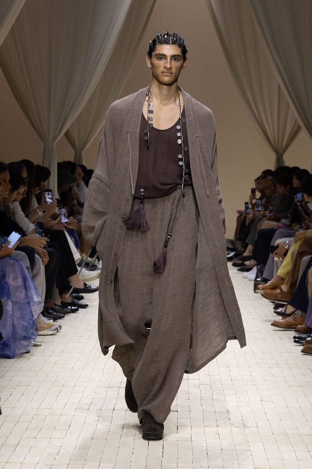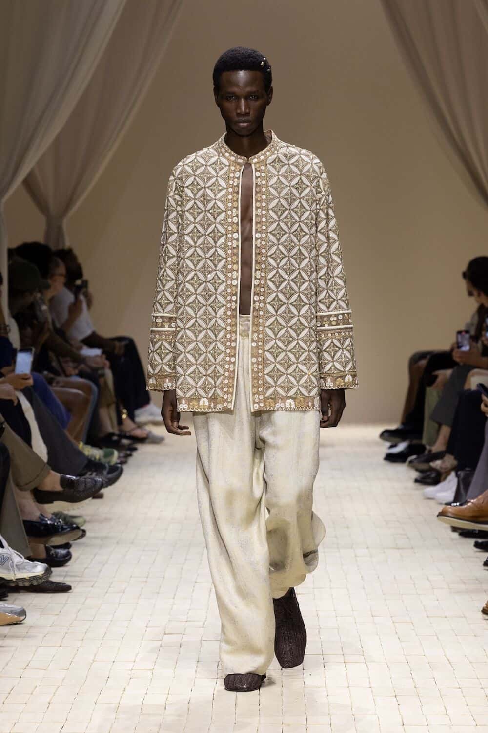 There were feathered tunics, rattan hats with trailing ponytails, smock tops printed with safari sketches and enough plissé to pleat the Sahara. Woven in were nods to Moroccan mosaics, Berber textiles and tattooed smock stitching. Soft tailoring – Armani’s bread and butter – held its ground in textured linens and cold-dyed cottons while beads, charms, silk embroidery and metal amulets swung from necks like portable relics. Adding to the desert-raider feel, the palette told a sun-baked story: scorched earth, saffron sand and desaturated red, all tinged with the melancholy blues of steppe shadows.