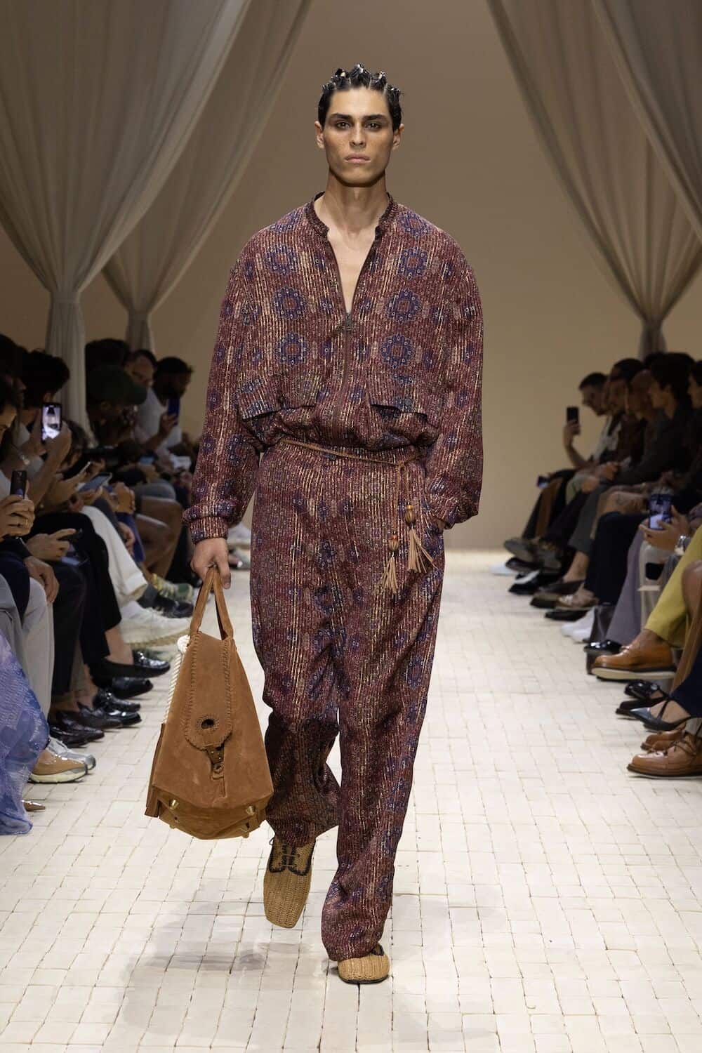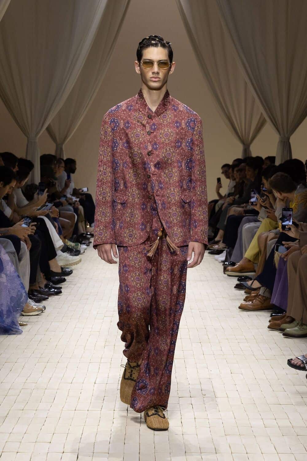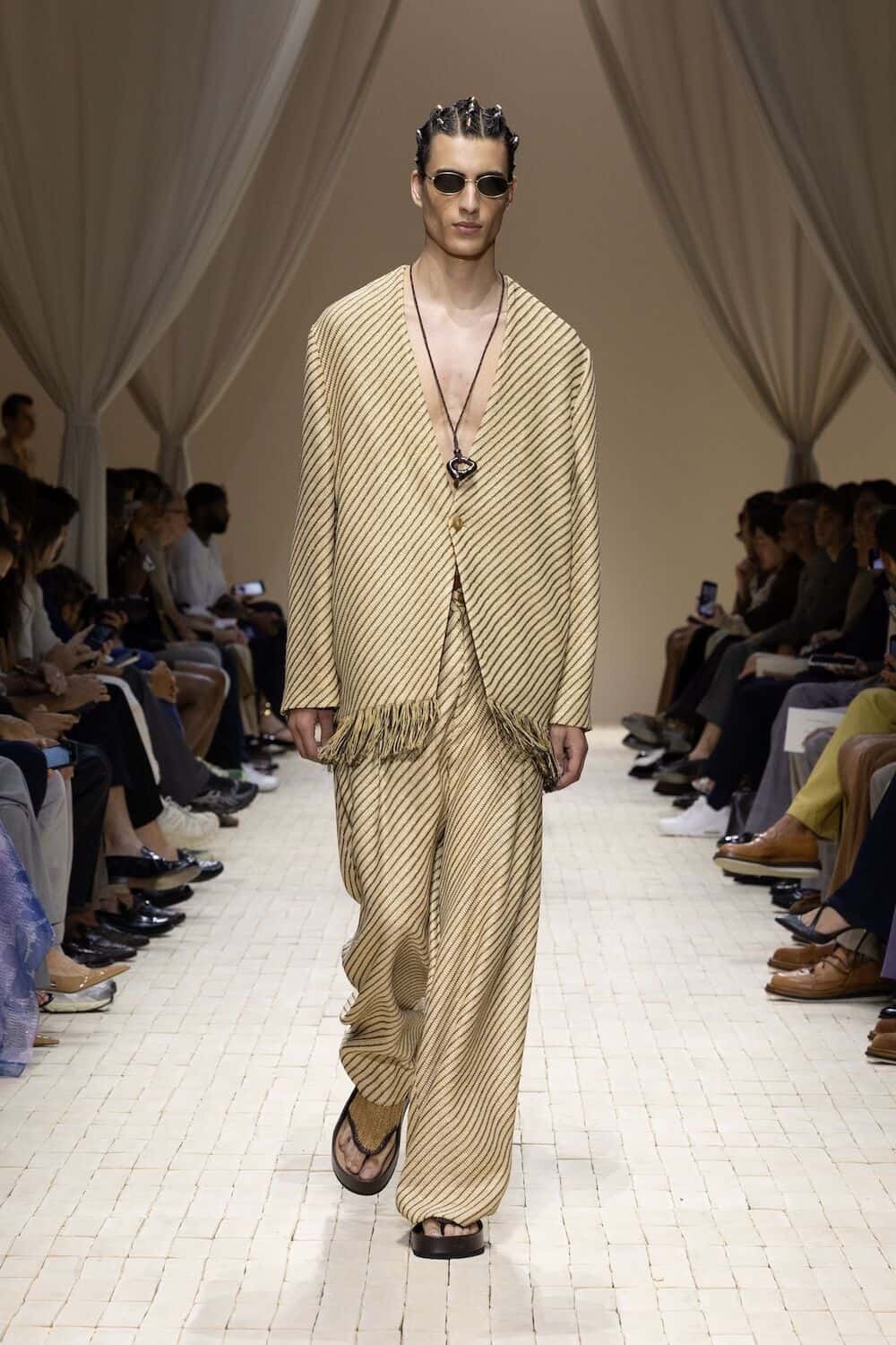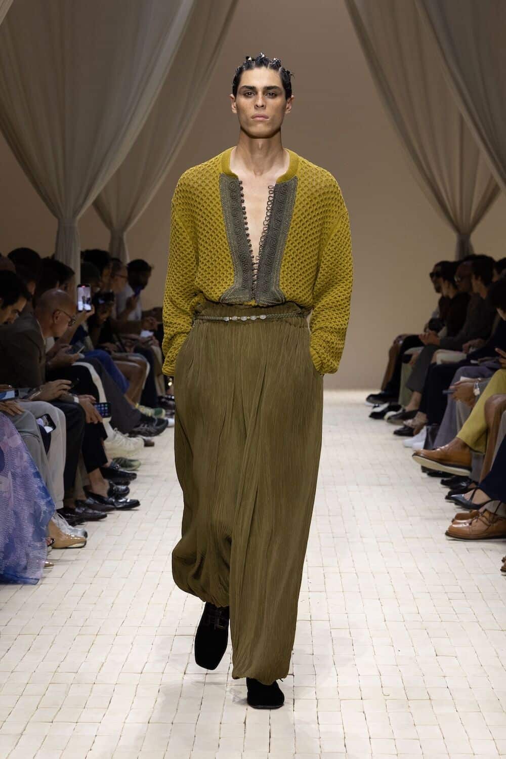There were feathered tunics, rattan hats with trailing ponytails, smock tops printed with safari sketches and enough plissé to pleat the Sahara. Woven in were nods to Moroccan mosaics, Berber textiles and tattooed smock stitching. Soft tailoring – Armani’s bread and butter – held its ground in textured linens and cold-dyed cottons while beads, charms, silk embroidery and metal amulets swung from necks like portable relics. Adding to the desert-raider feel, the palette told a sun-baked story: scorched earth, saffron sand and desaturated red, all tinged with the melancholy blues of steppe shadows.