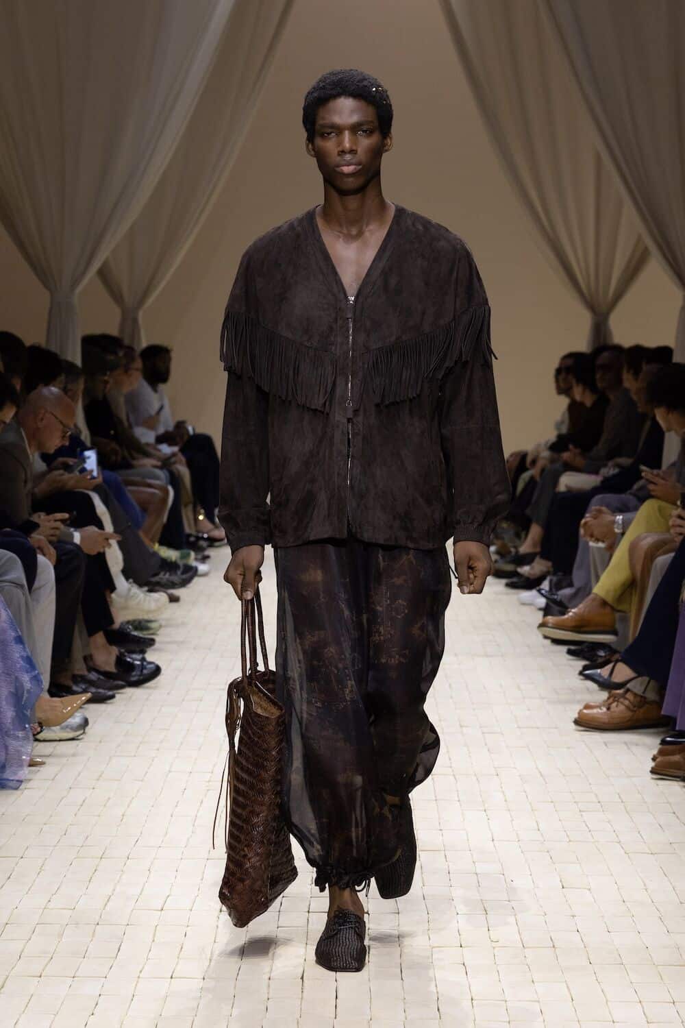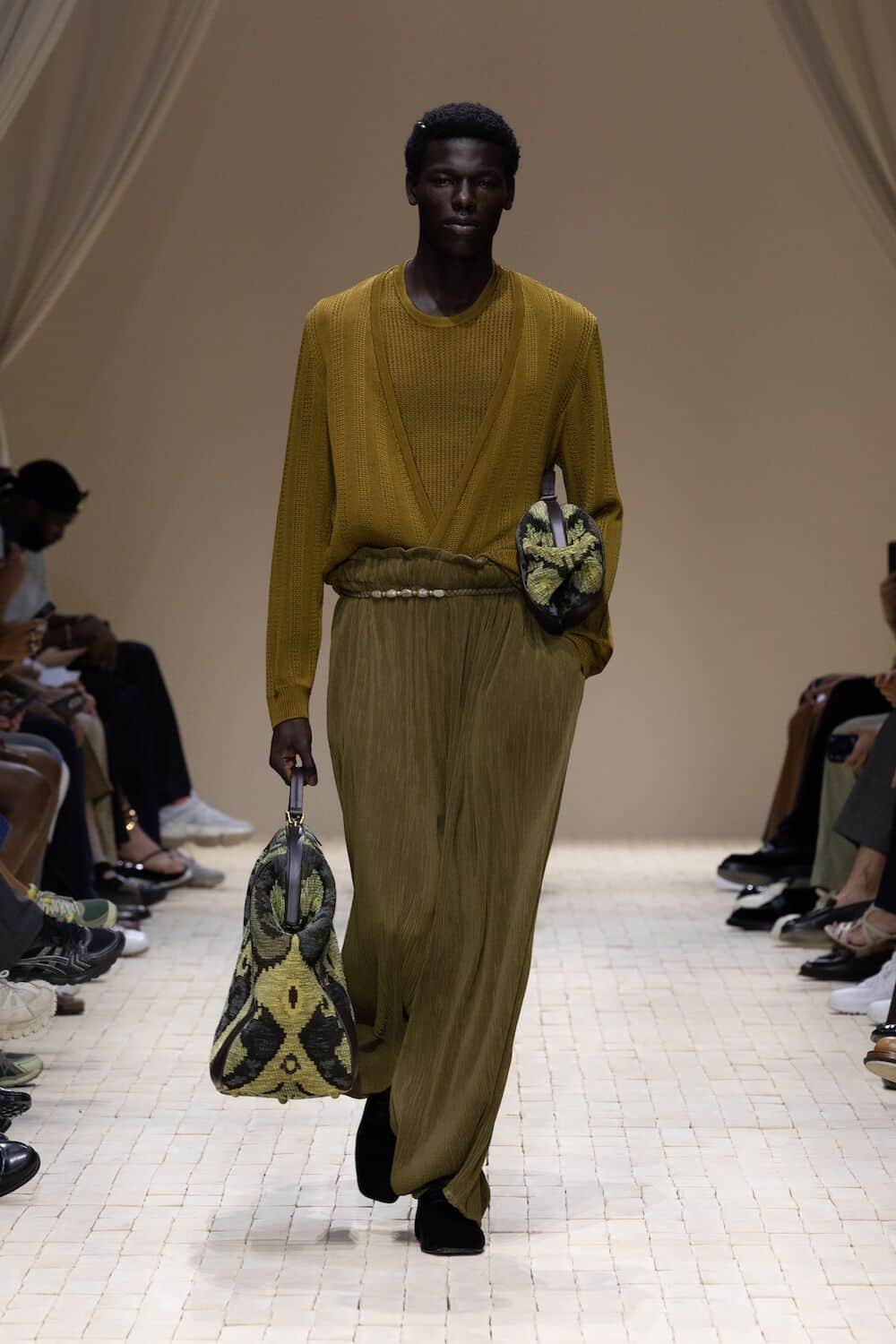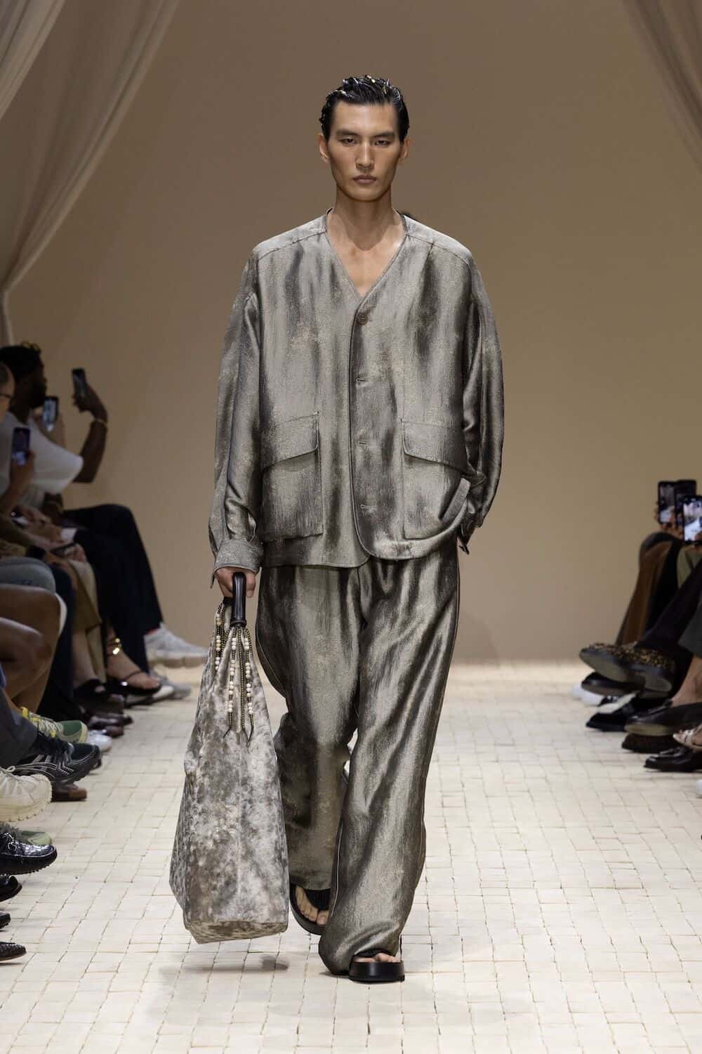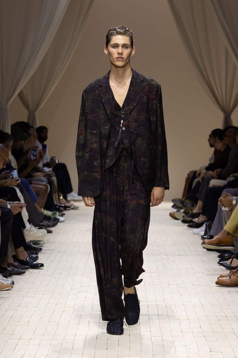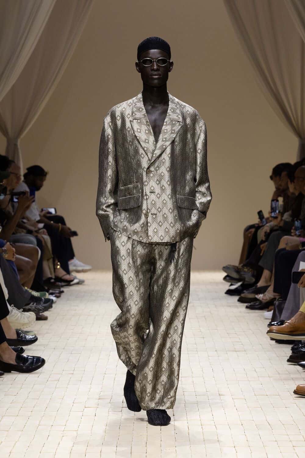 And what a pace it was. Emporio Armani’s SS26 show cracked open the desert floor and let something soulful spill out. It opened with a fast-footed crew of models storming down a terracotta-toned runway in futuristic marathon gear. From there, the mood shifted into something older and richer, welcoming a lush, roving wardrobe that pulled threads from North Africa, Central Asia and all the heat-hazed realms in between.