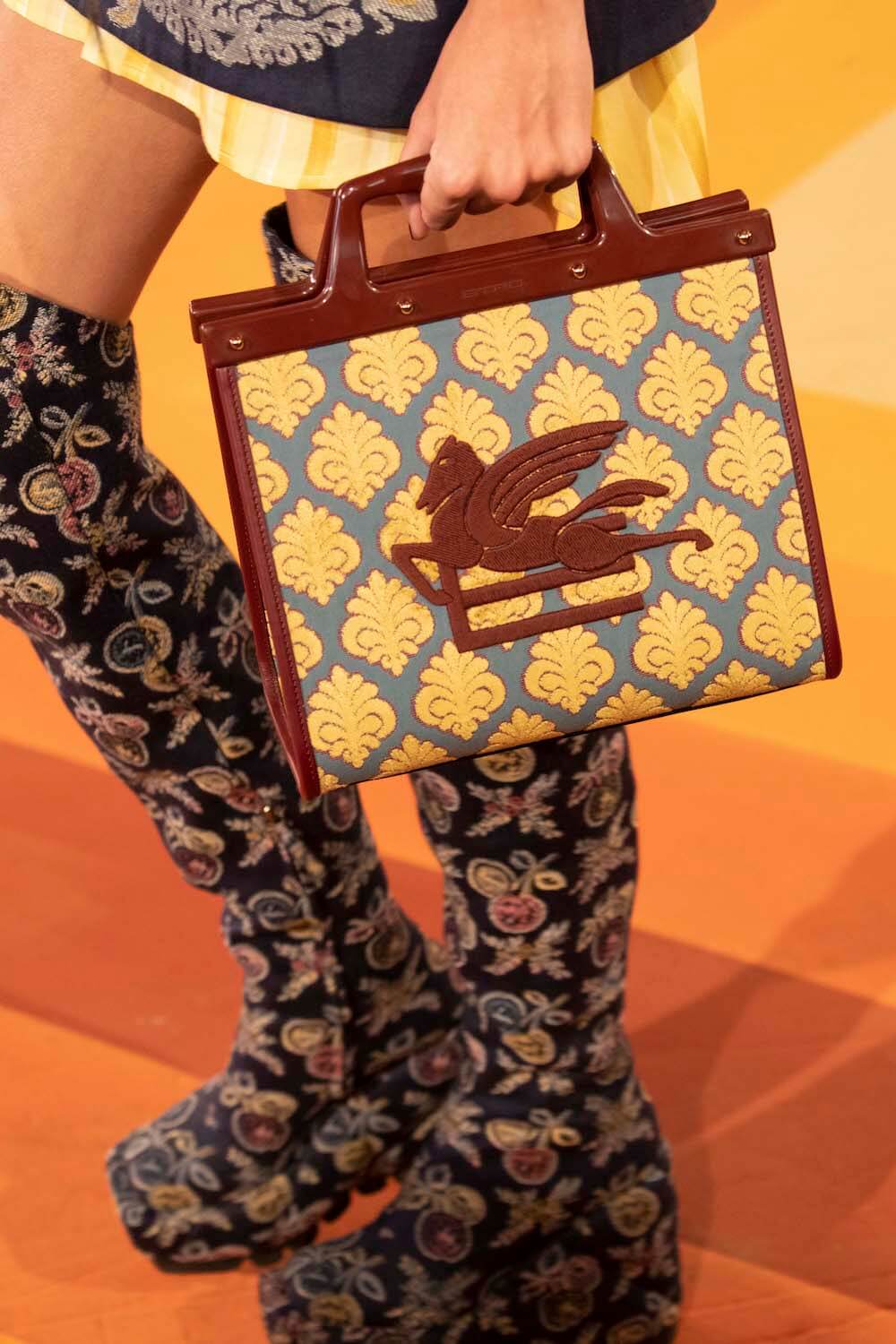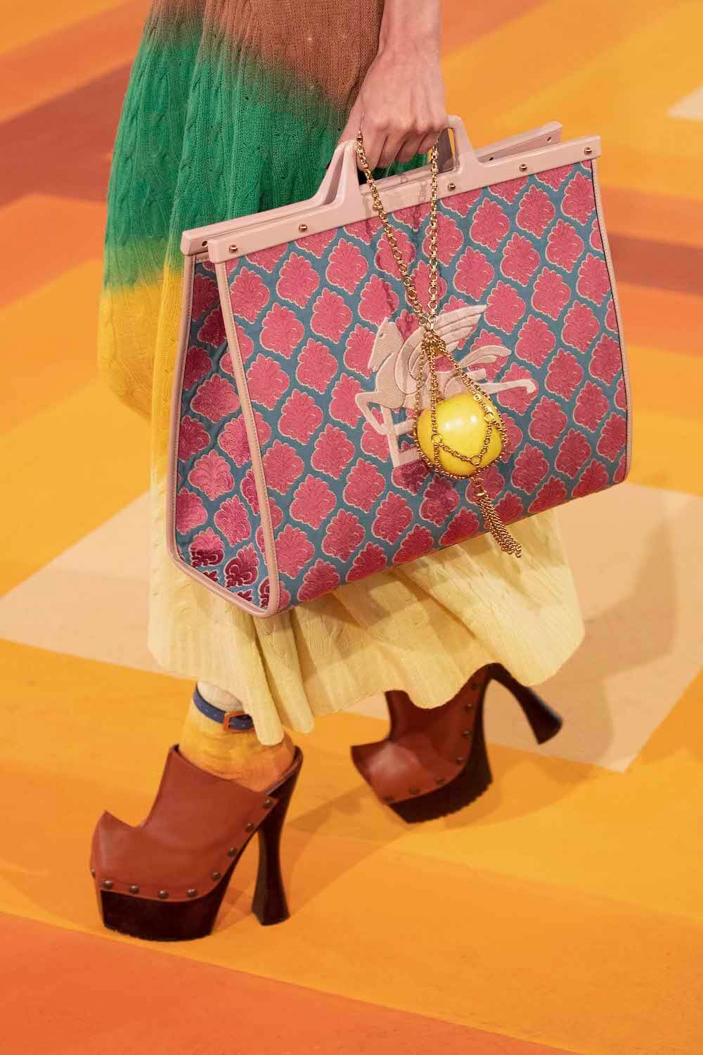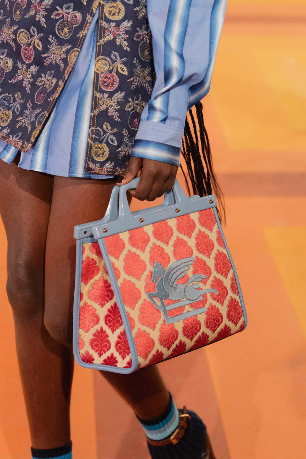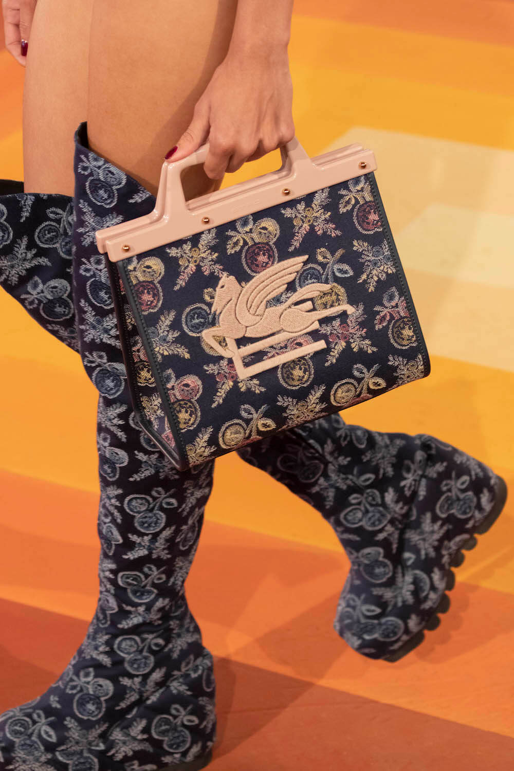 The premium fabrics that captivated De Vincenzo – some of which were from Etro’s home collections – dazzled with curling paisley prints and soft fern visuals, Little House on the Prairie vibes and irrefutable folk influences. Brimming with velveteen brocades and embroidered denims, twill, canvas and leather, it was all very sumptuous and very Etro – a more youthful interpretation of its iconic radically romantic, fringed gypsy look. But despite the malleable conviction of the bag, it boasts a sturdy frame rendered in colourful recycled plastics. The logoed handle and infrastructural boning together create a trapezoidal compartment.