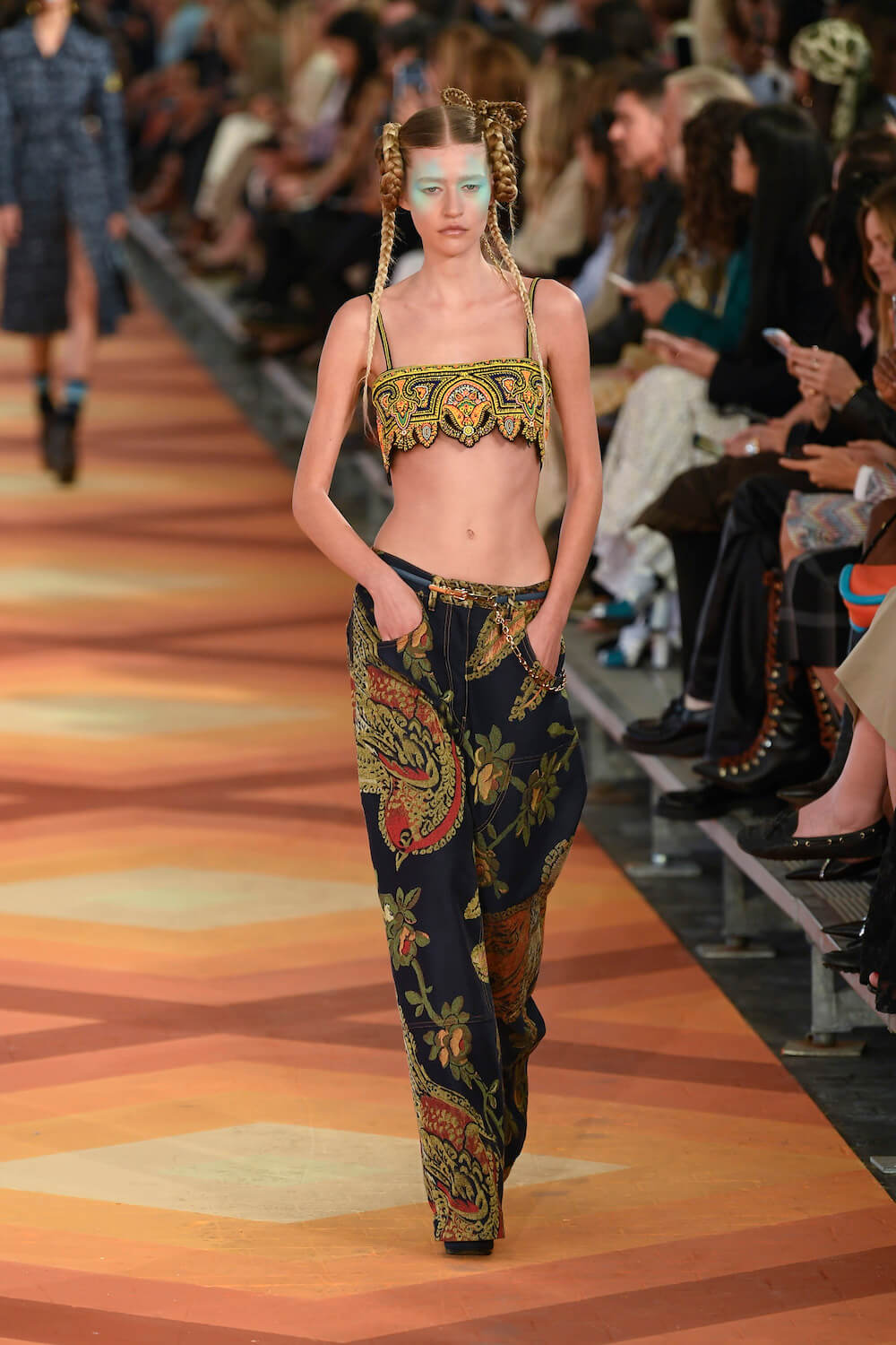 He opened with dazzling denim brocades featuring images of flowers, birds and exotic fruit. The fabric was sumptuous and very Etro whilst the silhouettes spoke to today. There were wide-legged low-cut jeans worn with matching bra tops, as well as denim hot pants, mini-dresses and a sweeping cape.
