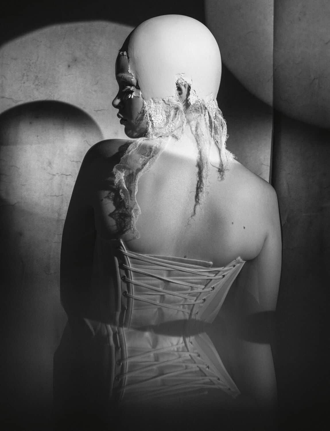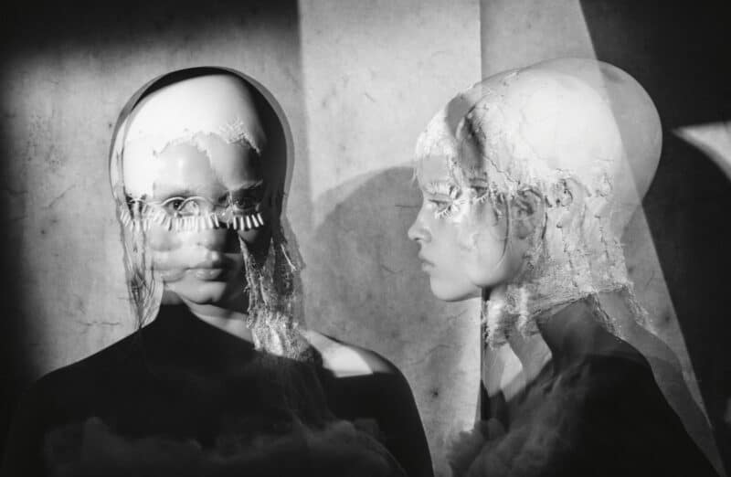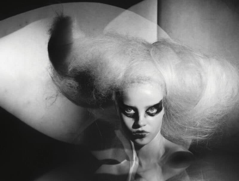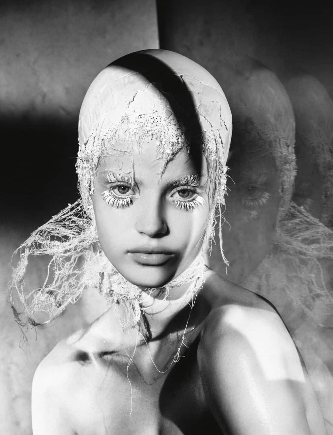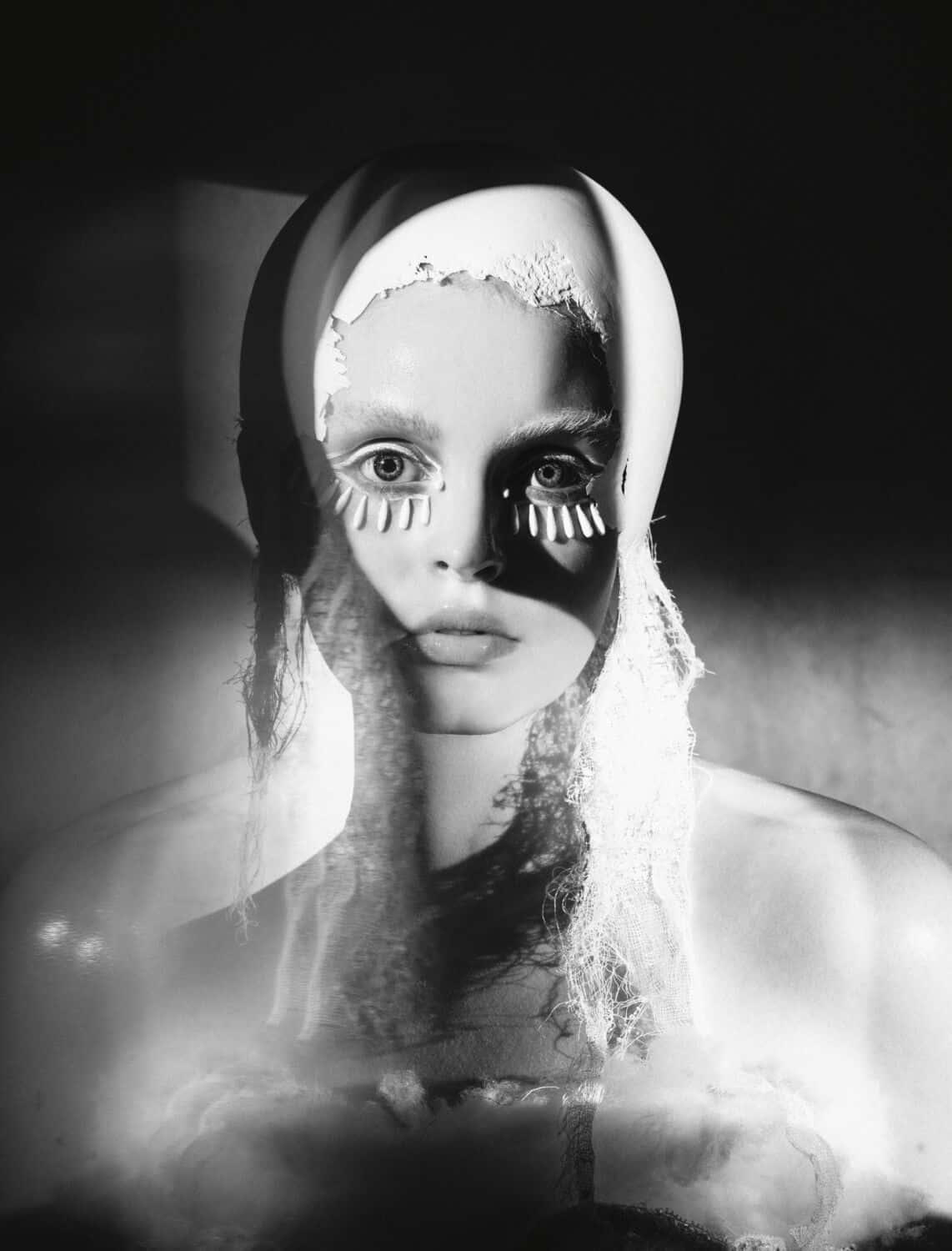 Did he have any specific references for these images, which look like a blend of unhinged Marie Antoinette meets The Handmaid’s Tale meets Sally Bowles on acid. “This story came from so many places,” he says, before reeling off a myriad of inspiration touchpoints: “Fellini films, art history, surrealism, dadaism, Westwood. It comes from everywhere and is just smashed together, so you pick up on influences, but it isn’t obvious. I like the idea of mixing things like technology with something that’s historical and playing with those dynamics.