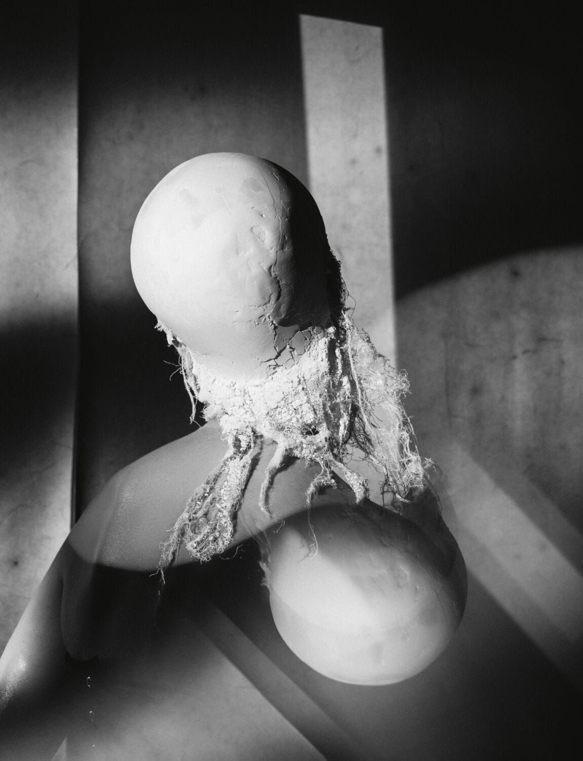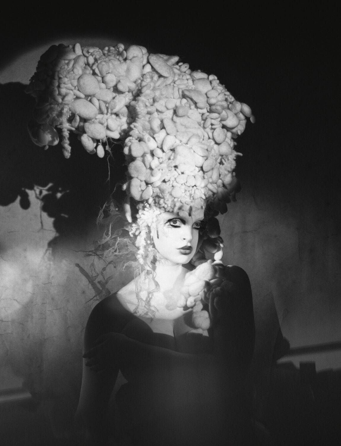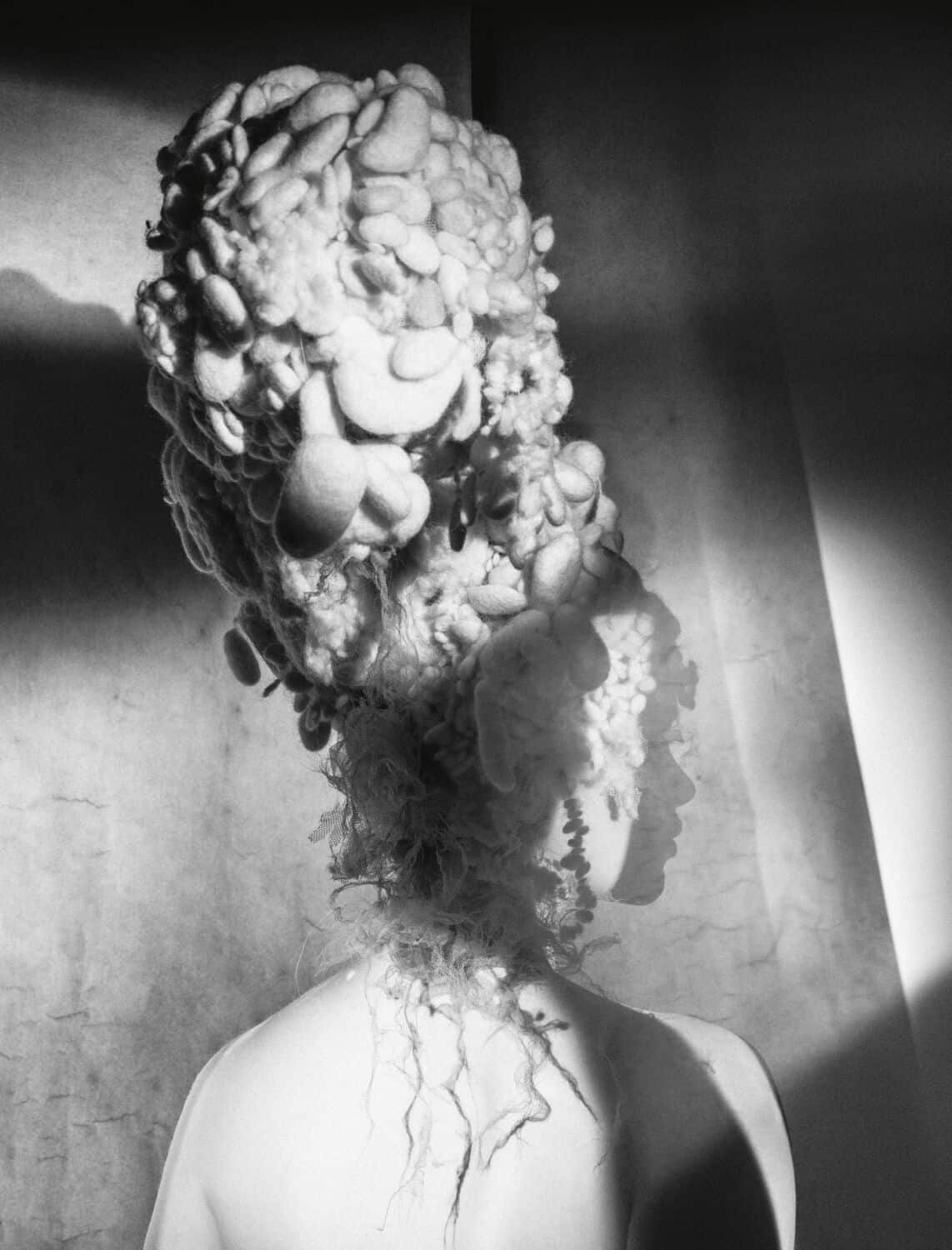 That tumble dryer was also put to good use for this shoot for those Marie Antoinette-ish wigs that look as though they’ve been crossed with collapsing piles of discarded wedding macarons from Miss Havisham’s house clearance. “That was a pure accident,” says Souleiman. “It was me spilling an espresso on a wool-filled cushion and I washed and then tumble-dried it, but it wasn’t dry, so I kept shoving it back in the dryer. After about eight goes, I opened up the pillow and it was full of all those balls. It was a mistake, but straight away I thought, they need to go on someone’s head. The lightbulb went off. I work in an unusual way, I’m never specific or intentional about what I want to do. The ideas come to me through situations and not the trend this season. I don’t do that. Never have, never will. My vision comes from feeling.”
