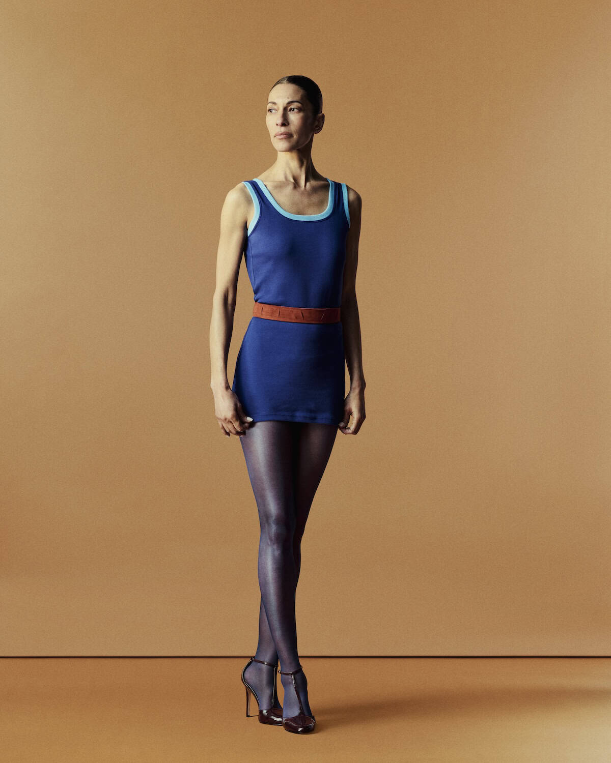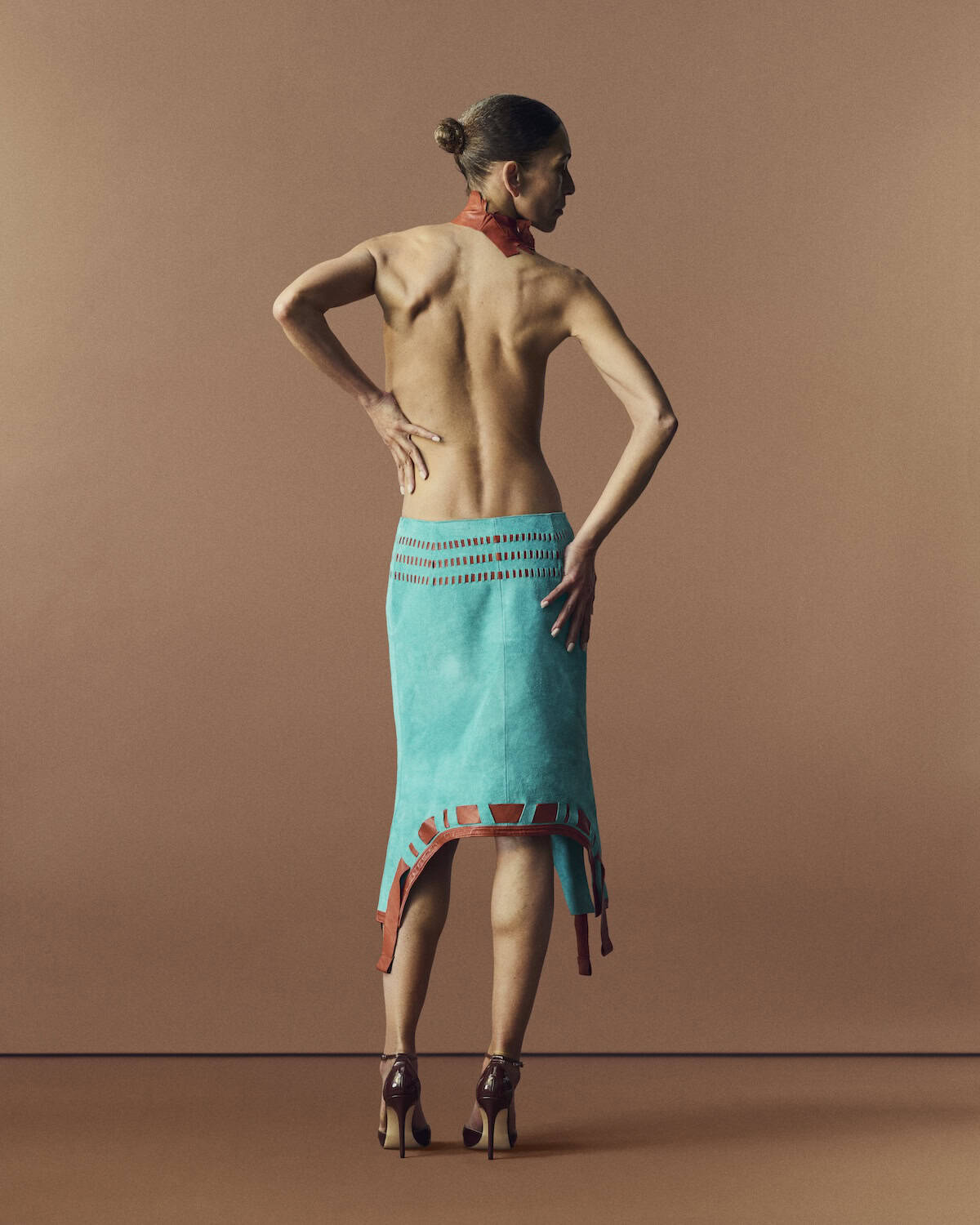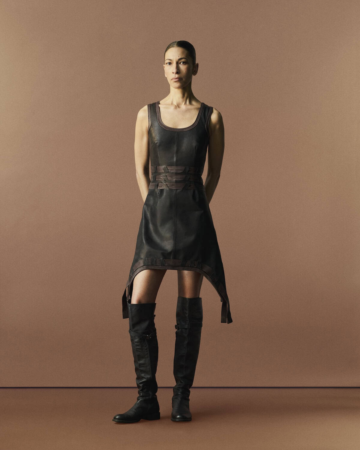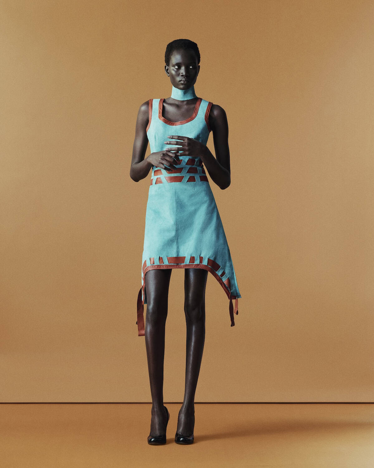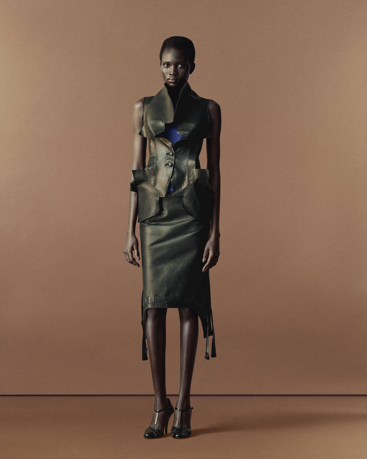 The collection reworked those found pieces with precision. A midi skirt was cut to a mini; a simple vest strap was rebound in leather; wool panels were fused with leather to create compact, sculpted shapes. The hybridity felt lived-in rather than staged – sharp tailoring offset by bold print, structure softened by memory.