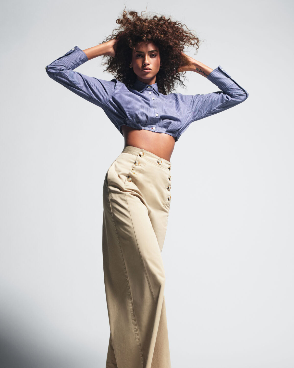 After versions of Anne Hathaway’s white shirtdress and Timothée Chalamet’s denim look sold out within hours of their release, GapStudio is finally coming out with a full fledged collection. Aptly titled Collection01 and designed by Zac Posen, the brand has returned to iconic American sportswear at its finest. From bloomer shorts worn with blazers to cropped corset tanks to easy slip dresses to naturally, plenty of denim, it’s what Gap does best, albeit elevated with tailoring and luxe fabrics. Highlights include the denim trench, newer versions of Hathaway’s shirtdress, as well as high-waisted sailor-style jeans. To accompany the release comes a campaign shot by Mario Sorrenti and styled by Alastair McKimm, starring Alex Consani, Imaan Hamman, and Anok Yai. Shop it now online.