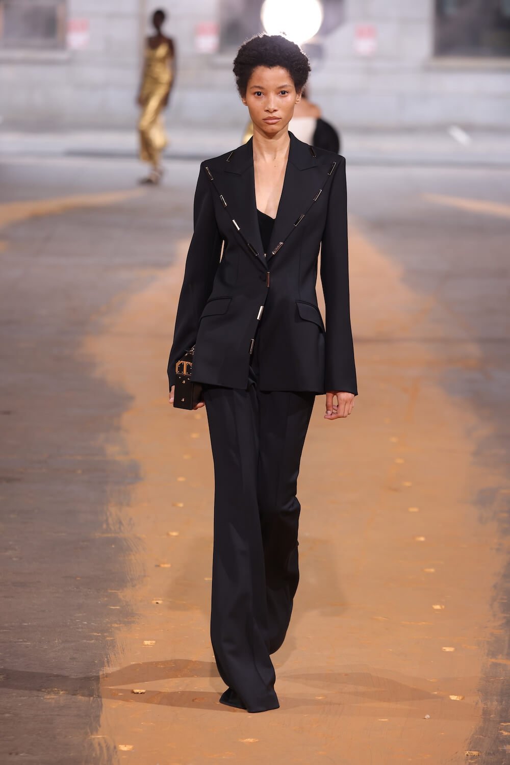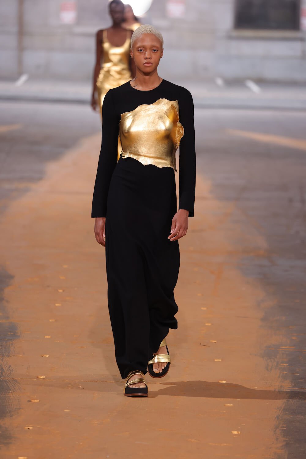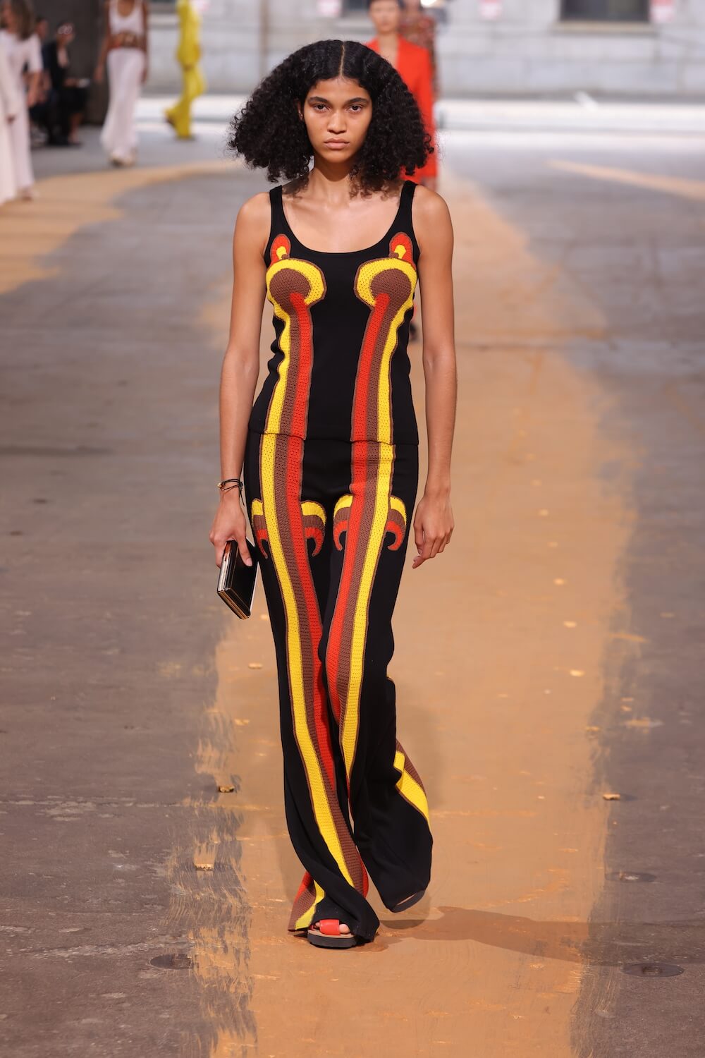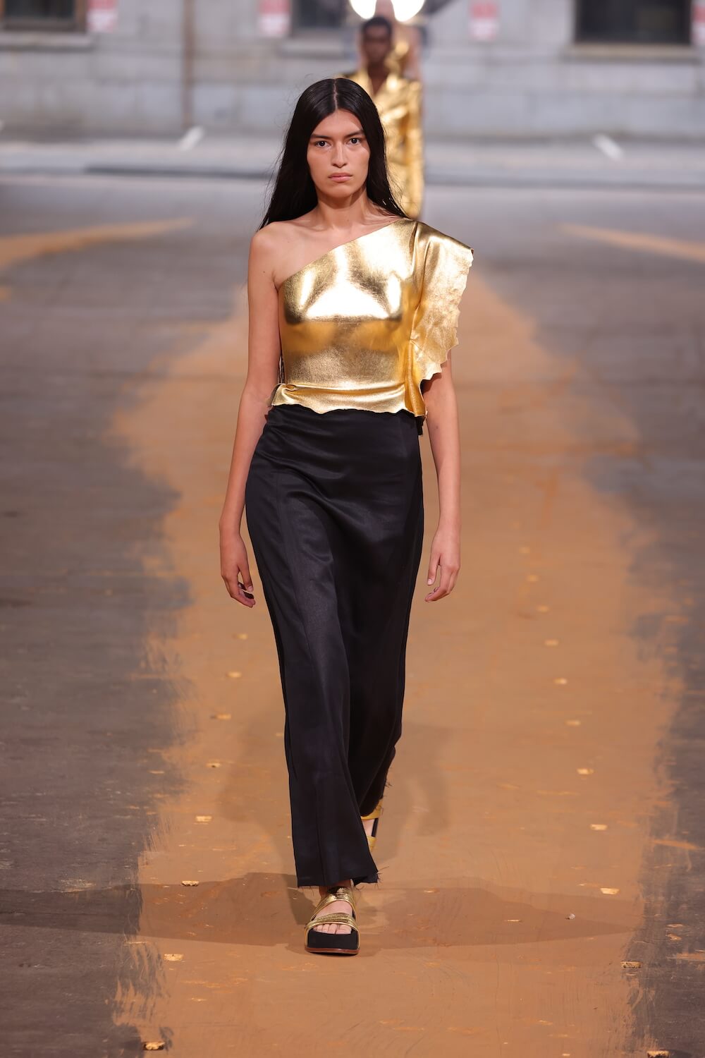 Opening with an array of black jersey gowns fixed with contoured gold nappa on raw-edge vachetta leather, slithering open spaces that permeated silk ladder-stitch knit dresses and frocks printed with ionic greek-columns, Gabriela Hearst’s latest edit immediately felt very Athena, Goddess of wisdom and war – except it wasn’t, it was Sappho. Sappho was an Ancient Greek poet who not only composed nine books but also shed light on our incompatible relationship with the Earth as well as women’s hardships and sexual preferences, wielding her words like a culture-disrupting weapon way before it was cool.