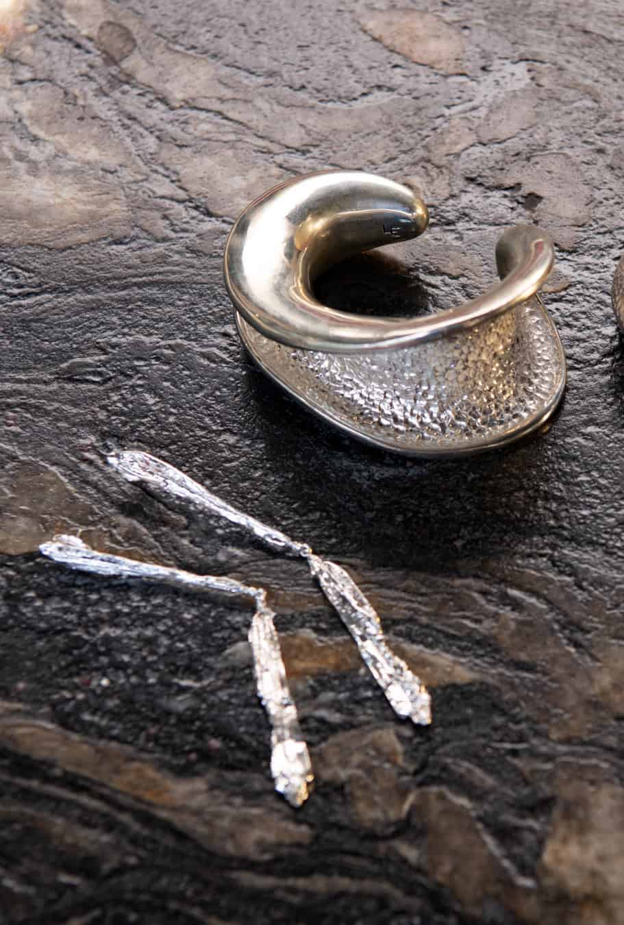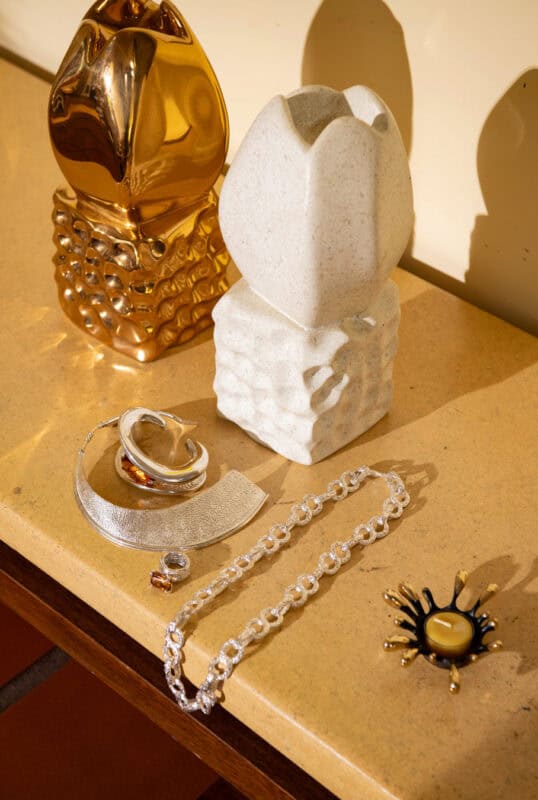 from left: Silver Foil and Citrine Wave Cuff in sterling silver with citrine, Silver Foil Collar in sterling silver, Silver Foil and Citrine Ring in sterling silver with citrine, and Silver Foil Chain Necklace in sterling silver by LISA EISNER JEWELRY, made exclusively for THE ROW, Splash Votive in bronze by LISA EISNER JEWELRY