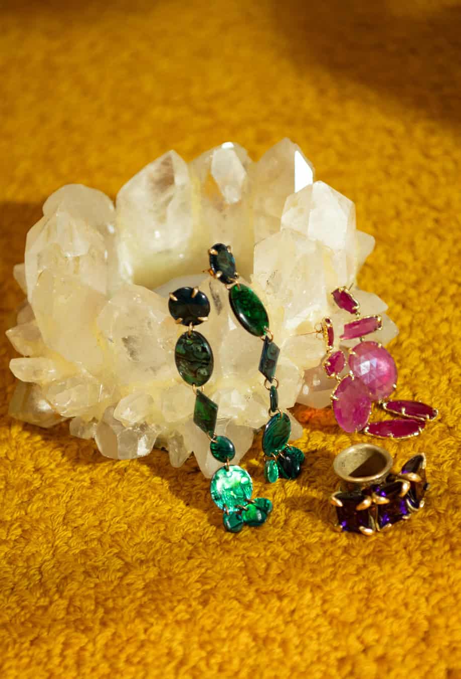 from left: Green Abalone Earrings with fringe bronze, gold-filled post and dyed abalone, The Pink Moment Earring in 18k gold with ruby and Snow Feather Ring in bronze with amethyst by LISA EISNER JEWELRY