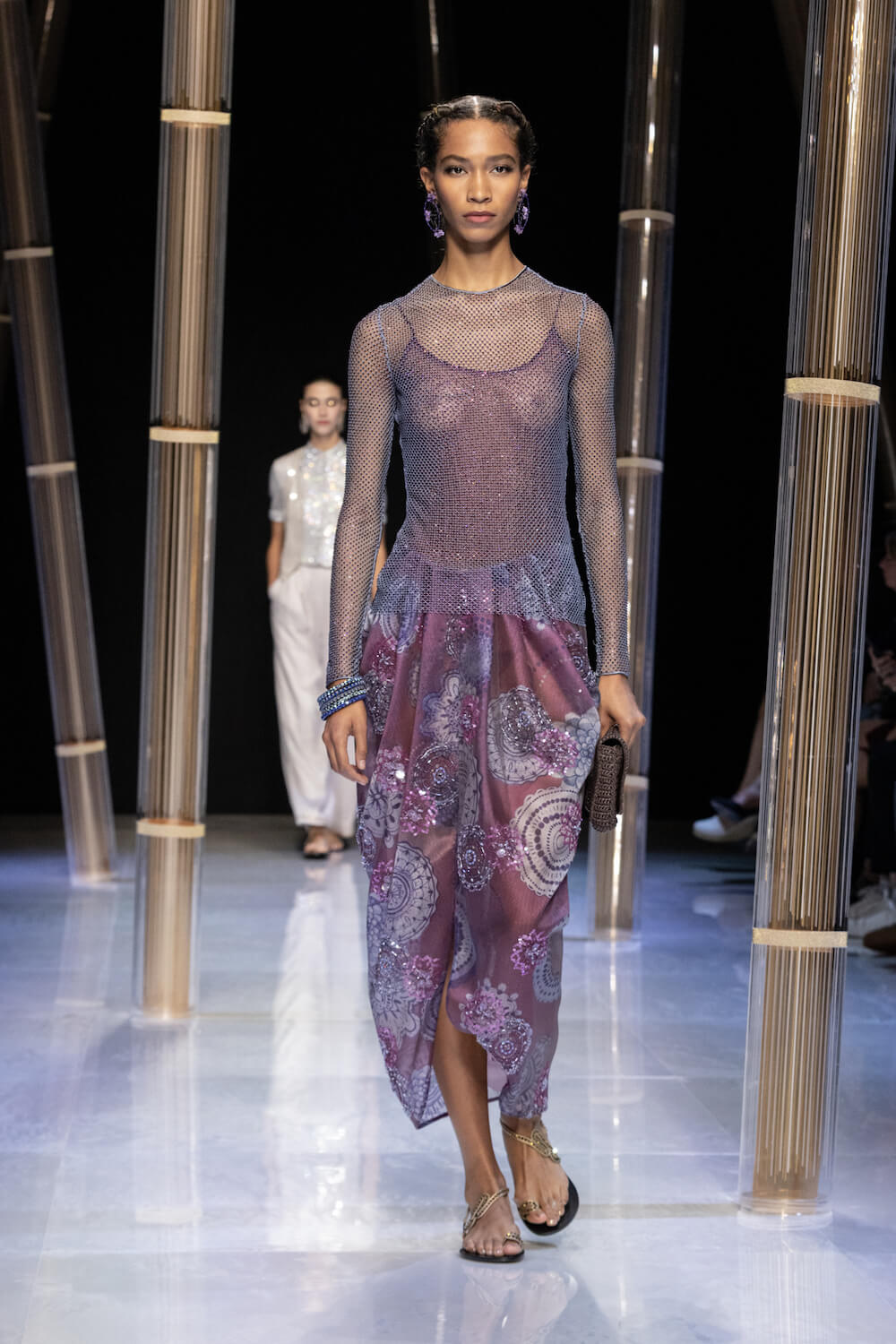Cardigans were cropped with flashes of sparkles sprinkled, amethyst purple and ink blue dresses were so fine and sheer they appeared suspended in the air, and a sense of tranquility was felt on embroidered leaves and blossoming flowers. The show felt like a meditation to the audience (which included Lauren Hutton, Irina Shayk and Cate Blanchett) – and meditating in Armani silk satin is our kind of mindfulness. The final eight women stopped in their tracks for the finale, each wearing variations of desert-sand inspired champagne gowns that glimmered slightly golden in the light, crystals and sequins twinkling. The show solidified the trends we’d been seeing in Milan: cropped jackets are cool again, sequins and sparkles are being seriously celebrated and embroidered flowers are blooming everywhere.