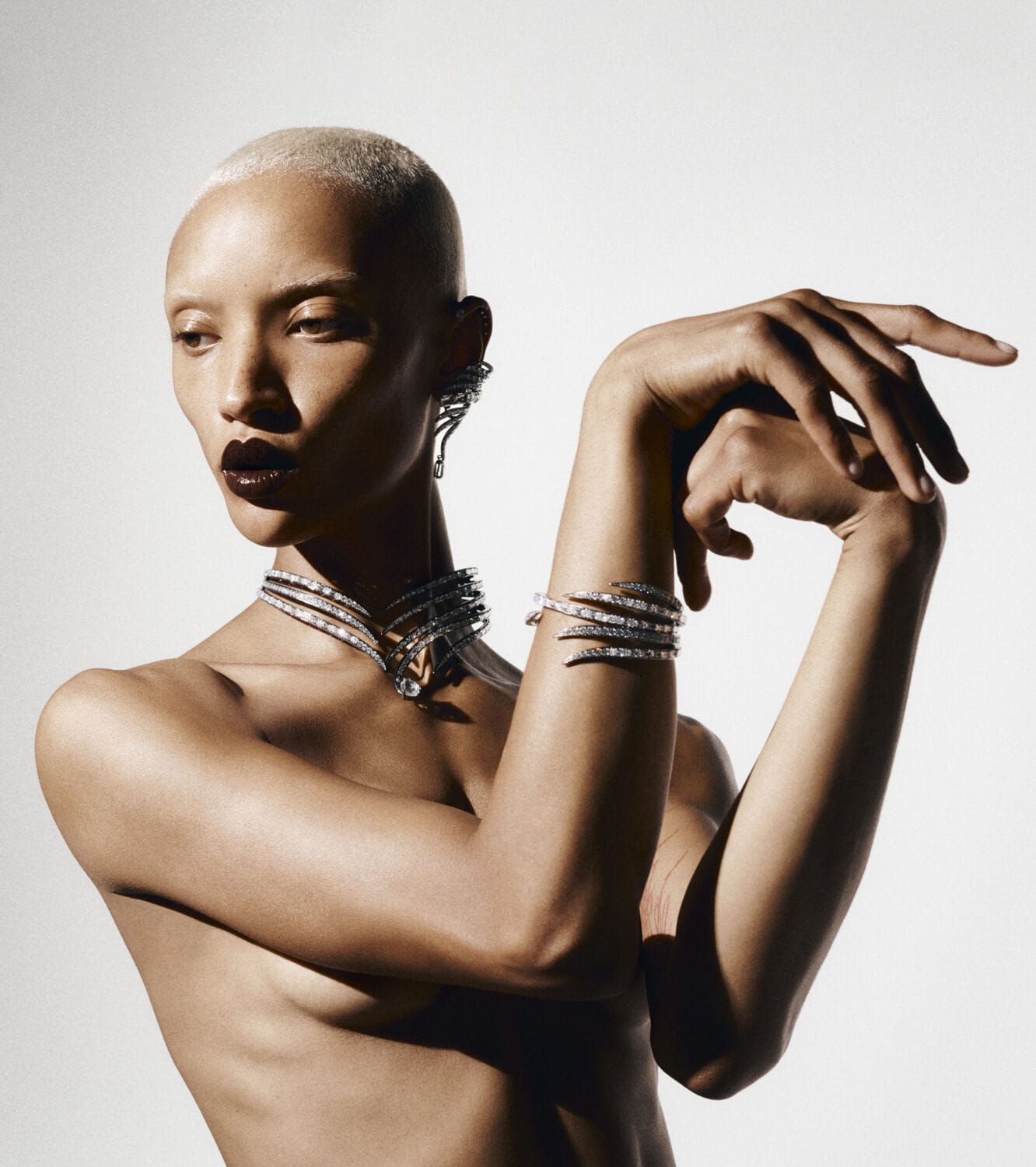 from left: Sublima earrings and chokers in rhodium-plated crystals by SWAROVSKI; Idyllia Snowflake body piece in crystals by SWAROVSKI
