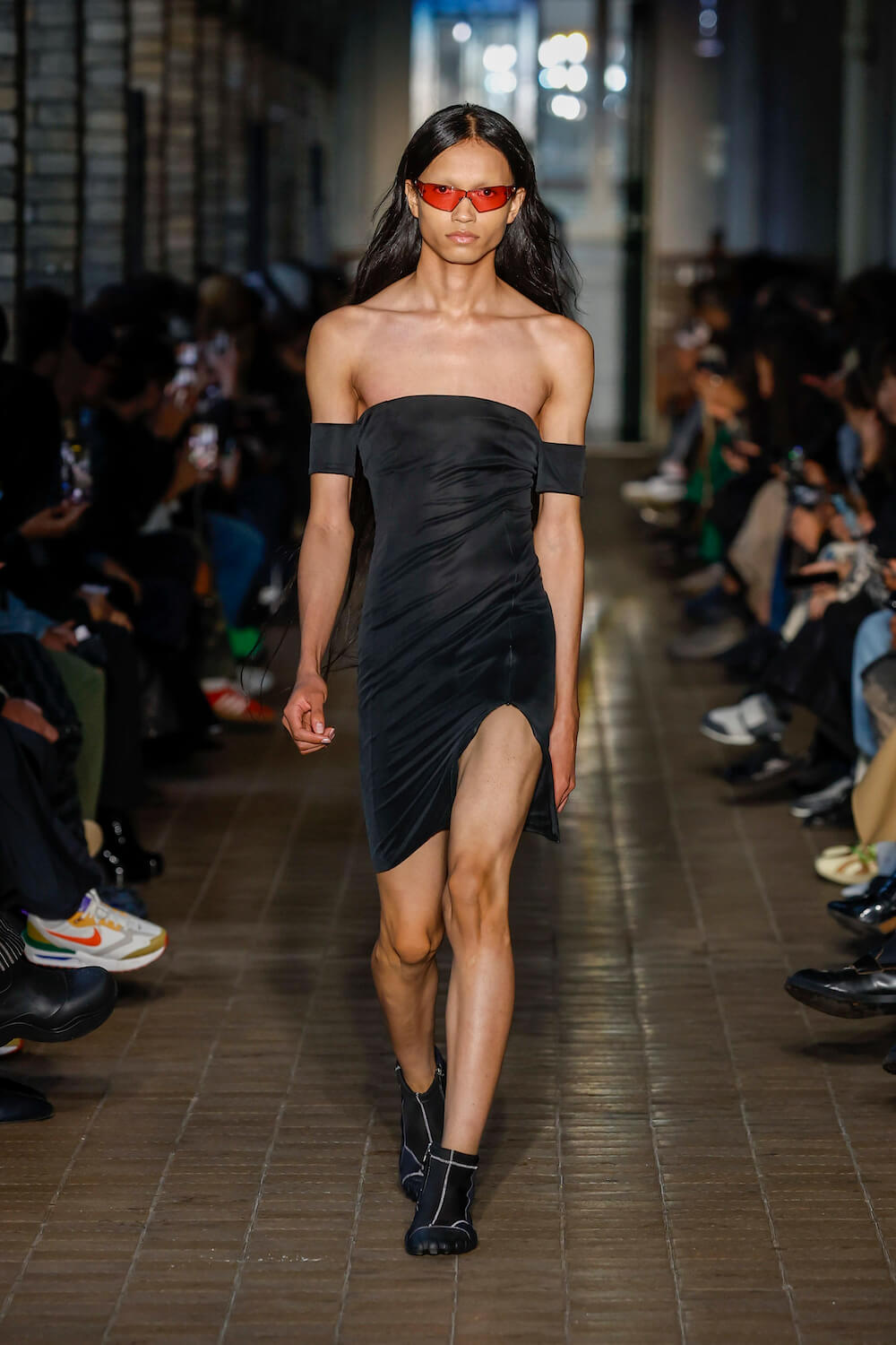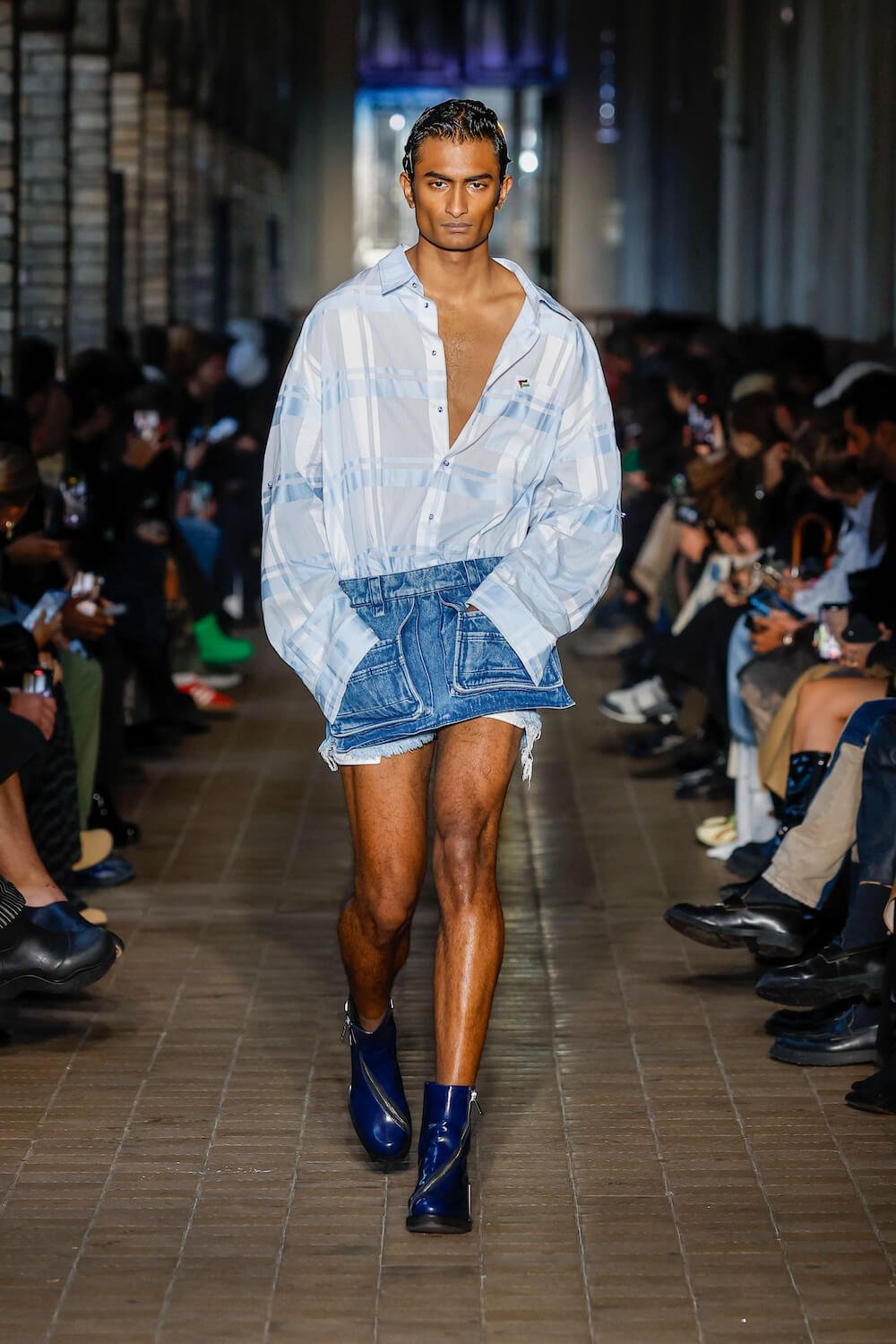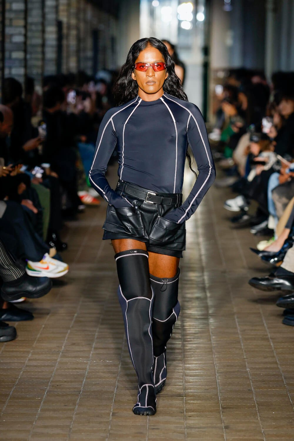 This was also the first time in GmbH’s six year lifespan that the design duo focused on fleshing out a woman’s wardrobe. Skin-tight sheer dresses and criss-cross cropped tops arose in baby blue, black, white and metallic gold hues while baggy thigh-high boots paired with utilitarian hot pants were added to our wish lists. The men’s looks were plentiful as always, surfacing with sport and scuba citations while gender fluidity fed into the collection like a fjord to the sea.