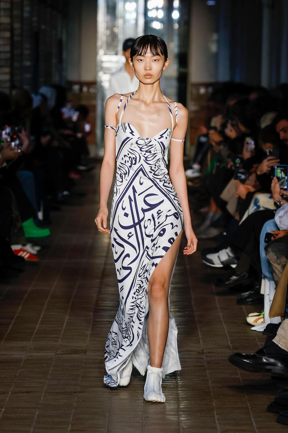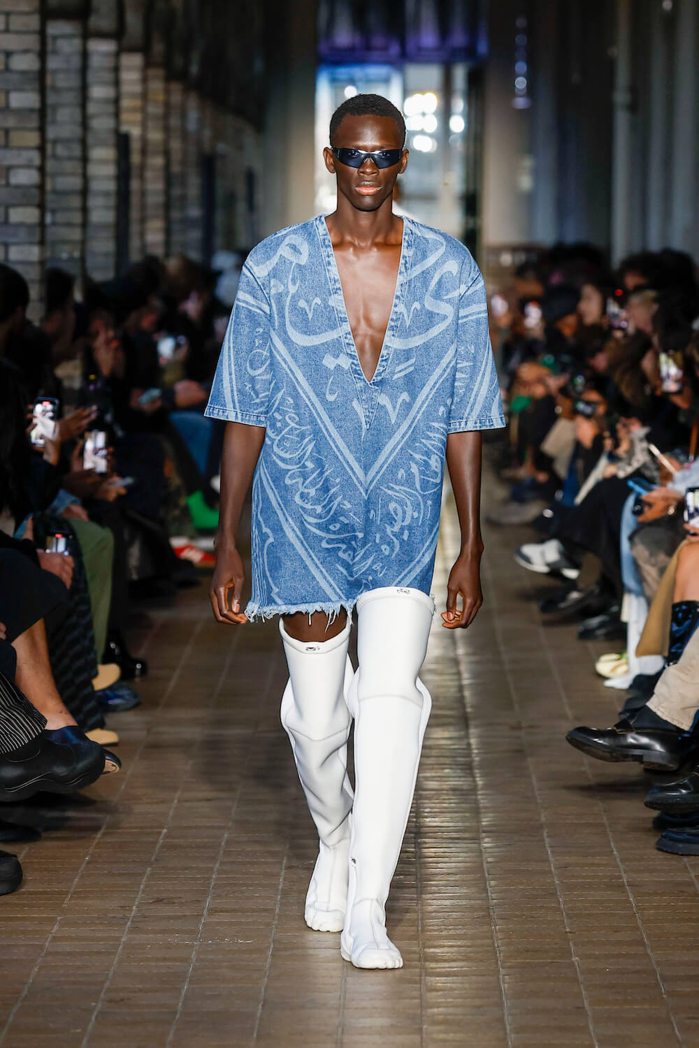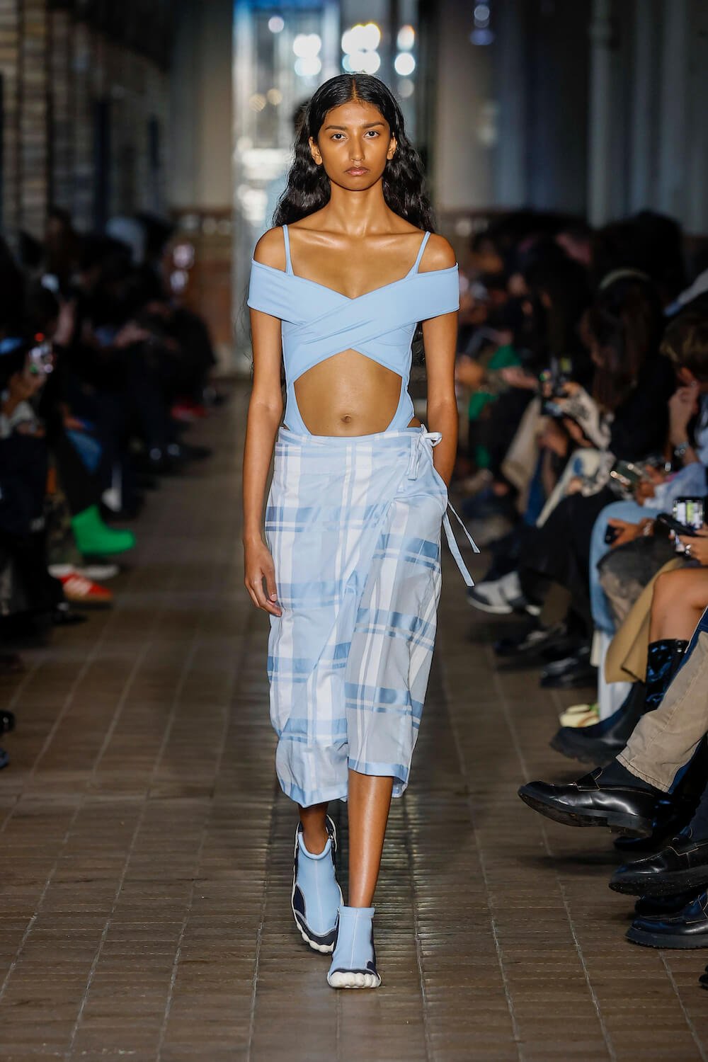 This was also the first time in GmbH’s six year lifespan that the design duo focused on fleshing out a woman’s wardrobe. Skin-tight sheer dresses and criss-cross cropped tops arose in baby blue, black, white and metallic gold hues while baggy thigh-high boots paired with utilitarian hot pants were added to our wish lists. The men’s looks were plentiful as always, surfacing with sport and scuba citations while gender fluidity fed into the collection like a fjord to the sea.