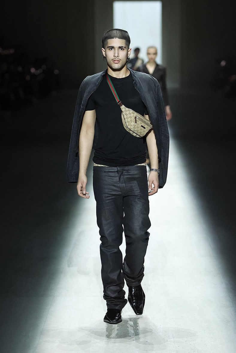 The runway cast reinforced Demna’s vision of Gucci as a cultural touchpoint. Gabriette wore a bodycon stretch lace sequined minidress and sky-high patent leather platform mules, while Emily Ratajkowski appeared in a sparkling mini and stilettos. Alex Consani and Mariacarla Boscono brought their own energy to the tight, body-revealing garments, and underground rappers Nettspend and fakemink added an unexpected twist—the latter stopping halfway down the runway to check his phone, scrolling for a beat before continuing his walk.