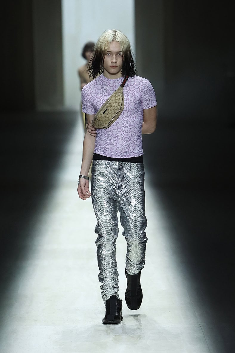 Accessories dominated, as expected from Gucci’s bread-and-butter business. The signature Bamboo 1947 bag got a sleeker update with a handle made of flexible leather sections, while archival minaudières were stretched to fit modern essentials. The new Manhattan sneaker combined basketball shapes with slip-on ease.