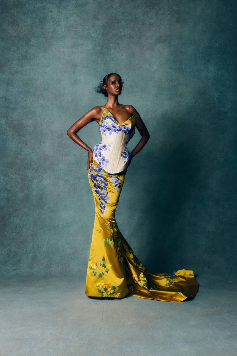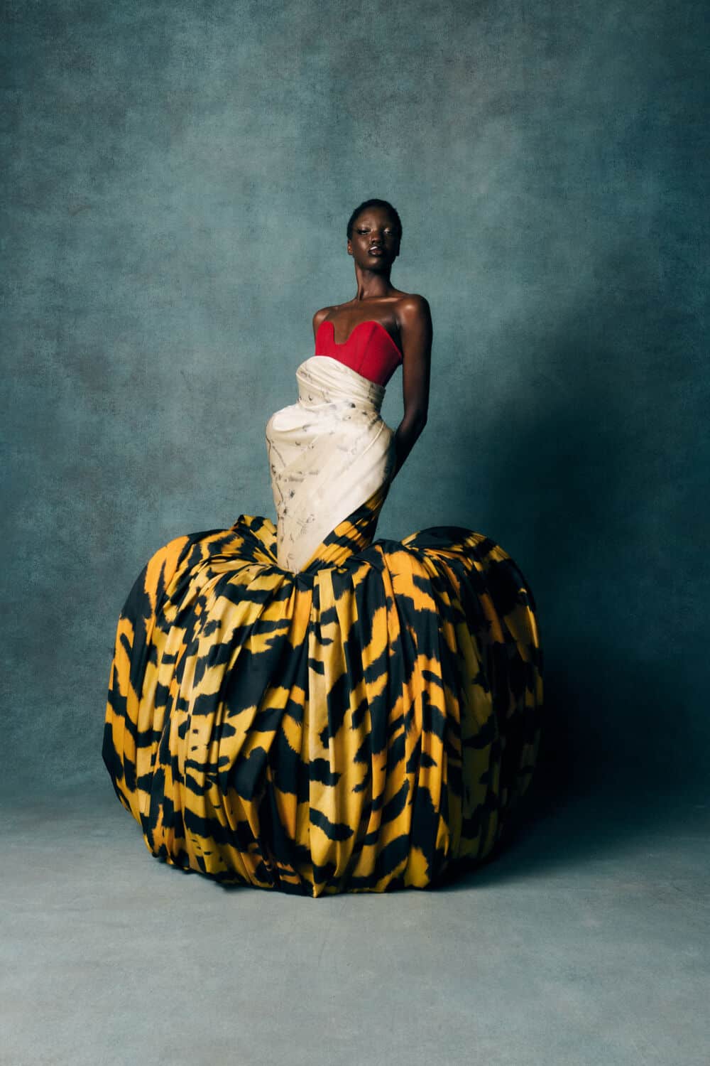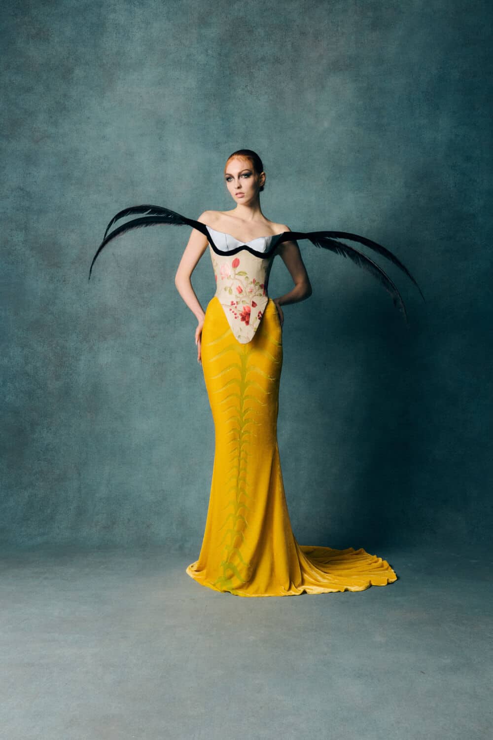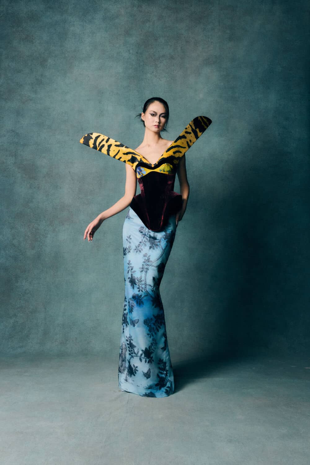 Reed also leaned into a fascination with contrasts – containment and freedom, rigidity and release – echoing The Aviary’s cage-like silhouettes set against wing-like extensions. Fabrics created with Fromental added further richness: duchess satins painted with wisteria, tortoiseshell and tiger motifs hand-rendered onto silk and velvets treated to gleam or bruise under shifting light.