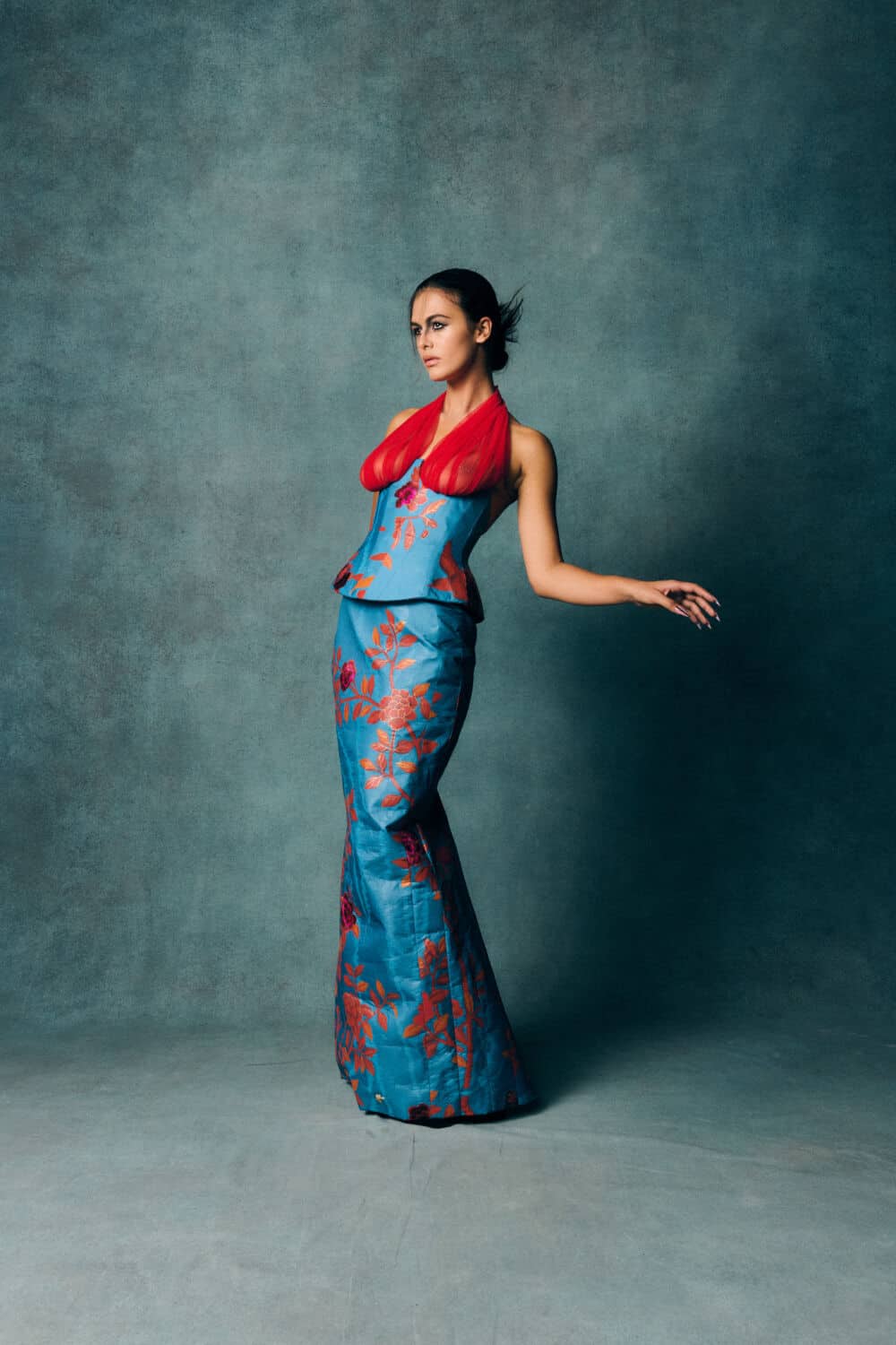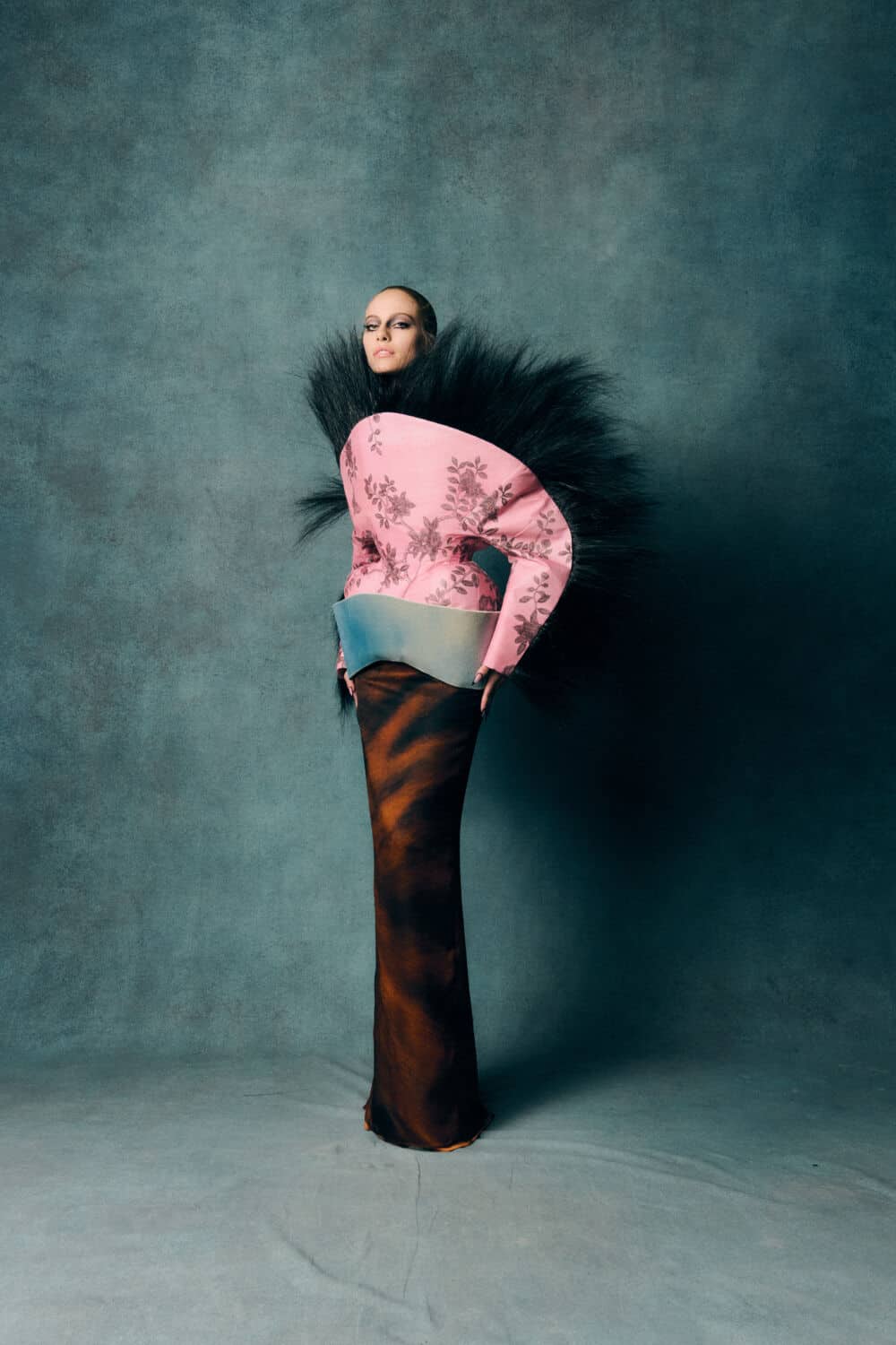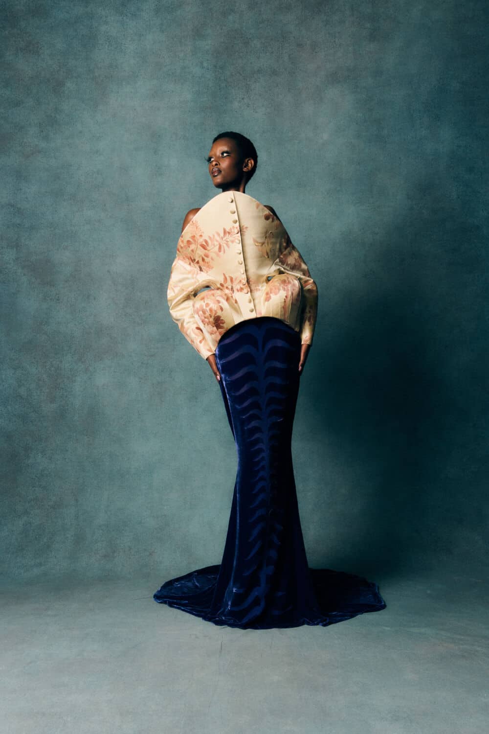 Reed also leaned into a fascination with contrasts – containment and freedom, rigidity and release – echoing The Aviary’s cage-like silhouettes set against wing-like extensions. Fabrics created with Fromental added further richness: duchess satins painted with wisteria, tortoiseshell and tiger motifs hand-rendered onto silk and velvets treated to gleam or bruise under shifting light.