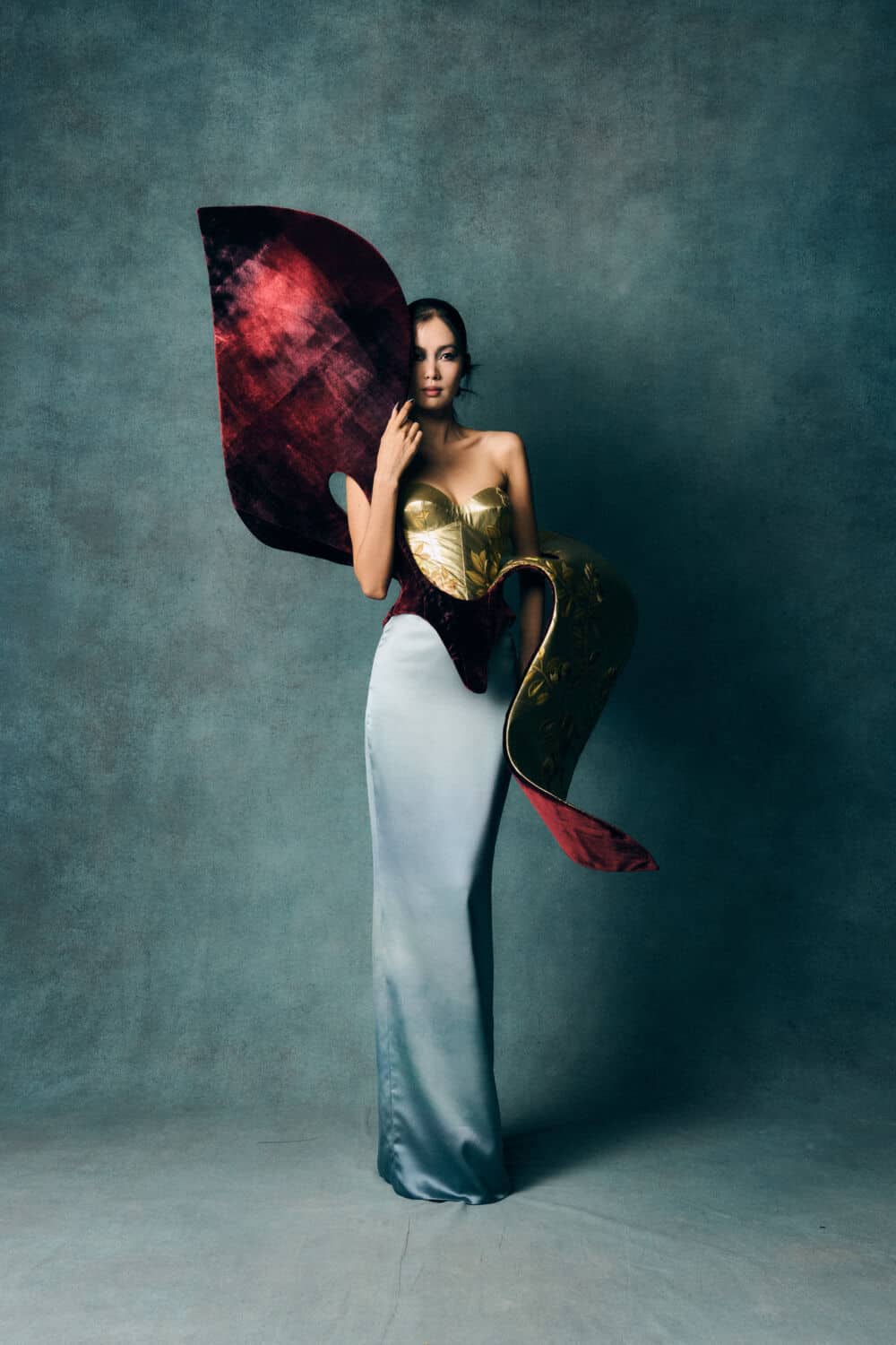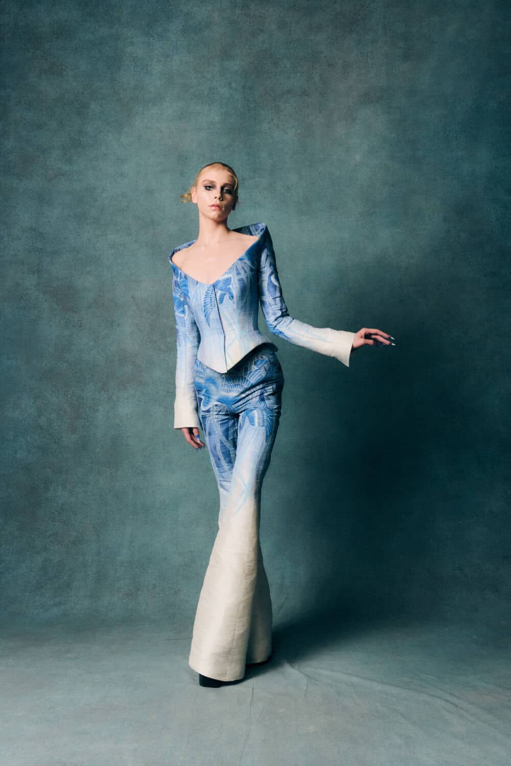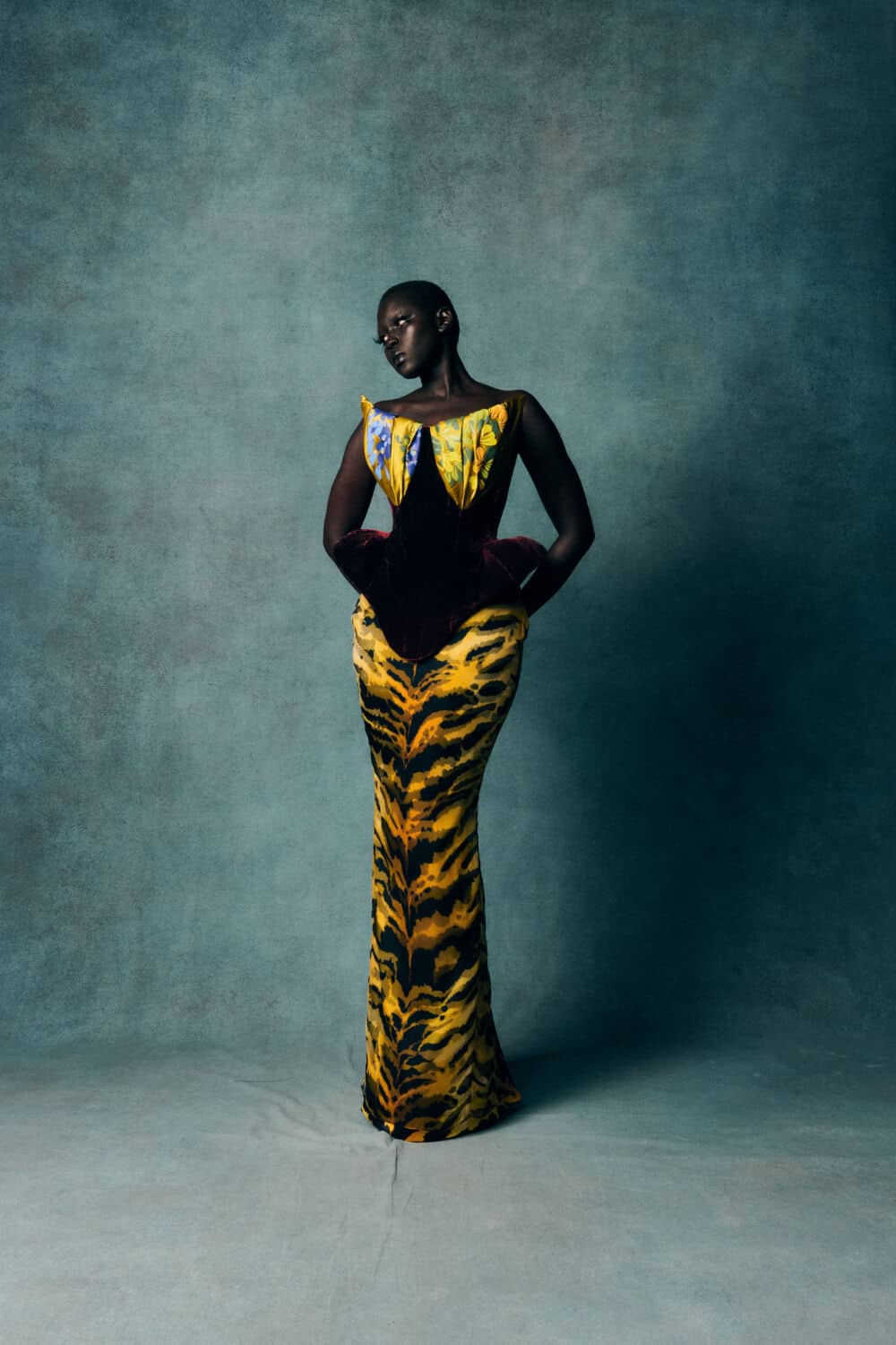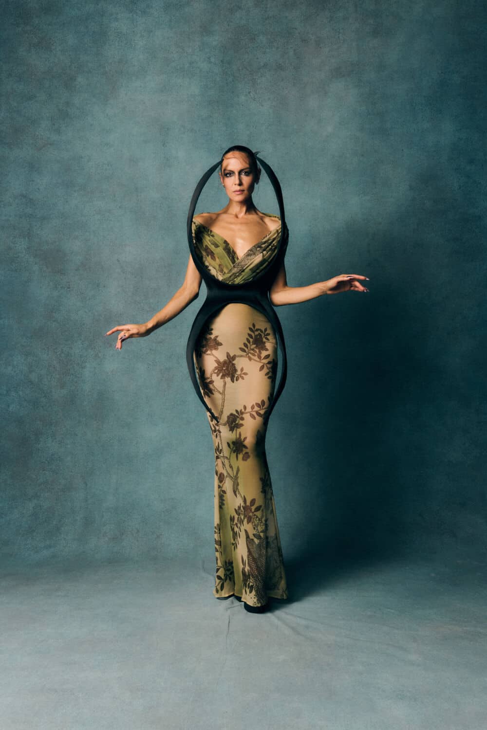 Reed also leaned into a fascination with contrasts – containment and freedom, rigidity and release – echoing The Aviary’s cage-like silhouettes set against wing-like extensions. Fabrics created with Fromental added further richness: duchess satins painted with wisteria, tortoiseshell and tiger motifs hand-rendered onto silk and velvets treated to gleam or bruise under shifting light.
