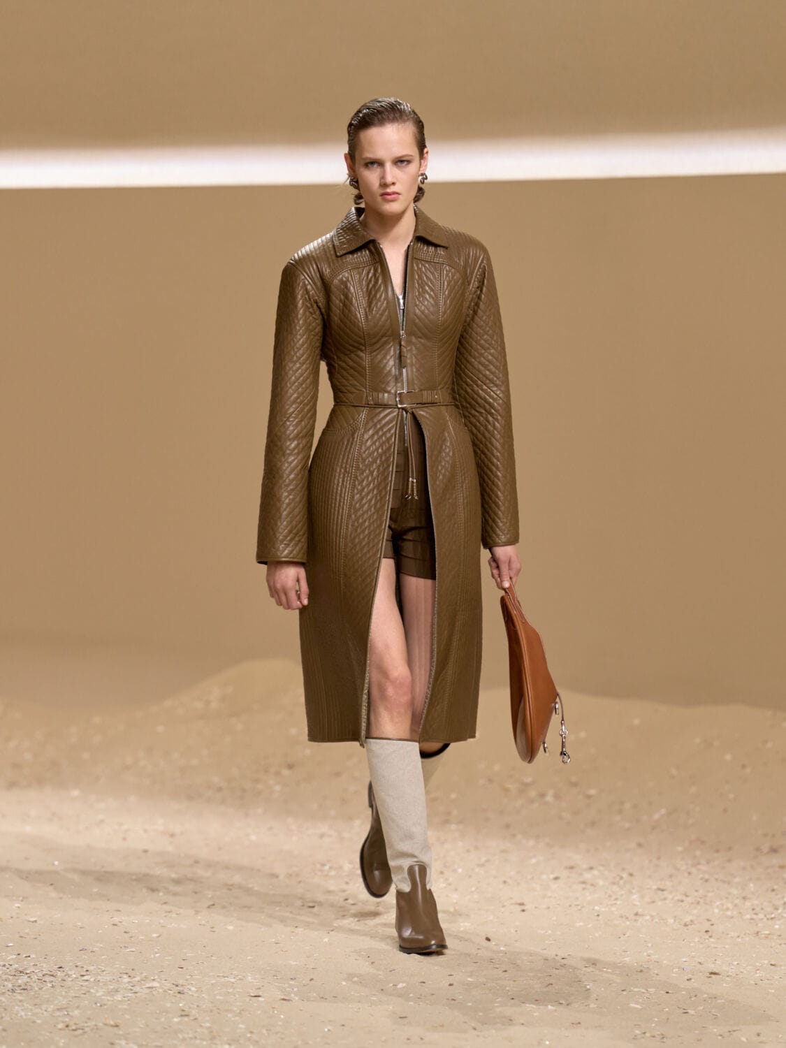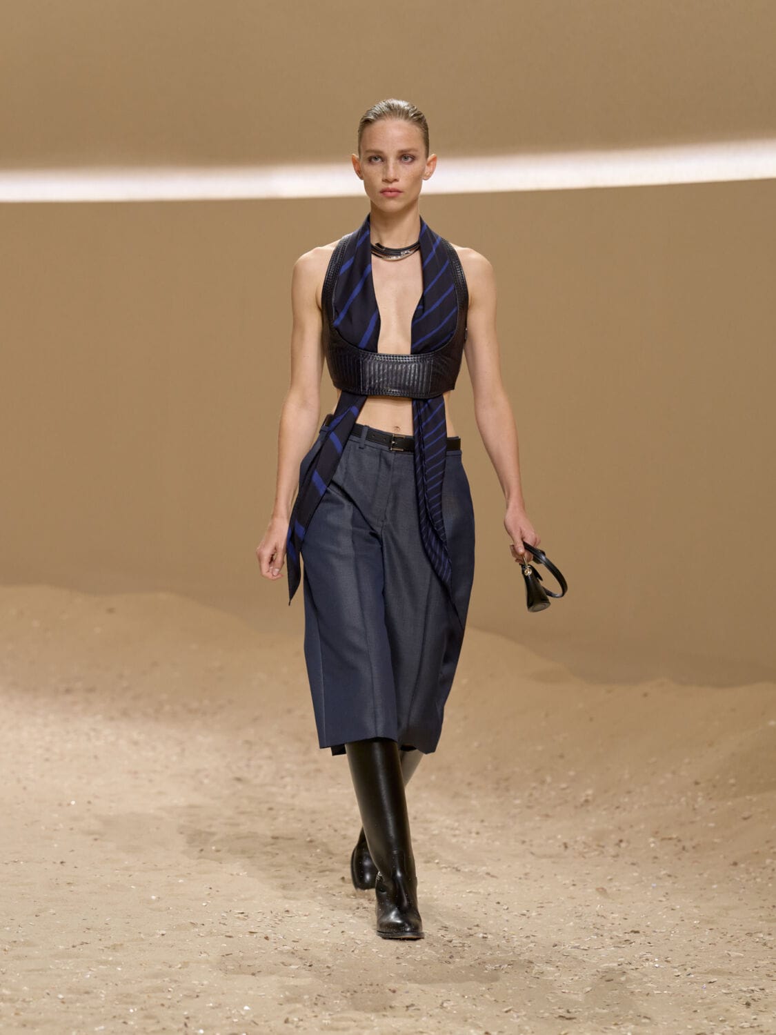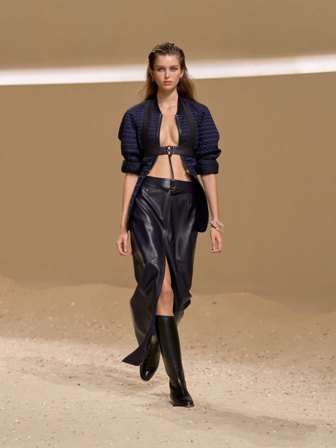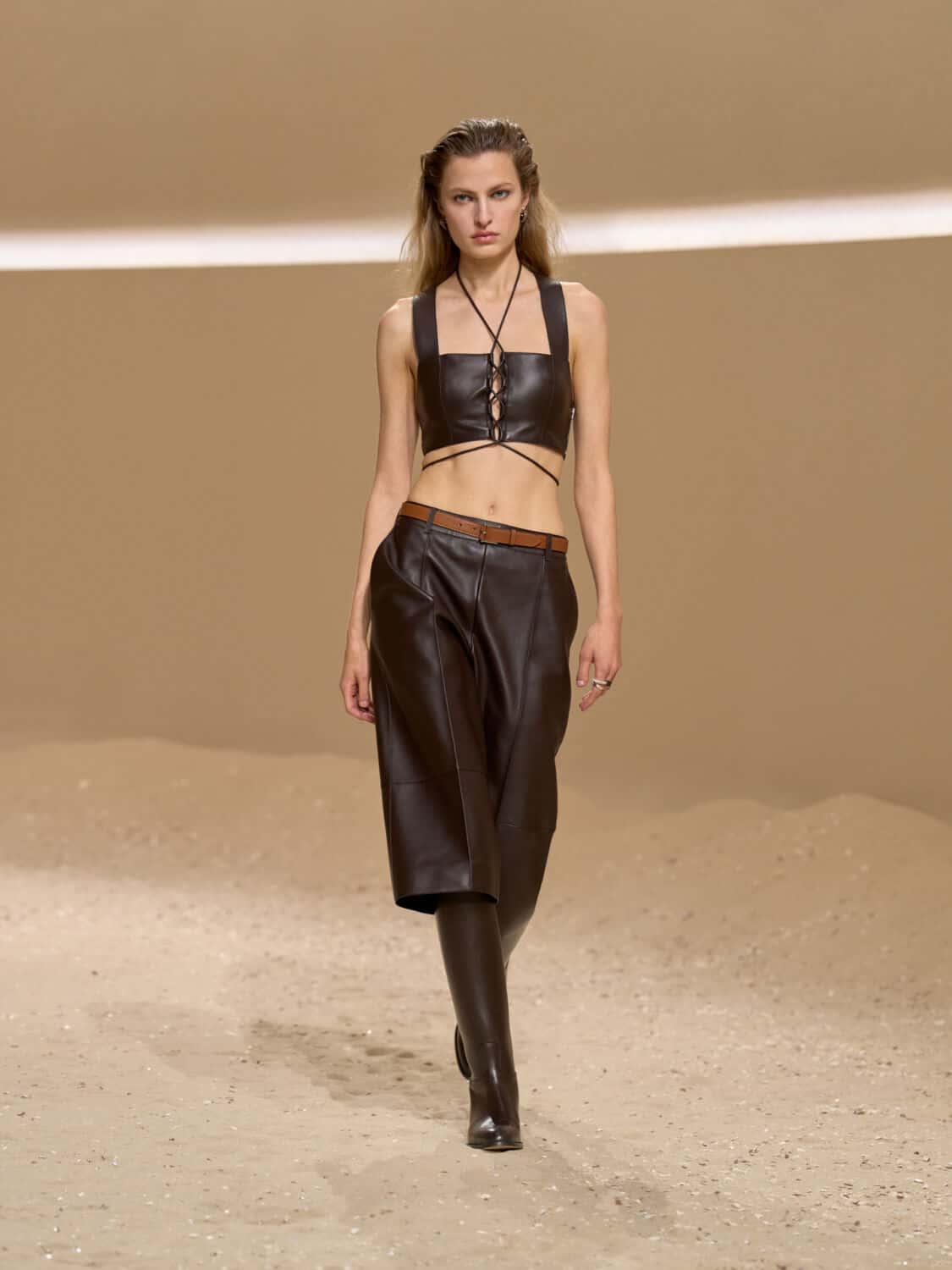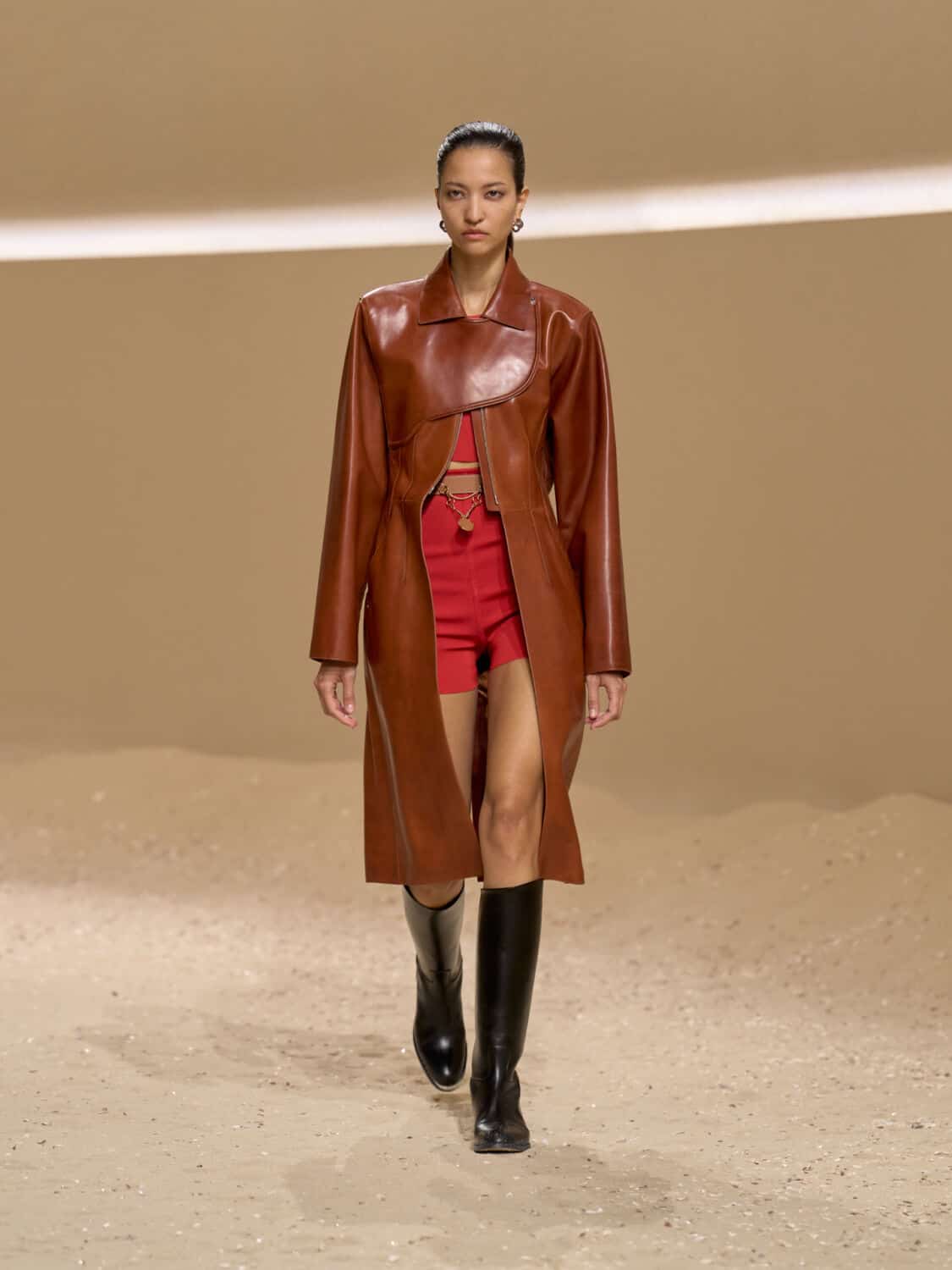 Titled “Free Rein”, the show notes envisioned a horsewoman set loose — she’s emancipated and empowered. Vanhee said she was inspired by Camargue, a region in the south of France known for their brine lagoons and marshland and home to Camargue horses, who roam through the land. A saddle from the region is in the Hermès archives, making it the perfect starting point to build out the collection, with its elements like the troussequin backrest or the straps and buckles broken down and reimagined for modern day dressing. It’s evident from the opening look as the designer transforms leather straps into a harness that swoops across the bust, accentuating the chest. Worn over low slung leather shorts and topped off with a sweeping trench, it’s easy to imagine this mythical woman casually dismounting off her wild mount, much to the awe of those around her.