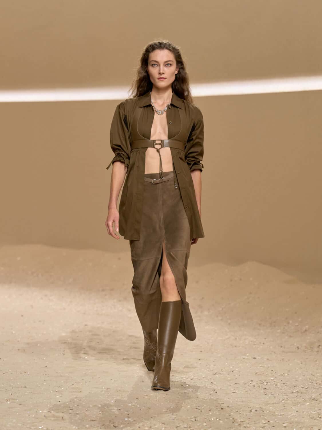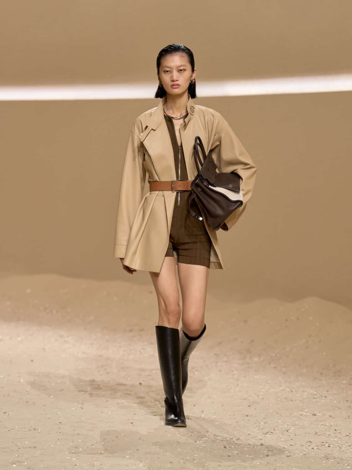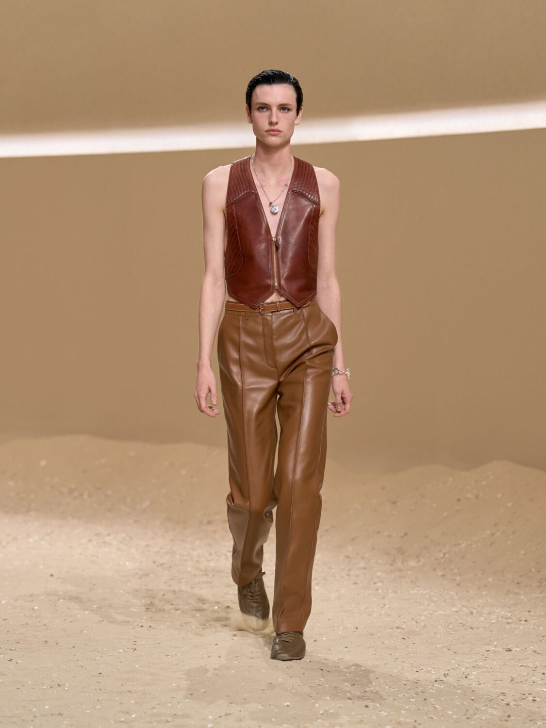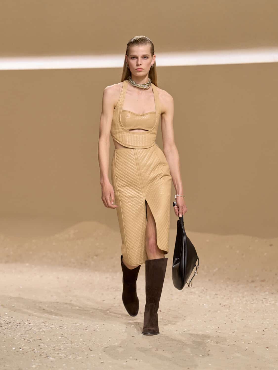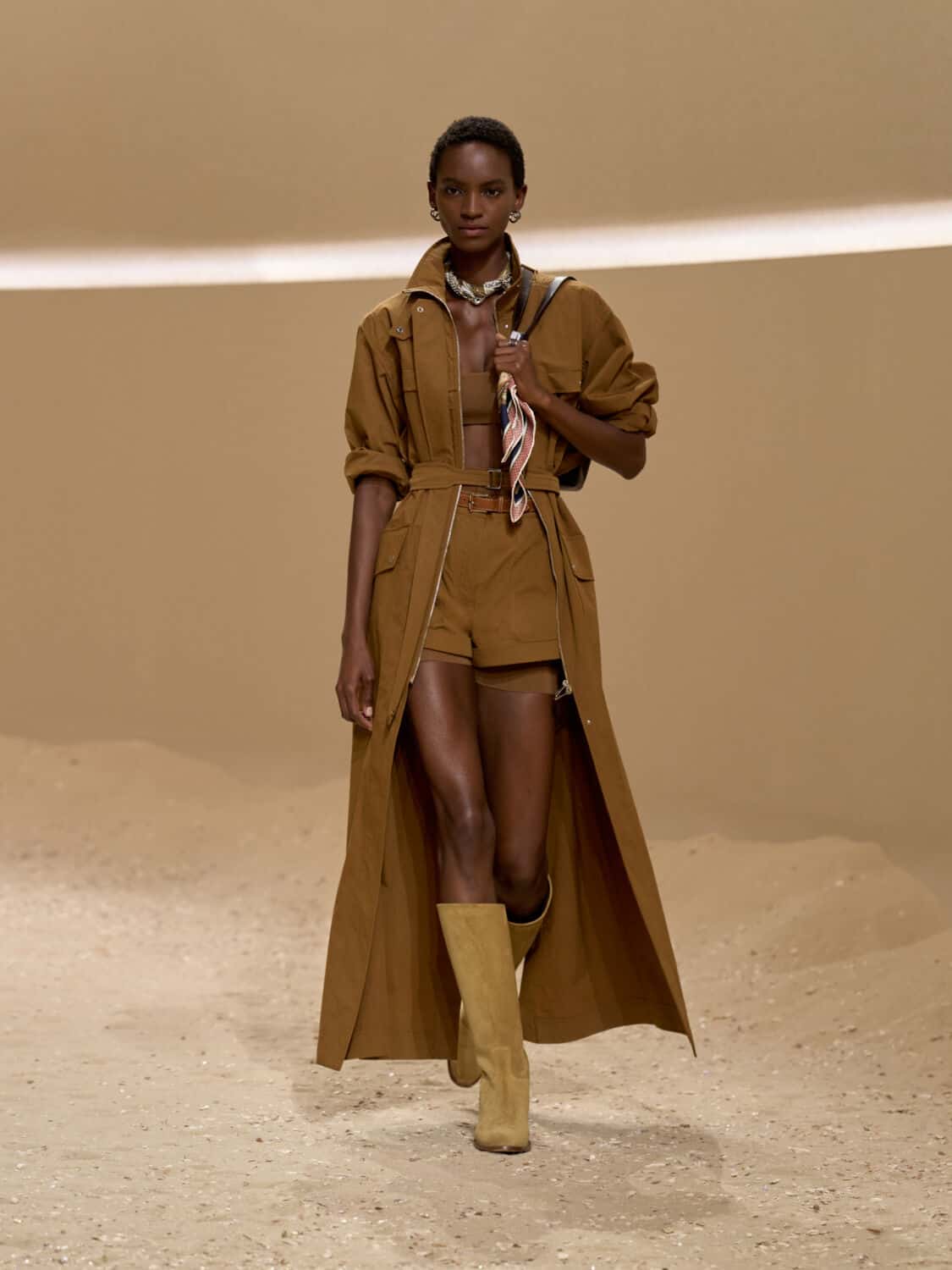 Titled “Free Rein”, the show notes envisioned a horsewoman set loose — she’s emancipated and empowered. Vanhee said she was inspired by Camargue, a region in the south of France known for their brine lagoons and marshland and home to Camargue horses, who roam through the land. A saddle from the region is in the Hermès archives, making it the perfect starting point to build out the collection, with its elements like the troussequin backrest or the straps and buckles broken down and reimagined for modern day dressing. It’s evident from the opening look as the designer transforms leather straps into a harness that swoops across the bust, accentuating the chest. Worn over low slung leather shorts and topped off with a sweeping trench, it’s easy to imagine this mythical woman casually dismounting off her wild mount, much to the awe of those around her.