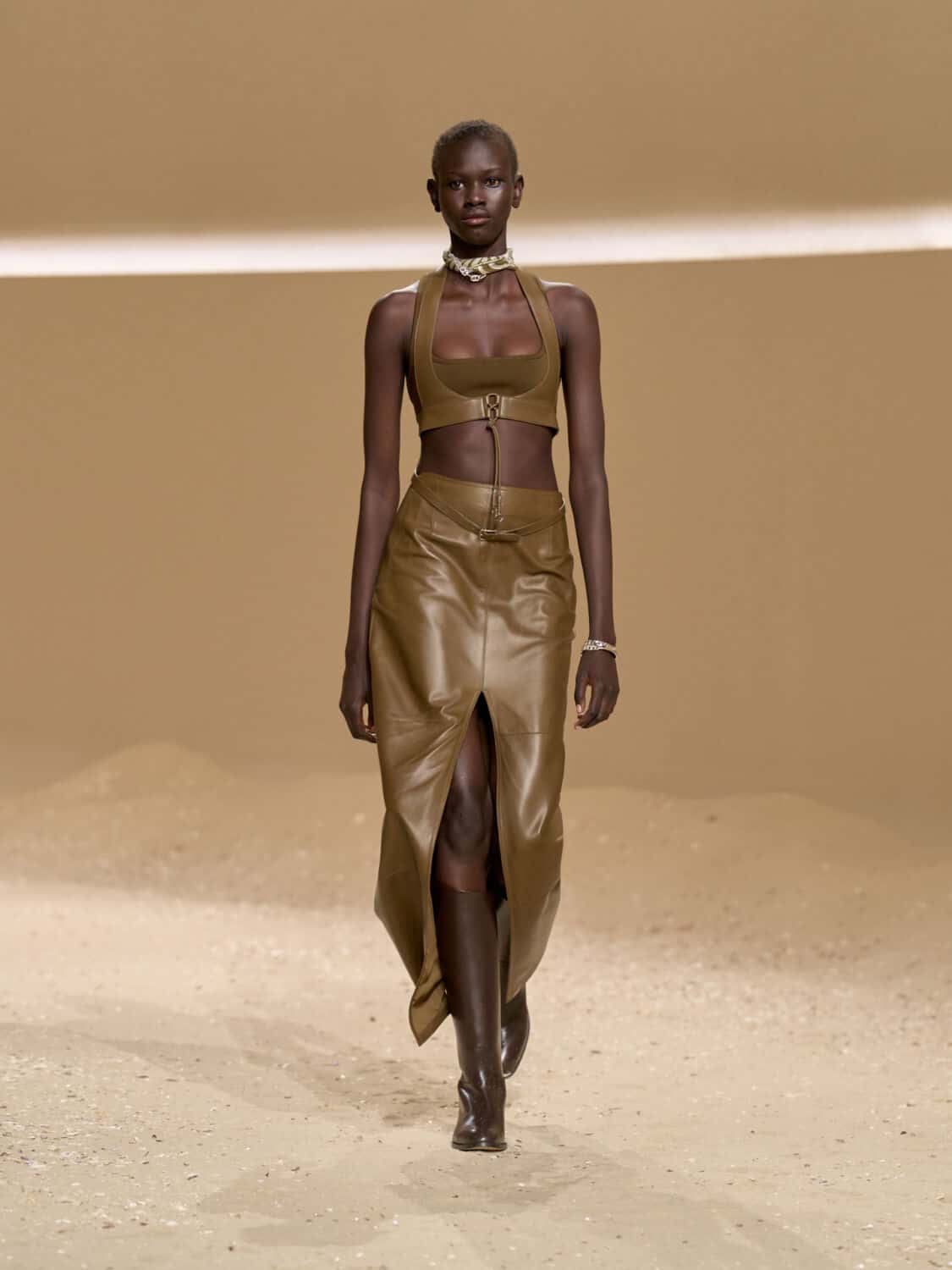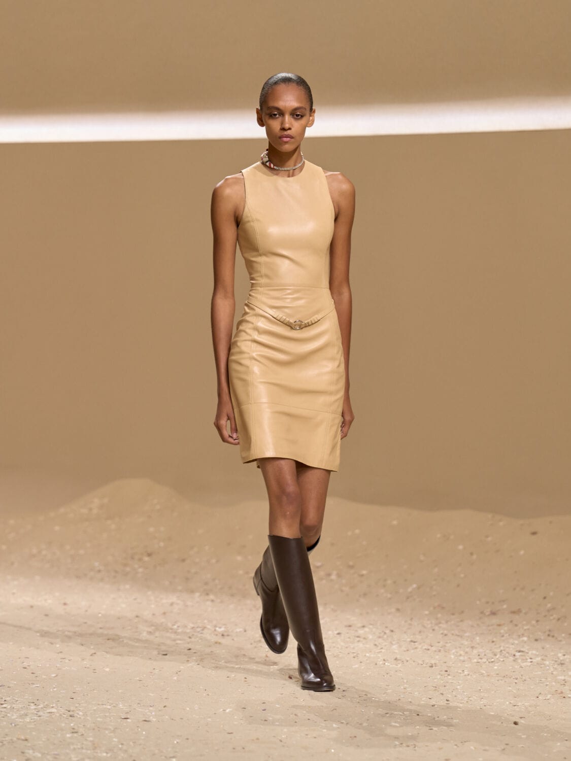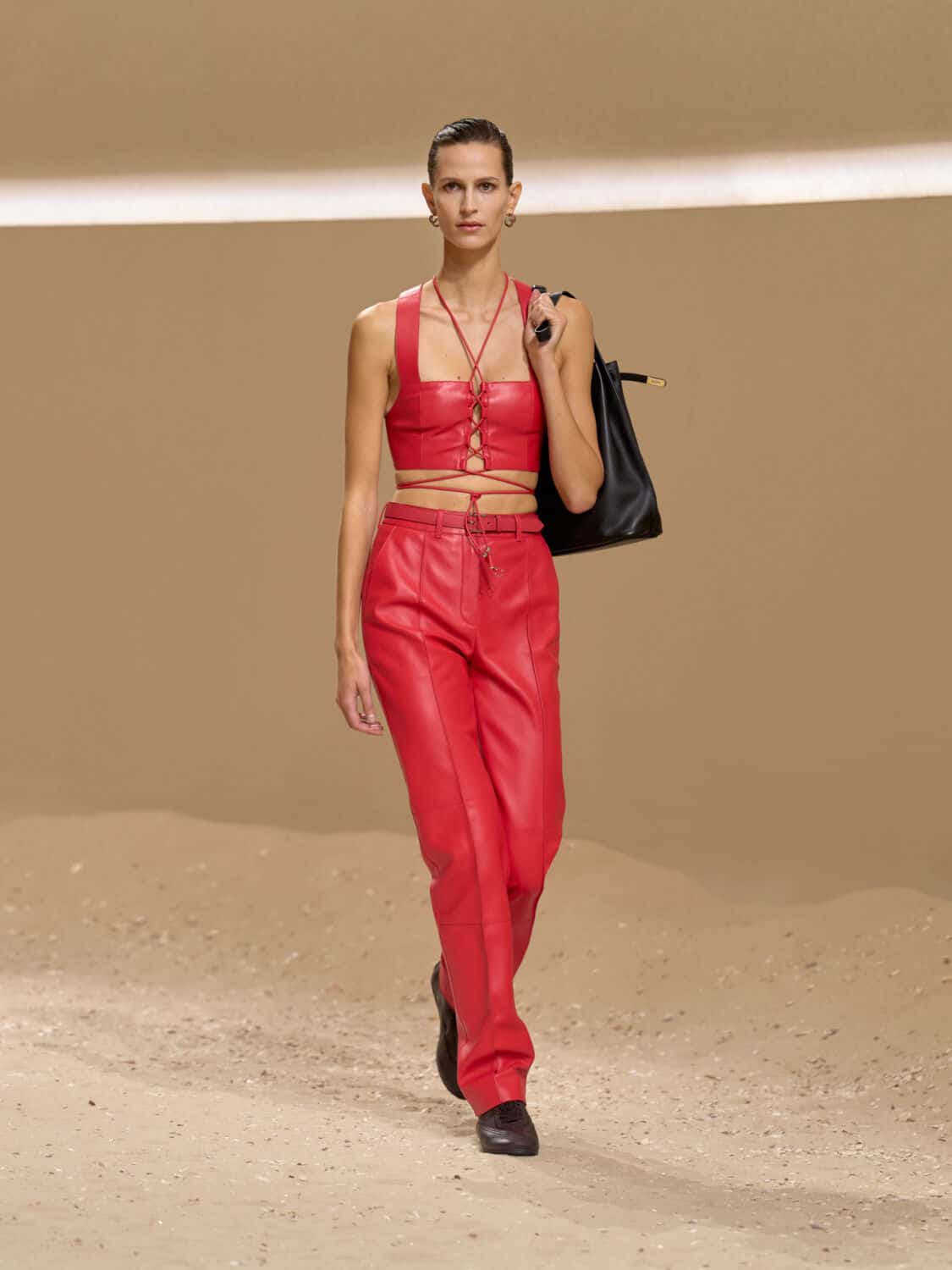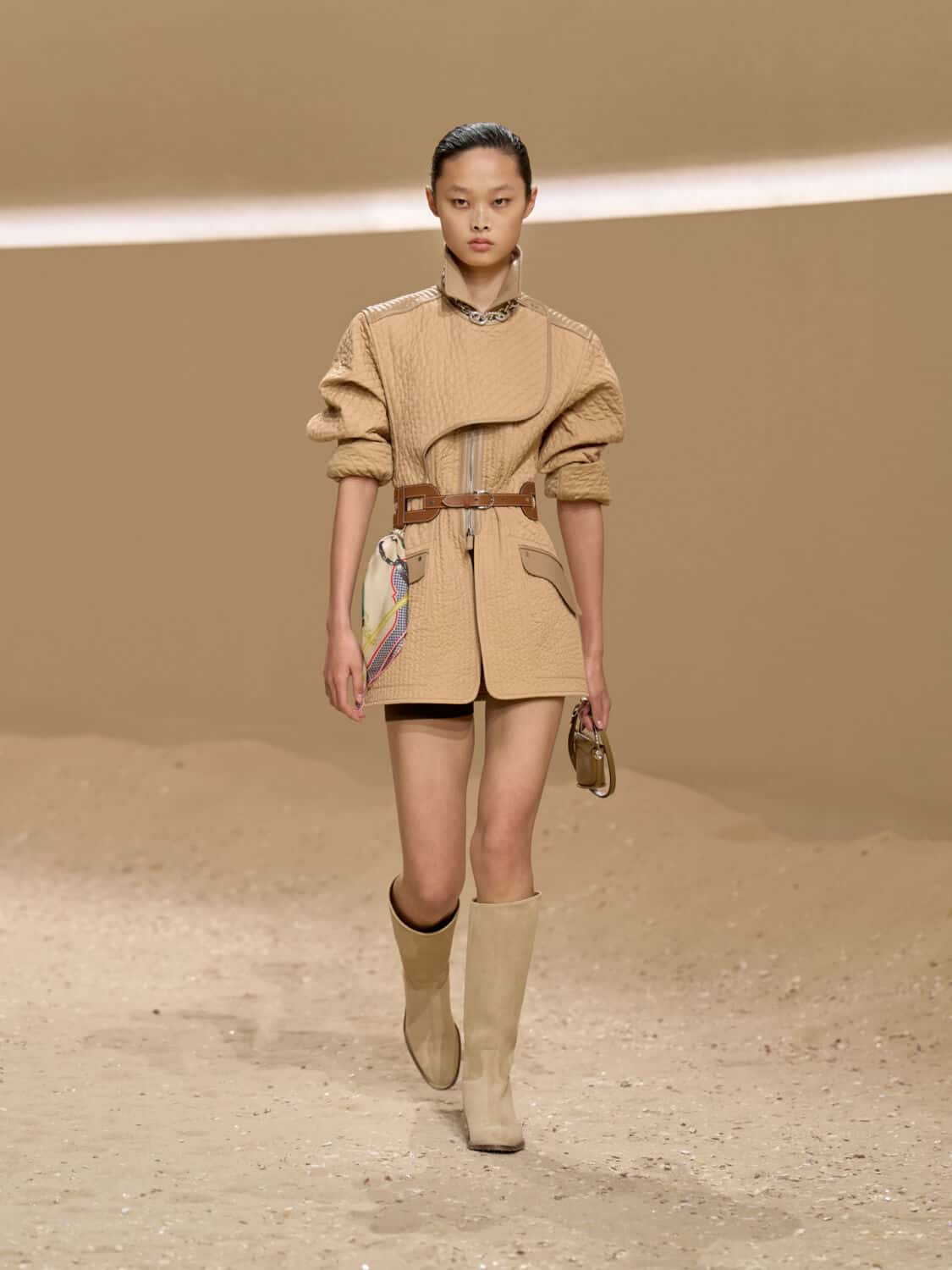Titled “Free Rein”, the show notes envisioned a horsewoman set loose — she’s emancipated and empowered. Vanhee said she was inspired by Camargue, a region in the south of France known for their brine lagoons and marshland and home to Camargue horses, who roam through the land. A saddle from the region is in the Hermès archives, making it the perfect starting point to build out the collection, with its elements like the troussequin backrest or the straps and buckles broken down and reimagined for modern day dressing. It’s evident from the opening look as the designer transforms leather straps into a harness that swoops across the bust, accentuating the chest. Worn over low slung leather shorts and topped off with a sweeping trench, it’s easy to imagine this mythical woman casually dismounting off her wild mount, much to the awe of those around her.