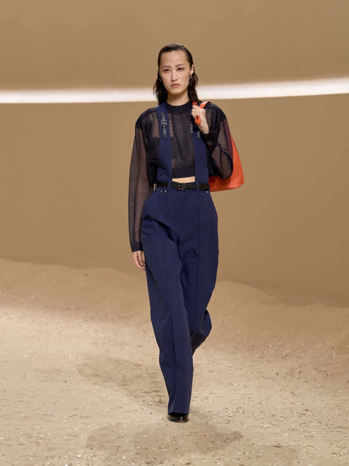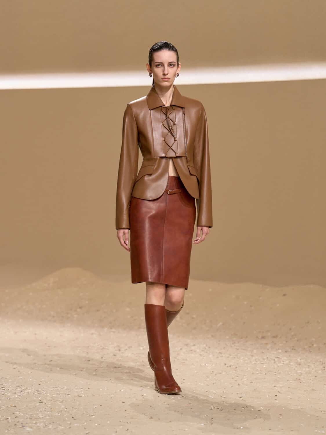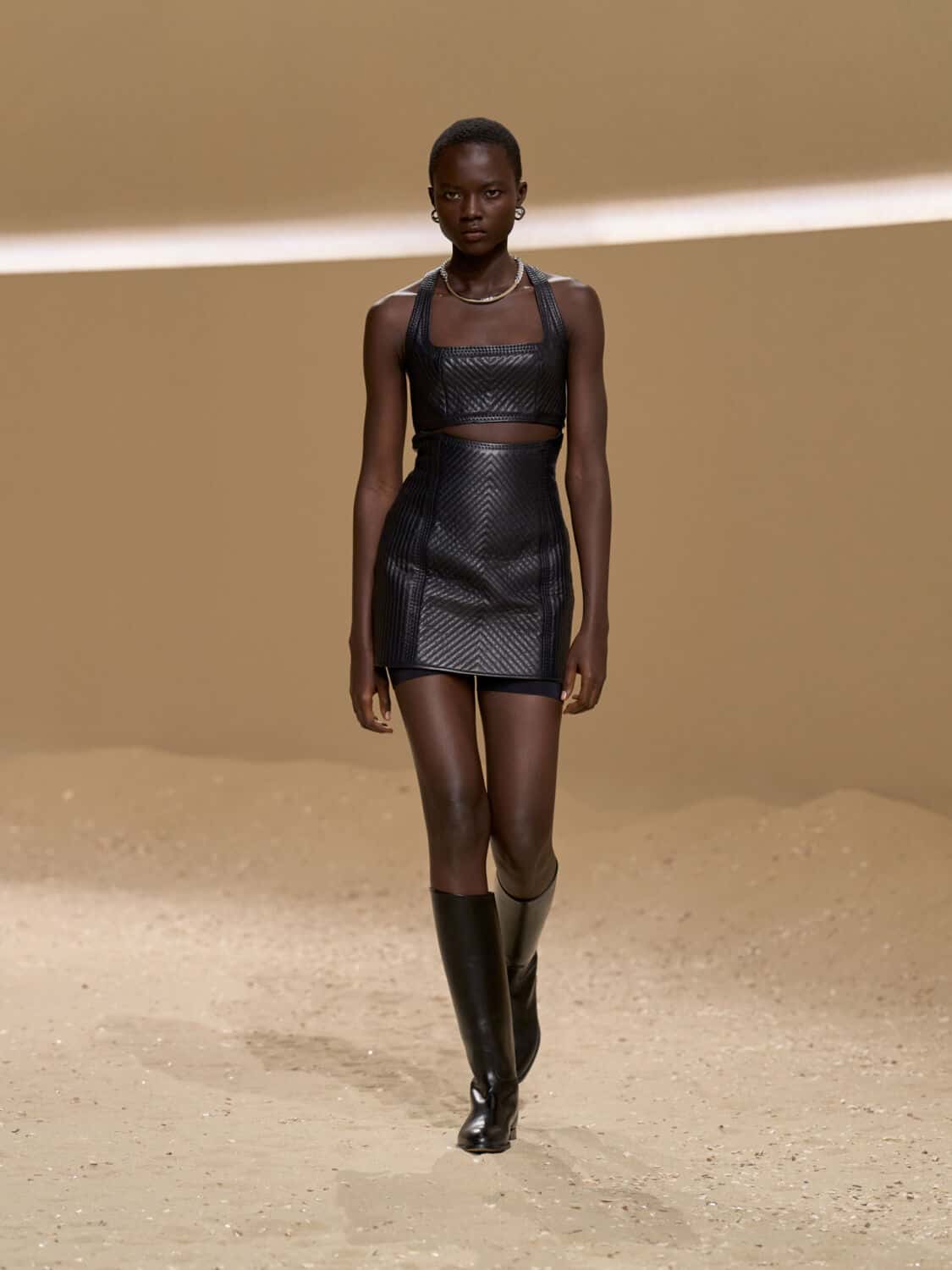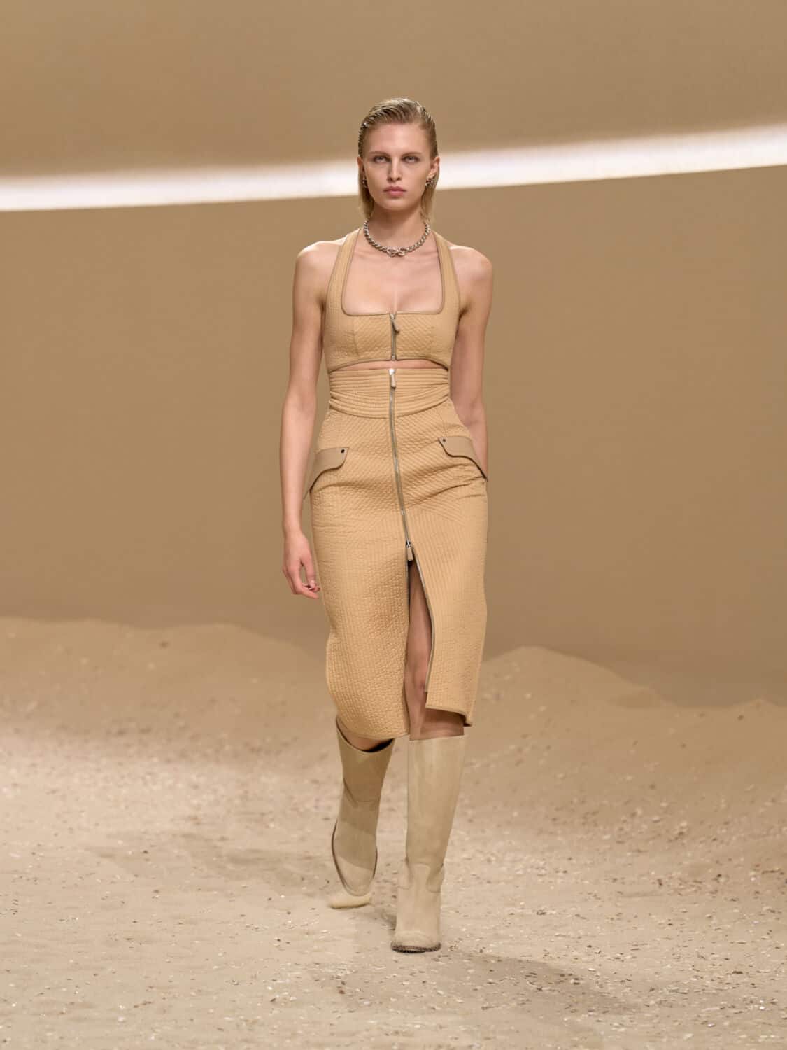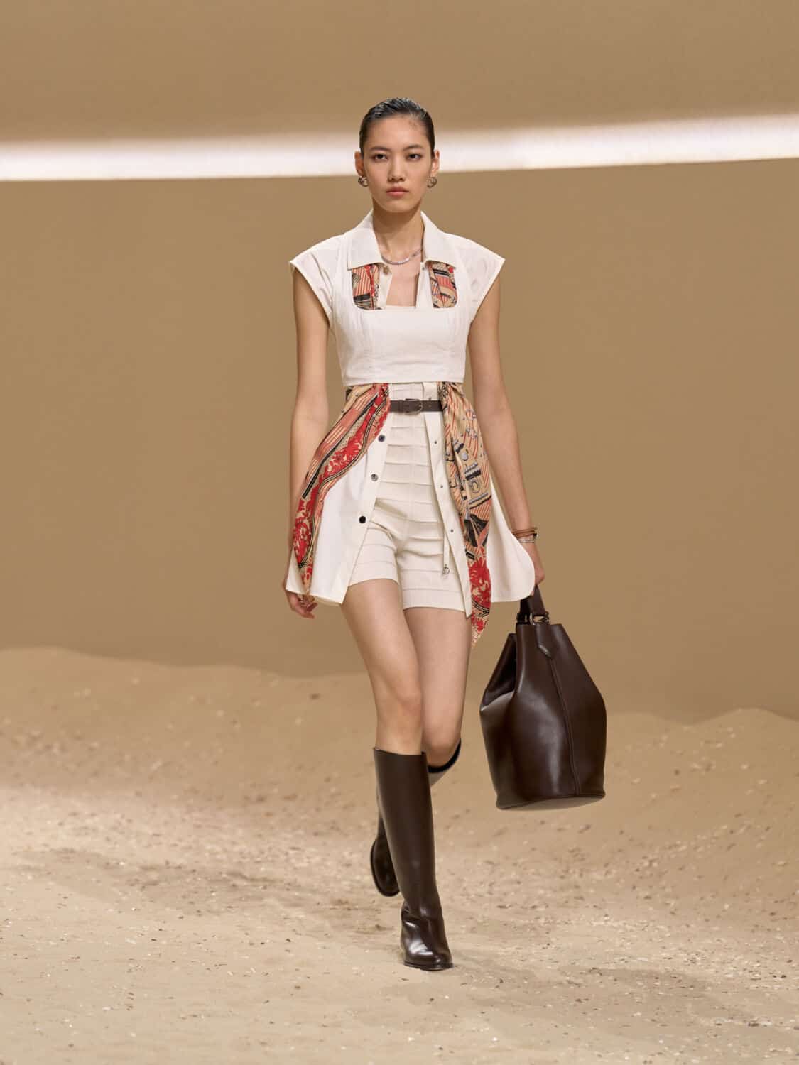Titled “Free Rein”, the show notes envisioned a horsewoman set loose — she’s emancipated and empowered. Vanhee said she was inspired by Camargue, a region in the south of France known for their brine lagoons and marshland and home to Camargue horses, who roam through the land. A saddle from the region is in the Hermès archives, making it the perfect starting point to build out the collection, with its elements like the troussequin backrest or the straps and buckles broken down and reimagined for modern day dressing. It’s evident from the opening look as the designer transforms leather straps into a harness that swoops across the bust, accentuating the chest. Worn over low slung leather shorts and topped off with a sweeping trench, it’s easy to imagine this mythical woman casually dismounting off her wild mount, much to the awe of those around her.
