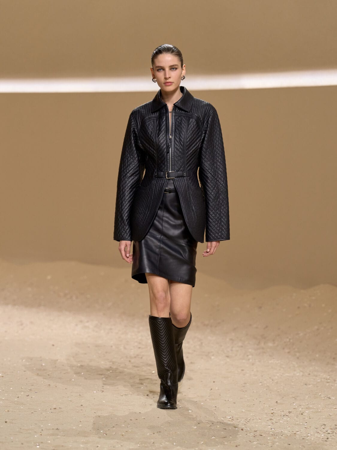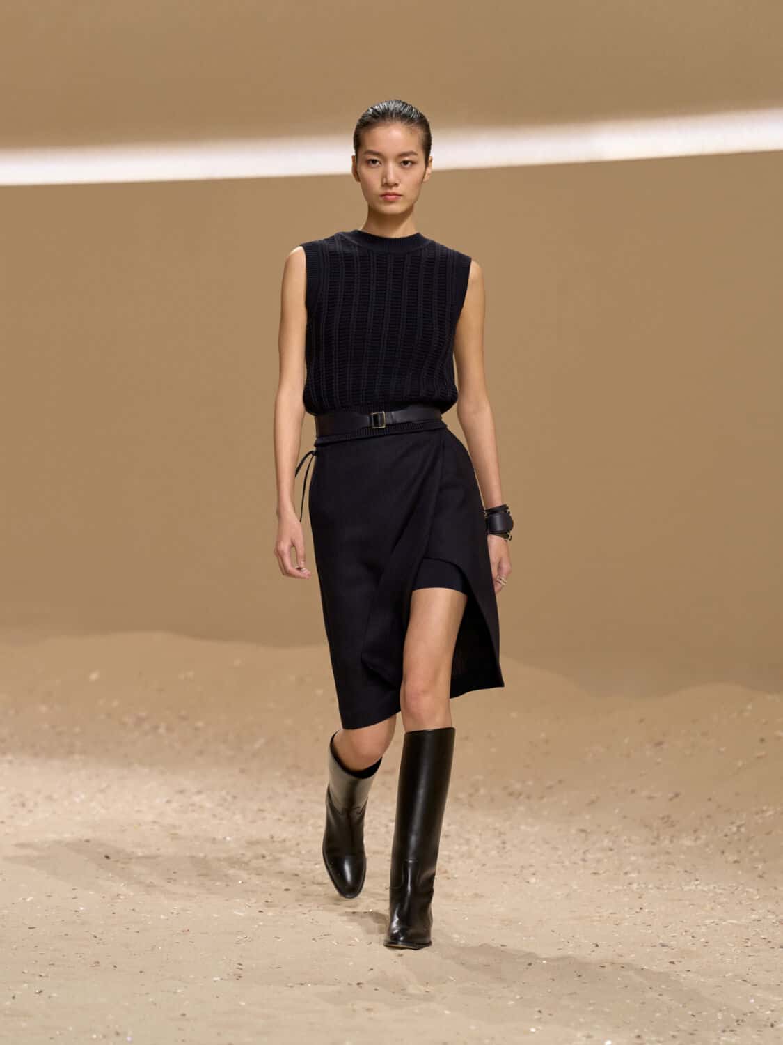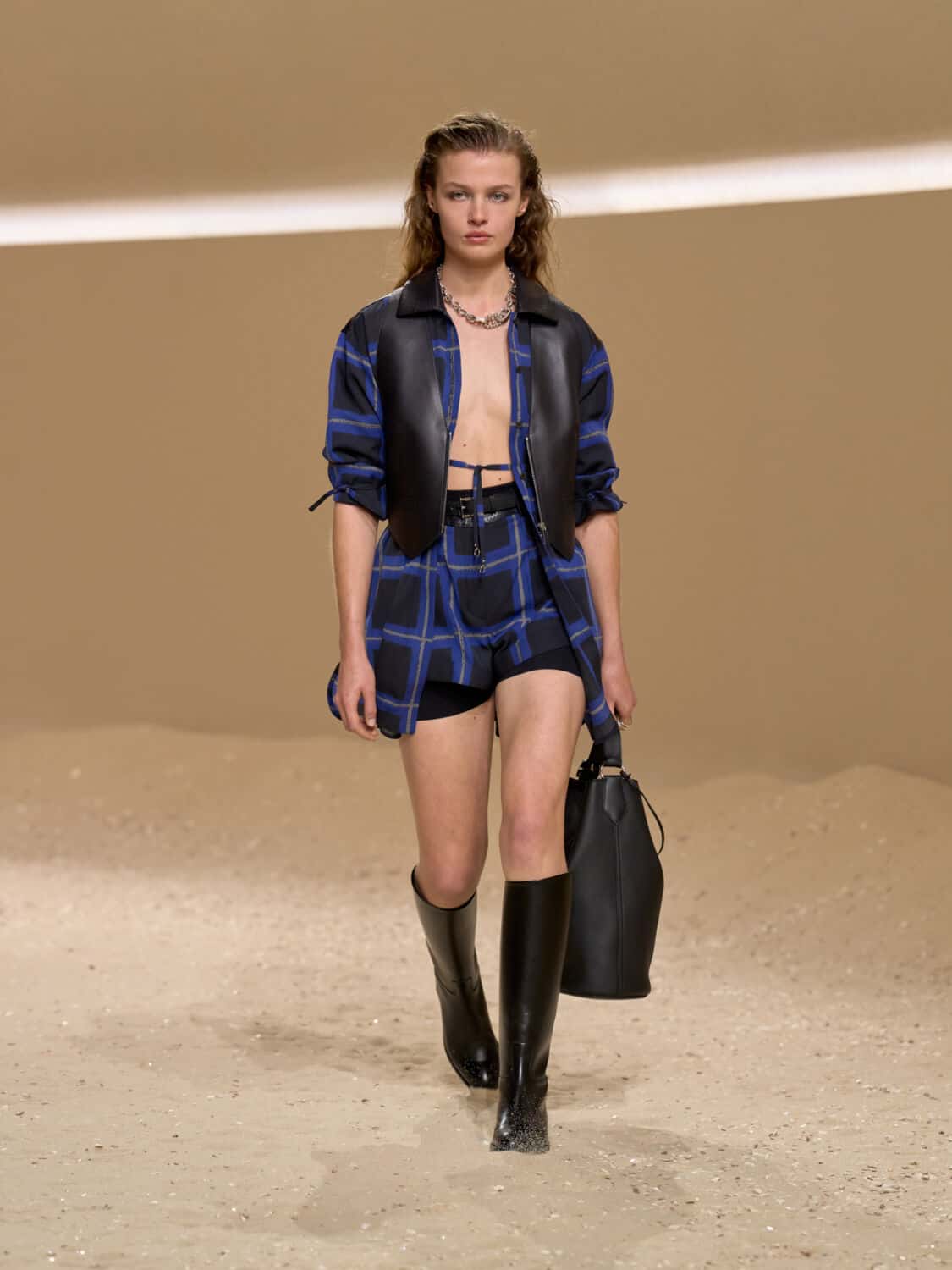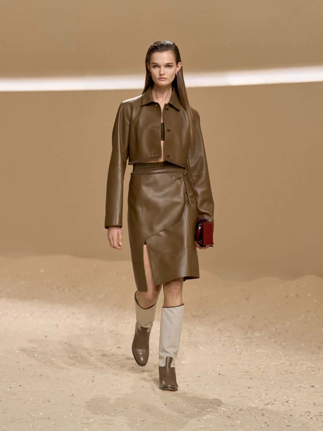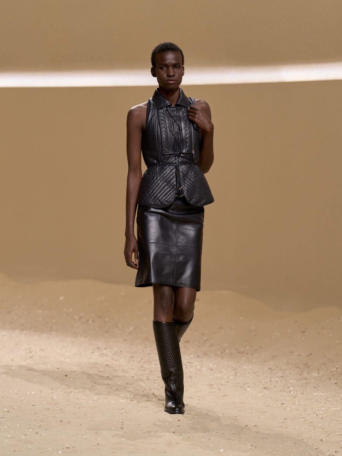 Titled “Free Rein”, the show notes envisioned a horsewoman set loose — she’s emancipated and empowered. Vanhee said she was inspired by Camargue, a region in the south of France known for their brine lagoons and marshland and home to Camargue horses, who roam through the land. A saddle from the region is in the Hermès archives, making it the perfect starting point to build out the collection, with its elements like the troussequin backrest or the straps and buckles broken down and reimagined for modern day dressing. It’s evident from the opening look as the designer transforms leather straps into a harness that swoops across the bust, accentuating the chest. Worn over low slung leather shorts and topped off with a sweeping trench, it’s easy to imagine this mythical woman casually dismounting off her wild mount, much to the awe of those around her.