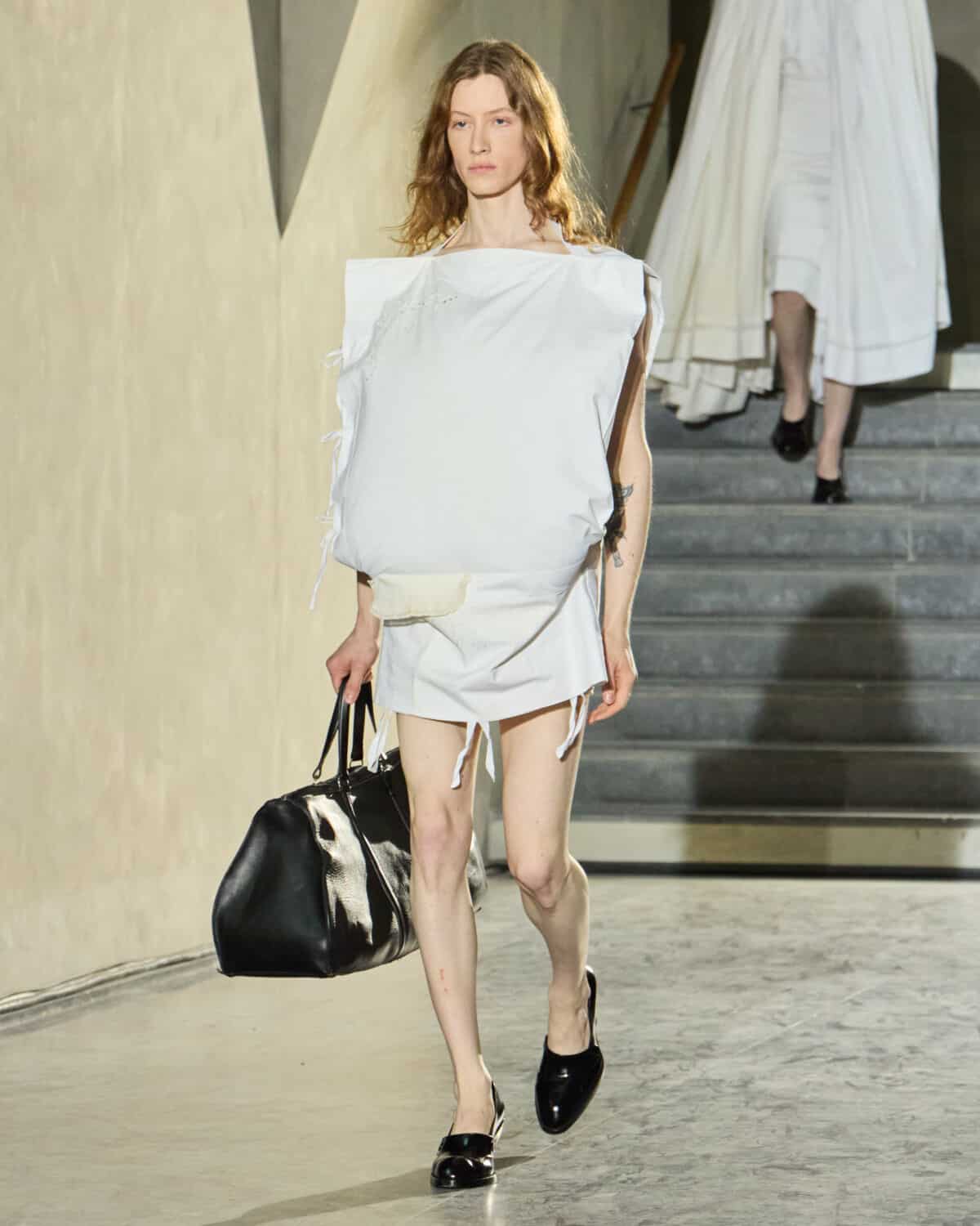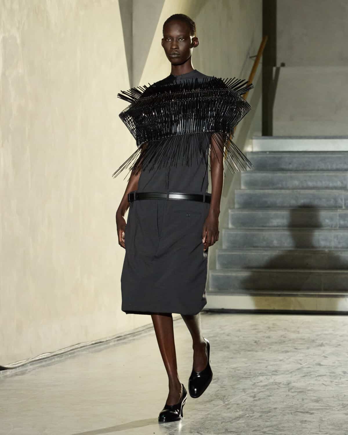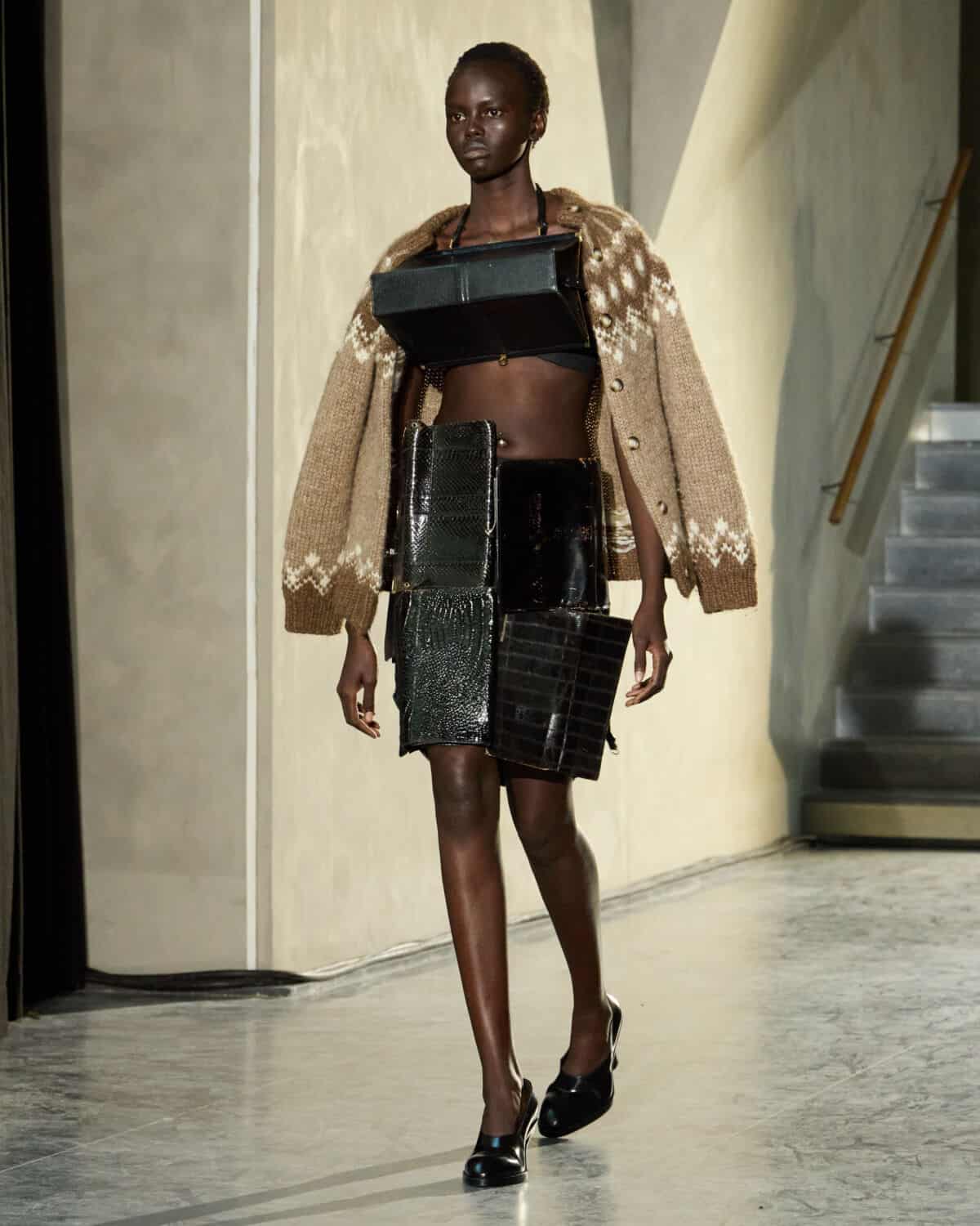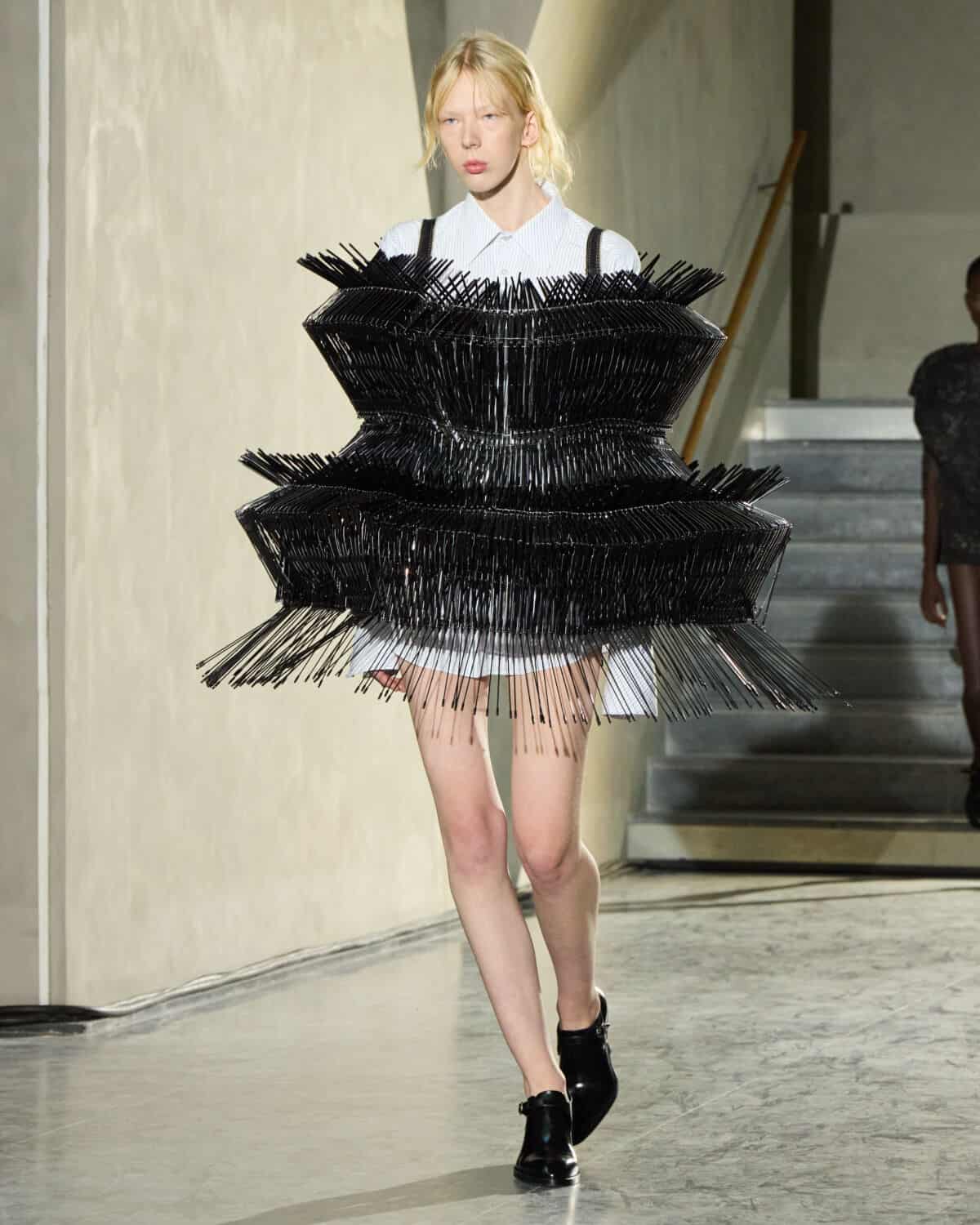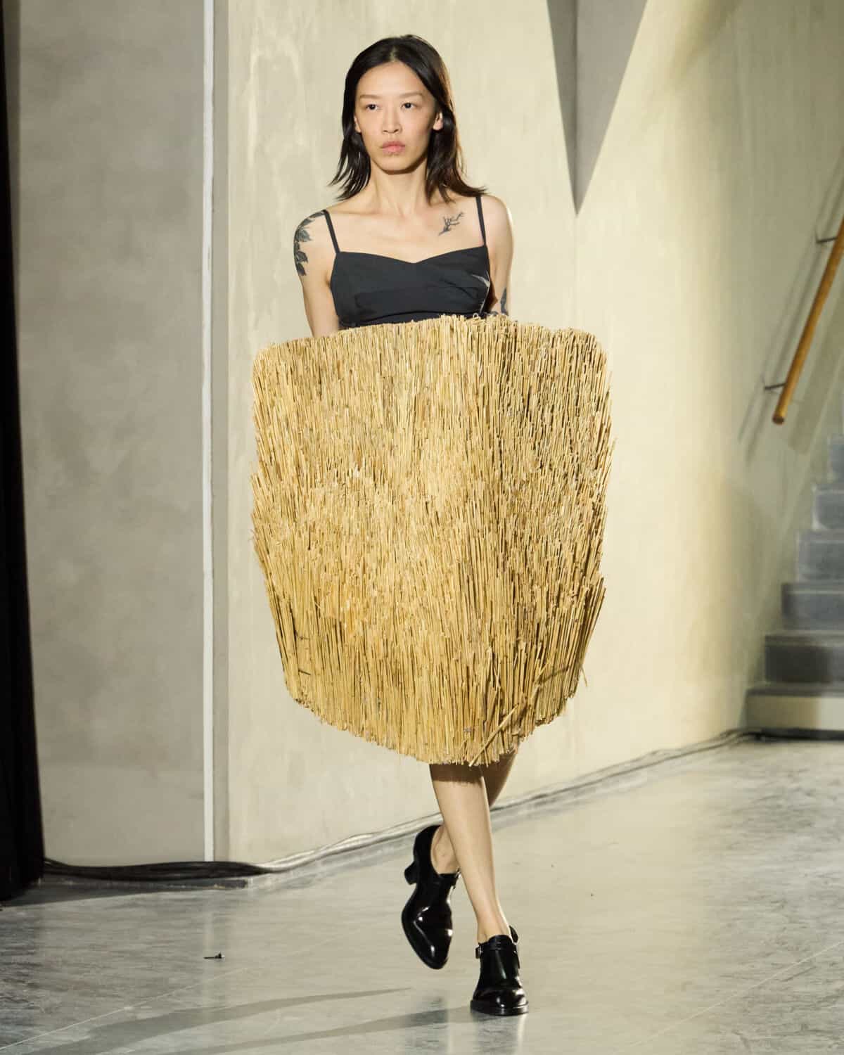 Calling the offering Conventional Collection 112509, ribs of steel strutted down stone steps as tops, frocks, skirts and hats similar to the Japanese kasa – a thousand umbrella bones remade as something akin to armour (and in one case, Edward Scissorhands-type claws). These were followed by three-dimensional skirts weighed down by the open pages of paperback books that swished between chapters with every step. Elsewhere, vintage handbags were spliced into bra tops and twinsets worn under Fair Isle knits cut with Romanian-style embroidered collars, pillow cases became frumpy cotton gowns and knit mittens were collaged into a micro minidress. Some button-up shirts had structurally shrugged shoulders, as if stuck in a permanently awkward state or perpetually saying “I don’t know, sorry”. At the end, passels of black zippers seemed to mimic fur while heaped belts signalled the eclectic layering of feathers, before finally the show closed with bulbous straw skirts and a sturdy, straw-woven dress. It read like archaeology – objects unearthed, dismantled and reformed into something tender yet unflinching. So very Hodakova.