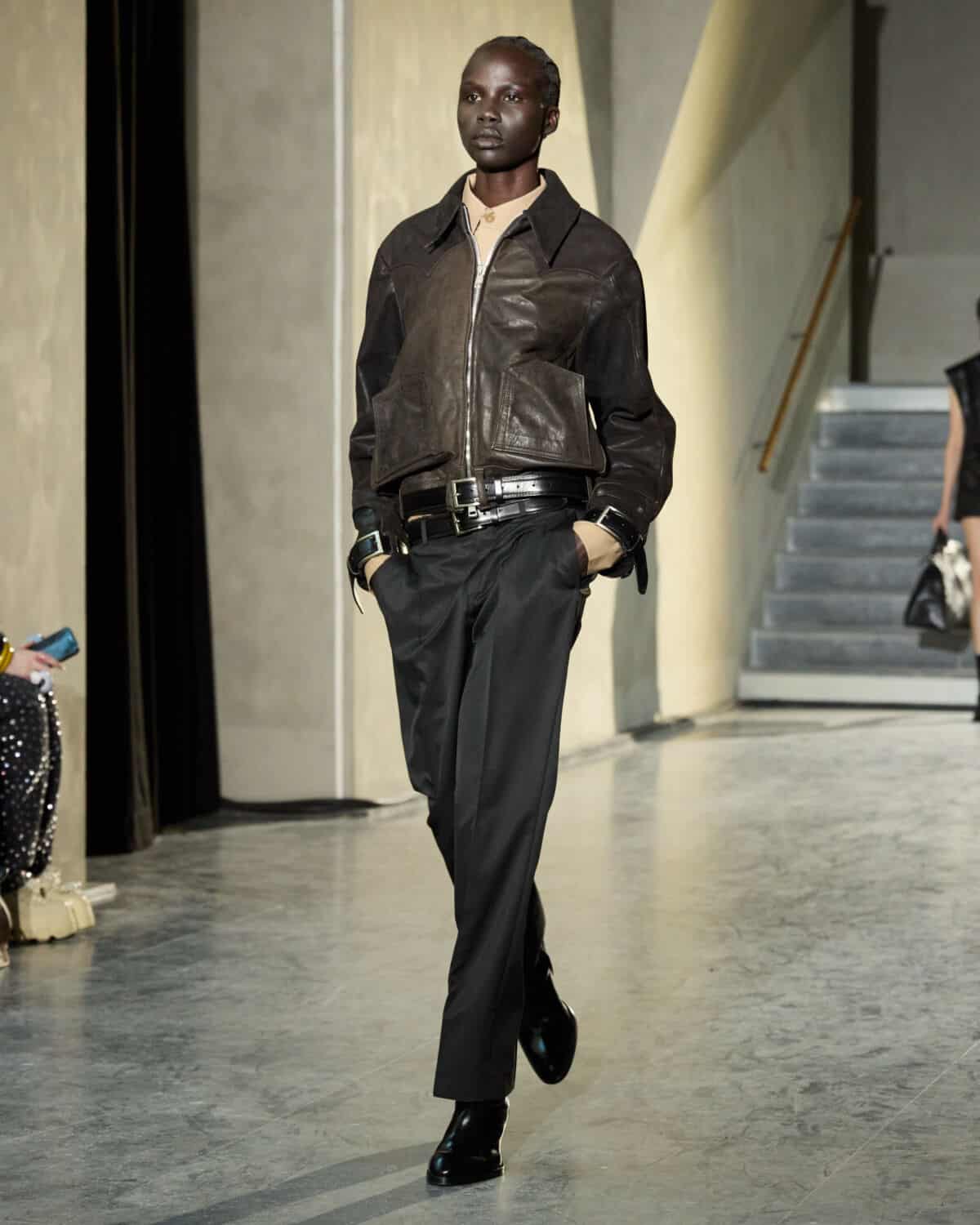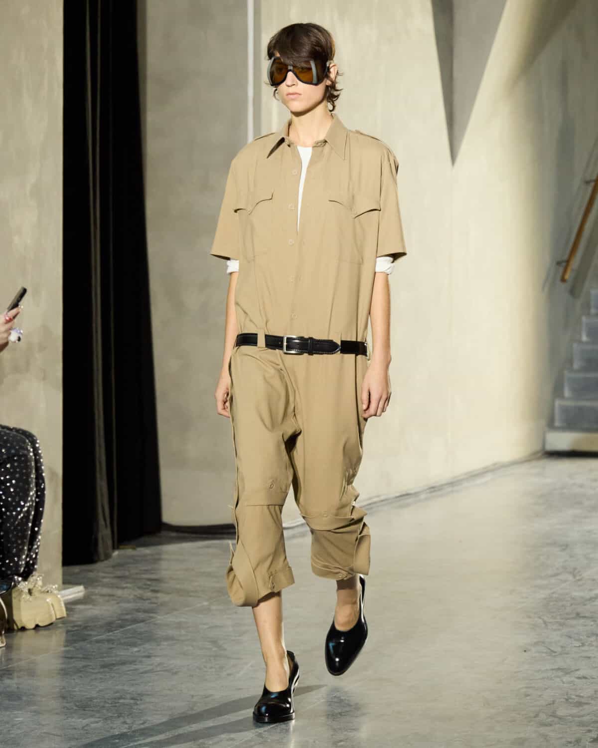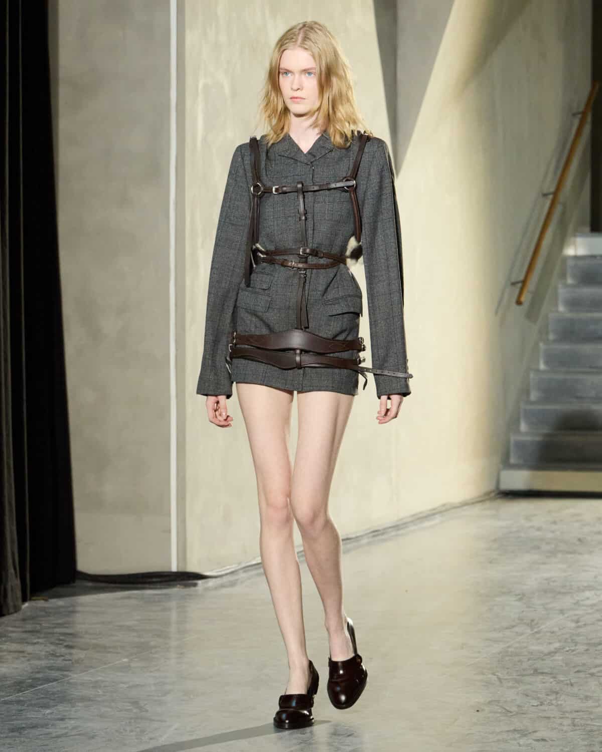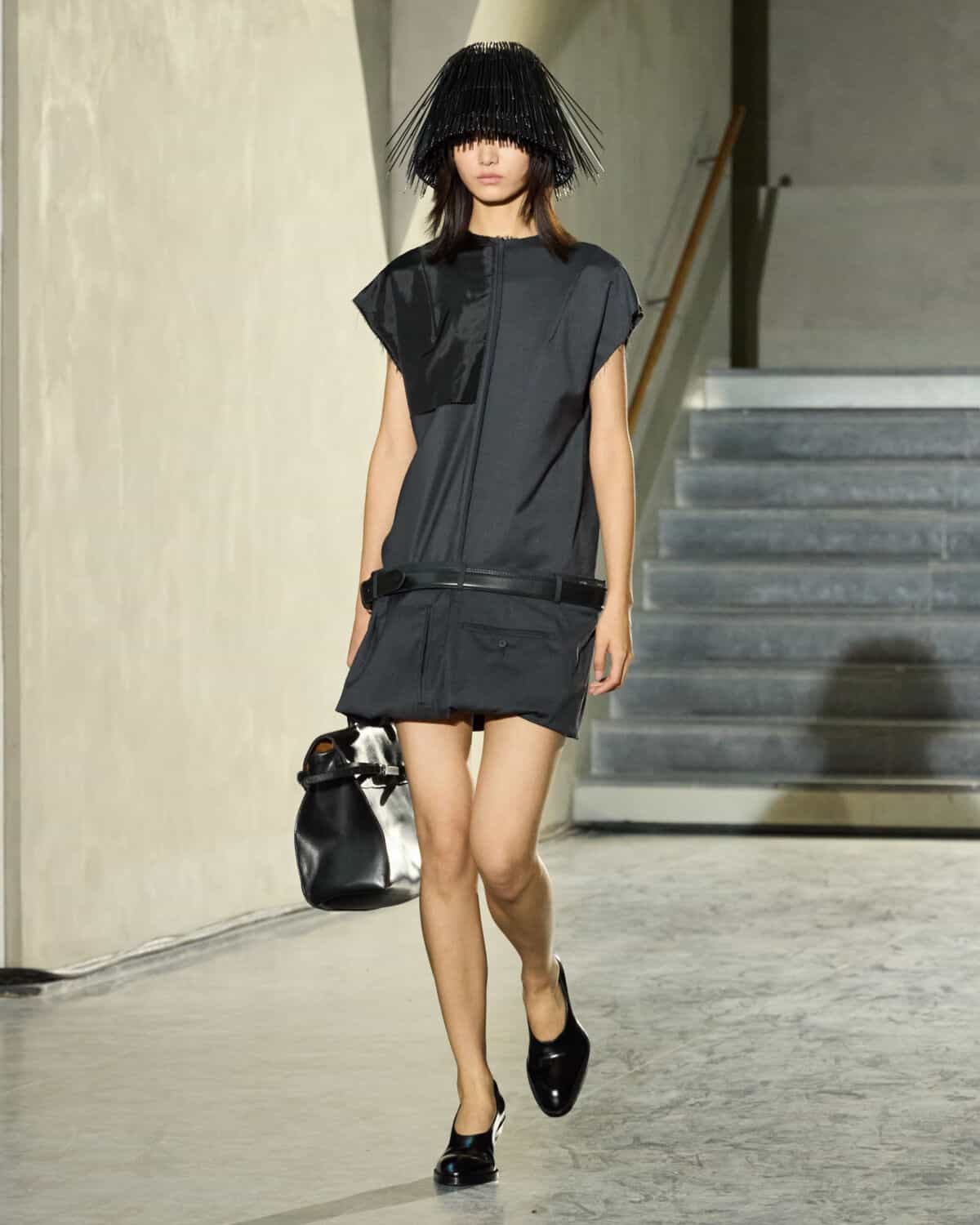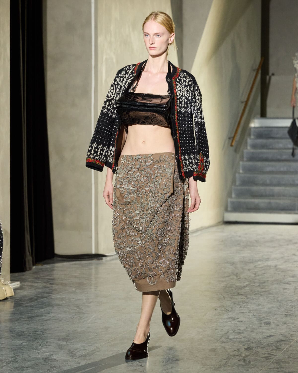 Calling the offering Conventional Collection 112509, ribs of steel strutted down stone steps as tops, frocks, skirts and hats similar to the Japanese kasa – a thousand umbrella bones remade as something akin to armour (and in one case, Edward Scissorhands-type claws). These were followed by three-dimensional skirts weighed down by the open pages of paperback books that swished between chapters with every step. Elsewhere, vintage handbags were spliced into bra tops and twinsets worn under Fair Isle knits cut with Romanian-style embroidered collars, pillow cases became frumpy cotton gowns and knit mittens were collaged into a micro minidress. Some button-up shirts had structurally shrugged shoulders, as if stuck in a permanently awkward state or perpetually saying “I don’t know, sorry”. At the end, passels of black zippers seemed to mimic fur while heaped belts signalled the eclectic layering of feathers, before finally the show closed with bulbous straw skirts and a sturdy, straw-woven dress. It read like archaeology – objects unearthed, dismantled and reformed into something tender yet unflinching. So very Hodakova.
