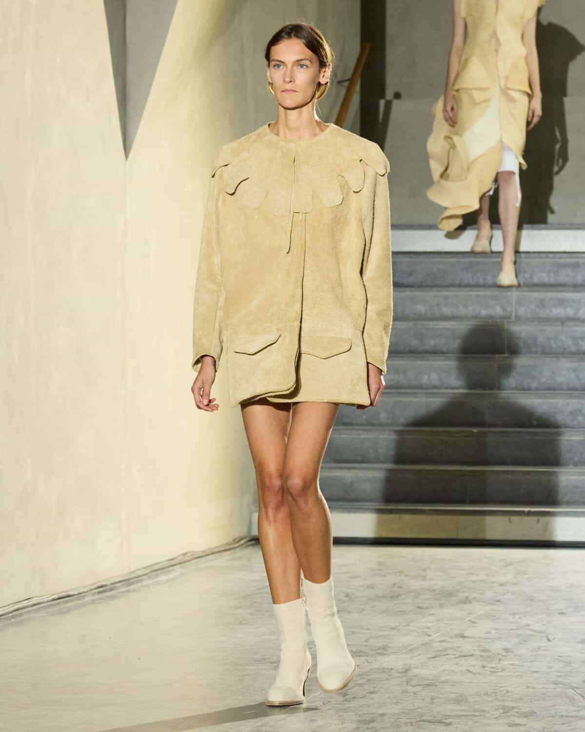 Within the Portzamparc Wing at Musée Bourdelle, Ellen Hodakova Larsson – fresh from her 2024 LVMH Prize win – bid adieu to last season’s slim, gothic mood, stepping instead into something softer, brighter and charged with confident bravado. Hodakova has always thrived in the unexpected, transforming the mundane into the marvellous (briefcases as mini dresses, mangled spoons as ball gowns and for AW25, an entire cello as ‘casual’ clothes). And here, in her SS26 collection, she continued that practice of curious assemblage with a sharp, poetic edge.