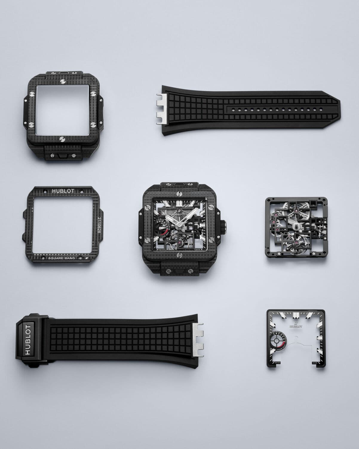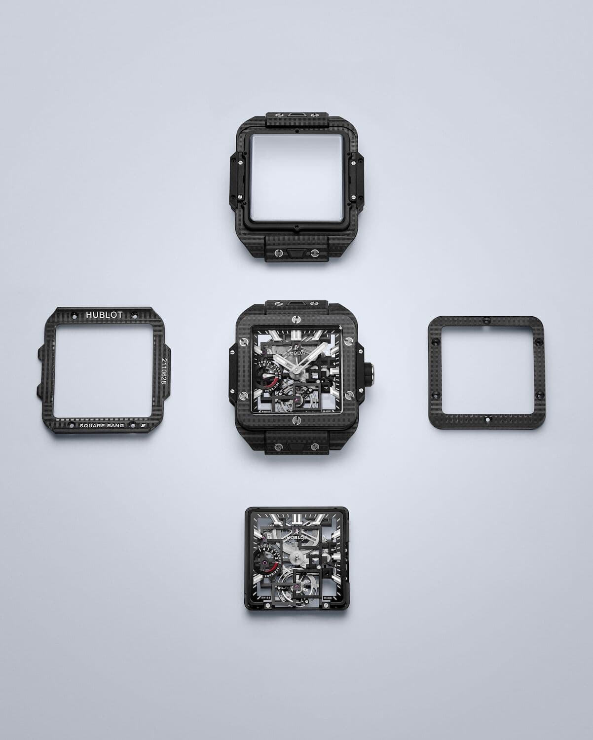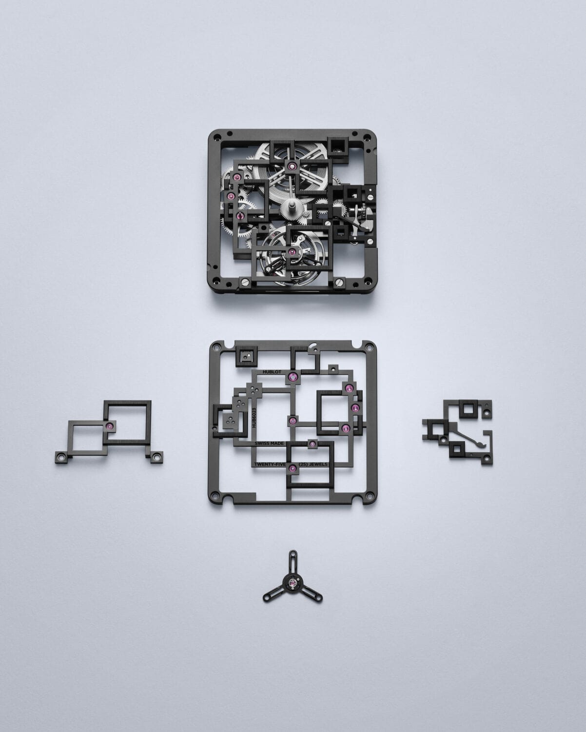This groundbreaking timepiece isn’t just the most technically advanced Square Bang to date, it’s actually a smorgasbord of firsts: the first Square Bang with just two central hands, the first with a striking 3D carbon case with woven horizontal and vertical lines and the first to feature a manually wound tourbillon-regulated movement. Oh, and true to its architectural ambition, it only has square or rectangular bridges bringing that commitment to the quadrilateral to the next level.