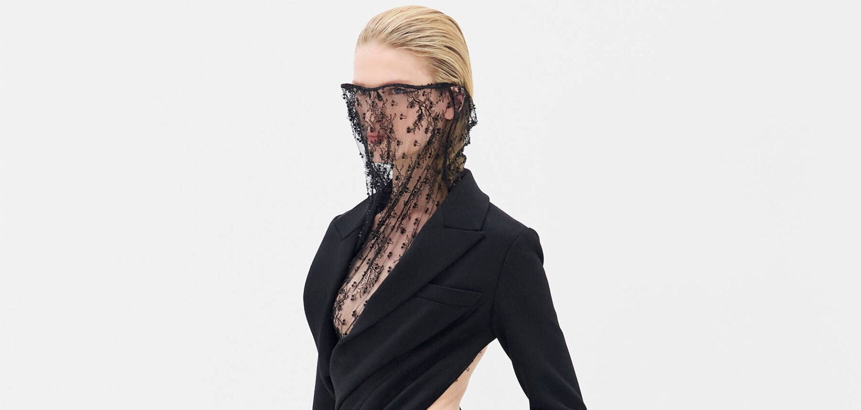 Di Felice created a narrative for his collection, of an ingenue arriving in Paris symbolically hidden beneath face veils and draped fabric, before gradually revealing more themselves as clothes peeled away from corseted bodices.