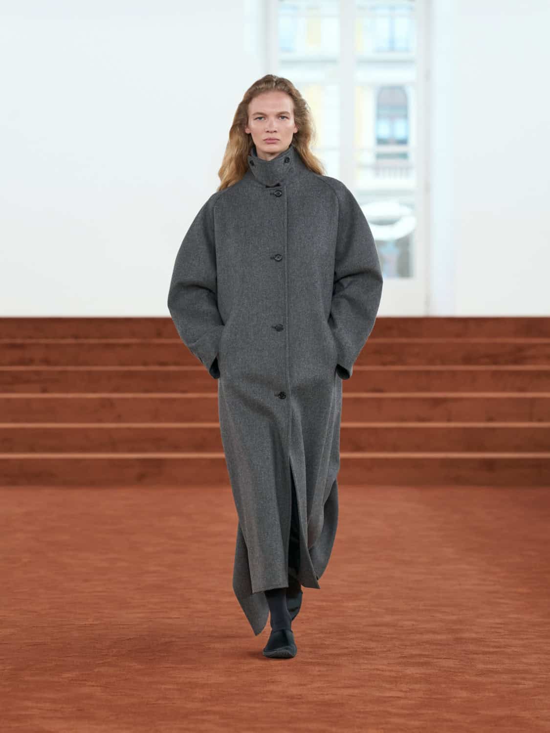 The palette stayed close to home – faded neutrals, black, grey and deep blues – but the silhouettes loosened. Shoulder lines lifted slightly off the body, collars slipped back, pockets drifted. Tailoring was buttoned high and cut with vertical sharpness, yet coats and blazers featured high back slits that disrupted the severity. Upholstery references came through in molded hourglass shapes and fabric that felt padded, folded or held in place with visible bar tacks.