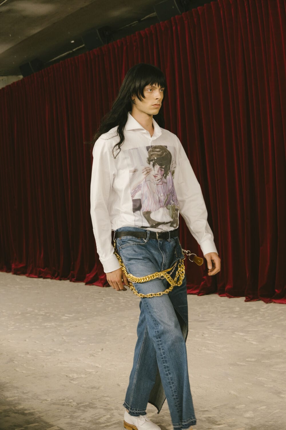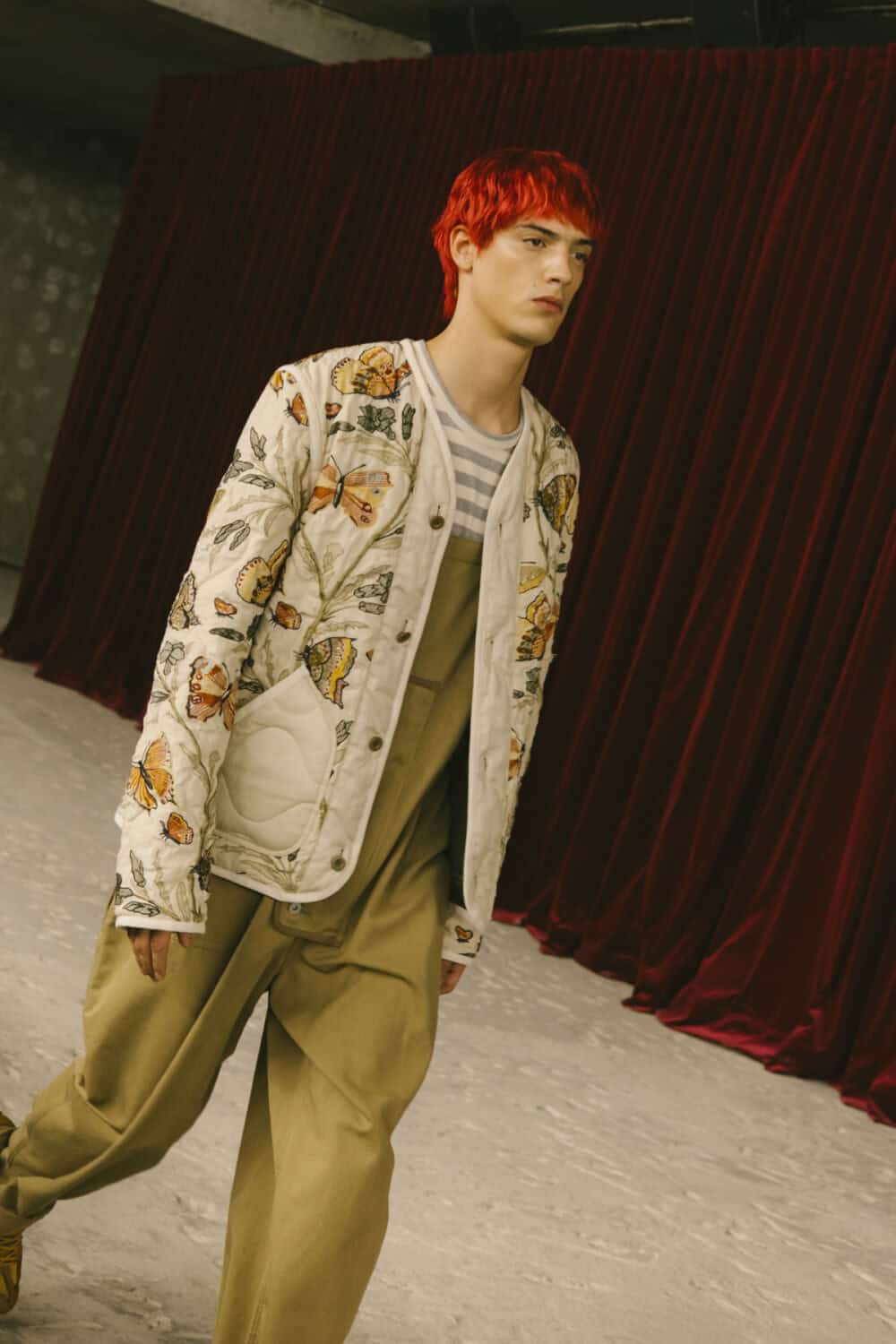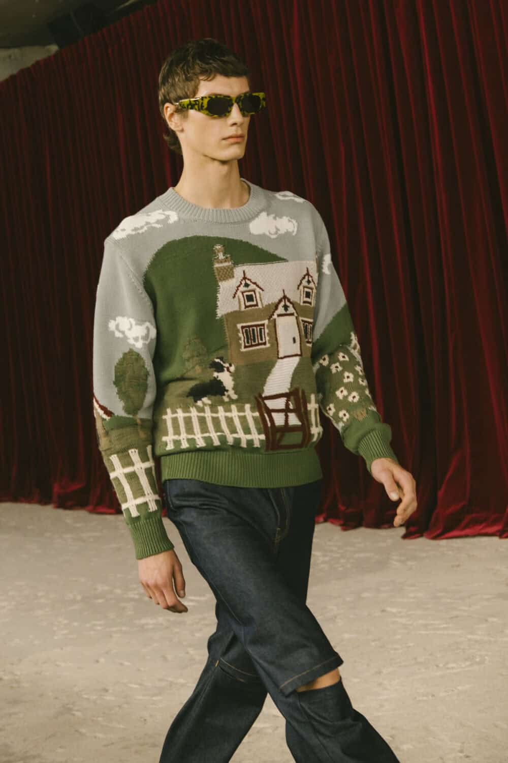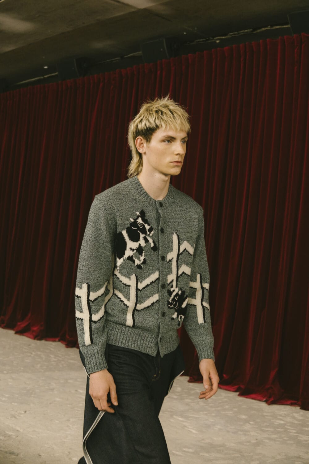 Watanabe pulled from his usual playbook – patchworking, layering and a love of heritage fabrics – but this season felt looser, more relaxed. Knitwear came pastoral and a bit precious, stitched with rolling hills and grazing sheep like postcards from a farm boy’s daydream. Trousers came baggy, breezy or skinny with a ‘70s-style kick flair. Denim made a strong showing too, in Frankensteined or irregularly-cut jeans, the kind you’d wear to smoke outside a philosophy lecture. Artistic prints – from Munch’s painting depicting anarchist philosopher Hans Jaeger to Elizabeth Peyton’s portraiture – popped up across outerwear and tees, a witty riff on taste itself.