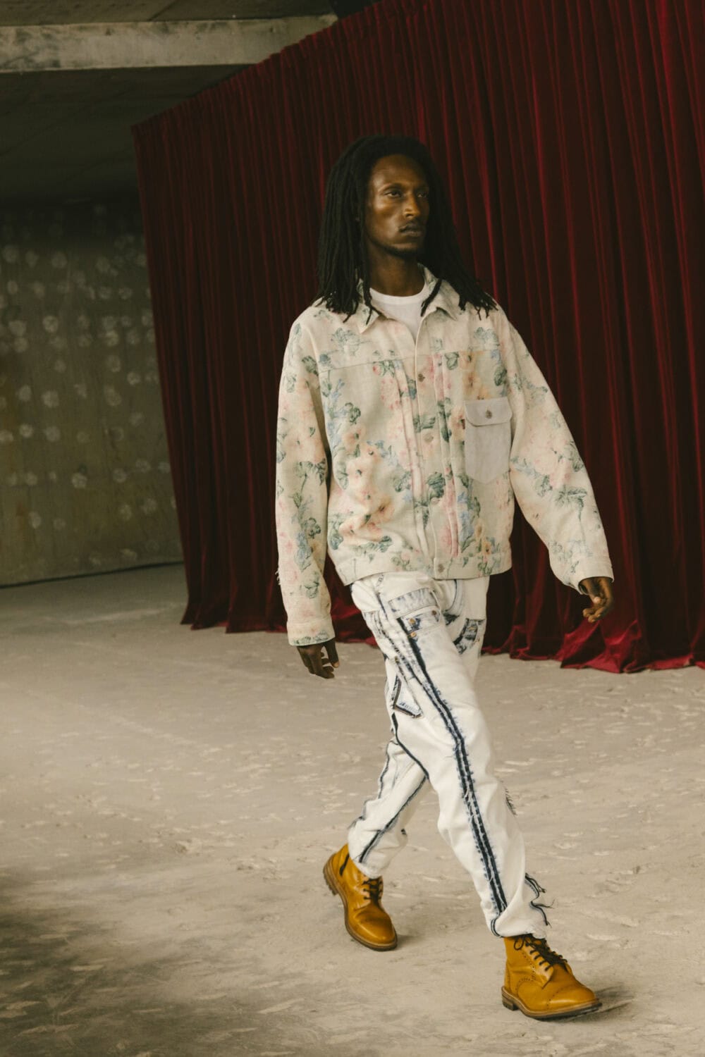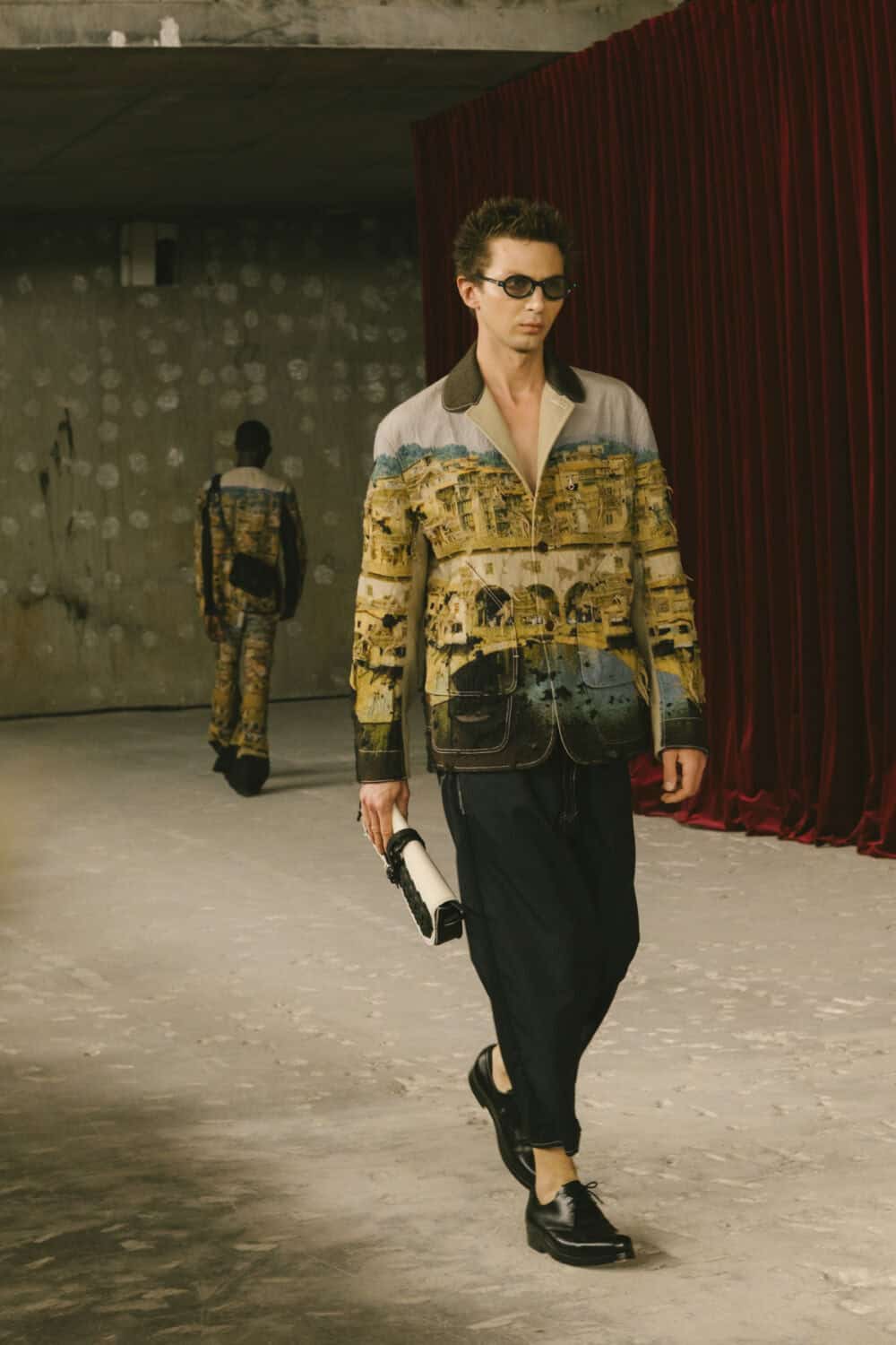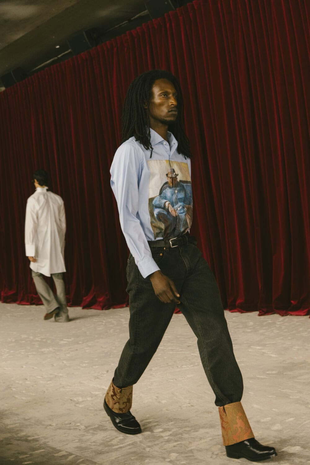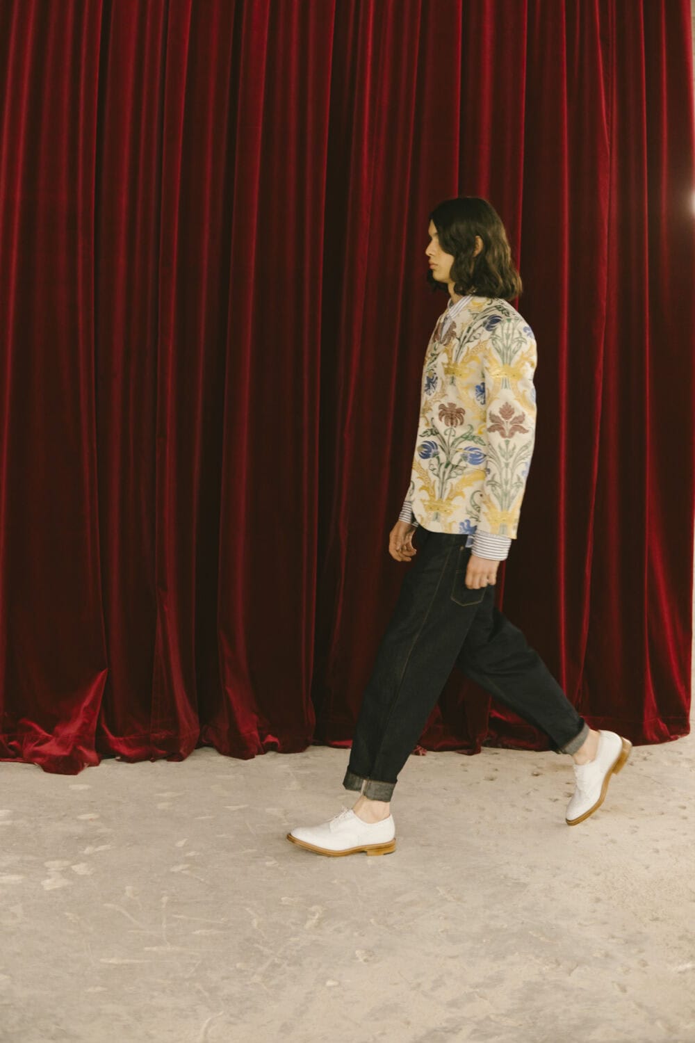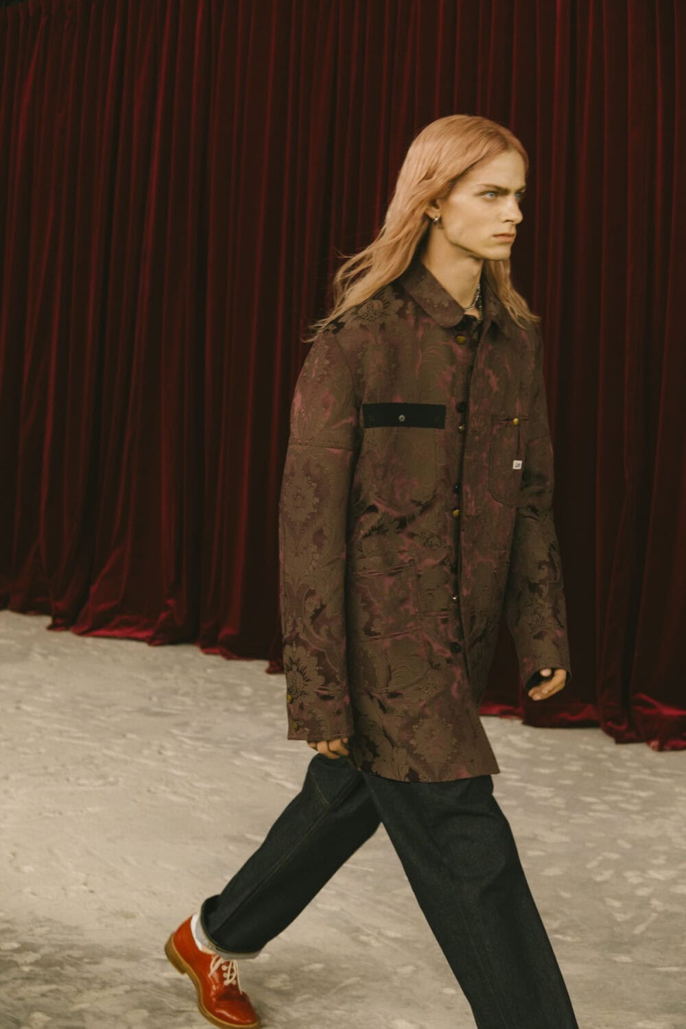 Watanabe pulled from his usual playbook – patchworking, layering and a love of heritage fabrics – but this season felt looser, more relaxed. Knitwear came pastoral and a bit precious, stitched with rolling hills and grazing sheep like postcards from a farm boy’s daydream. Trousers came baggy, breezy or skinny with a ‘70s-style kick flair. Denim made a strong showing too, in Frankensteined or irregularly-cut jeans, the kind you’d wear to smoke outside a philosophy lecture. Artistic prints – from Munch’s painting depicting anarchist philosopher Hans Jaeger to Elizabeth Peyton’s portraiture – popped up across outerwear and tees, a witty riff on taste itself.