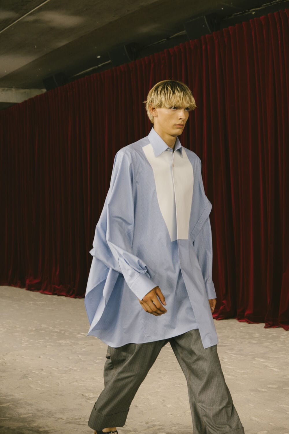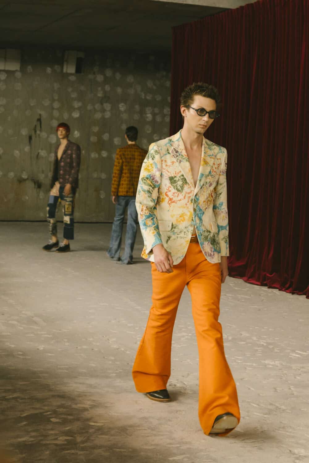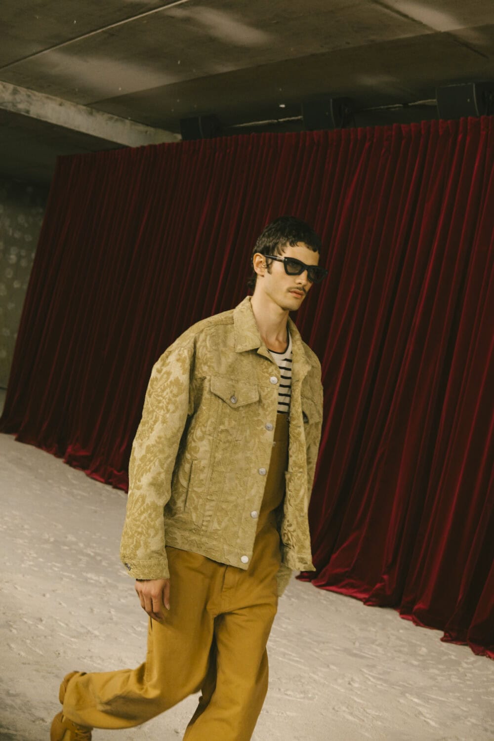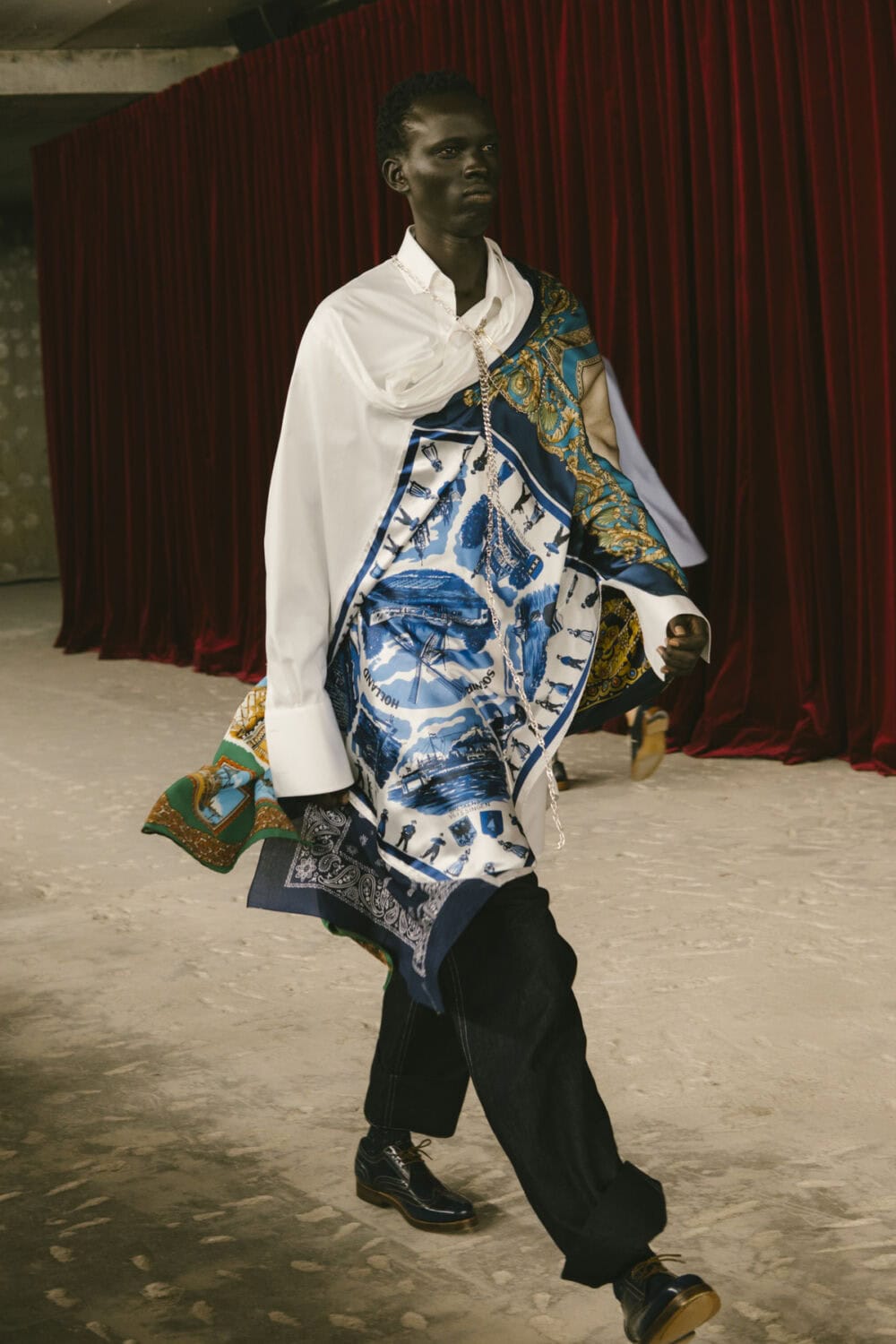 Watanabe pulled from his usual playbook – patchworking, layering and a love of heritage fabrics – but this season felt looser, more relaxed. Knitwear came pastoral and a bit precious, stitched with rolling hills and grazing sheep like postcards from a farm boy’s daydream. Trousers came baggy, breezy or skinny with a ‘70s-style kick flair. Denim made a strong showing too, in Frankensteined or irregularly-cut jeans, the kind you’d wear to smoke outside a philosophy lecture. Artistic prints – from Munch’s painting depicting anarchist philosopher Hans Jaeger to Elizabeth Peyton’s portraiture – popped up across outerwear and tees, a witty riff on taste itself.