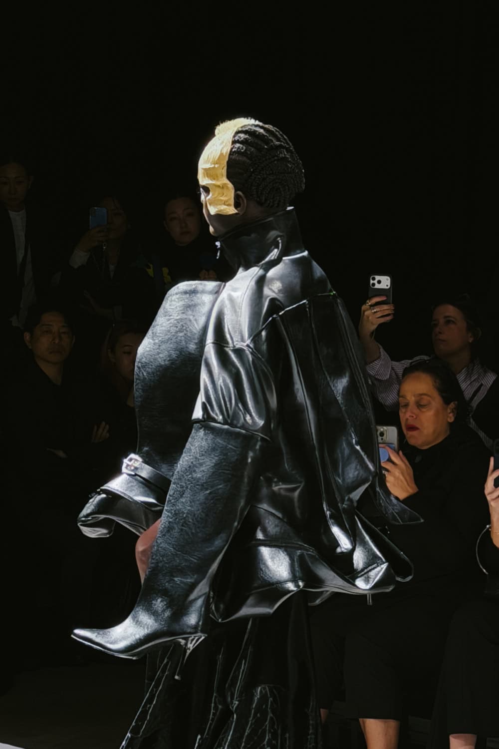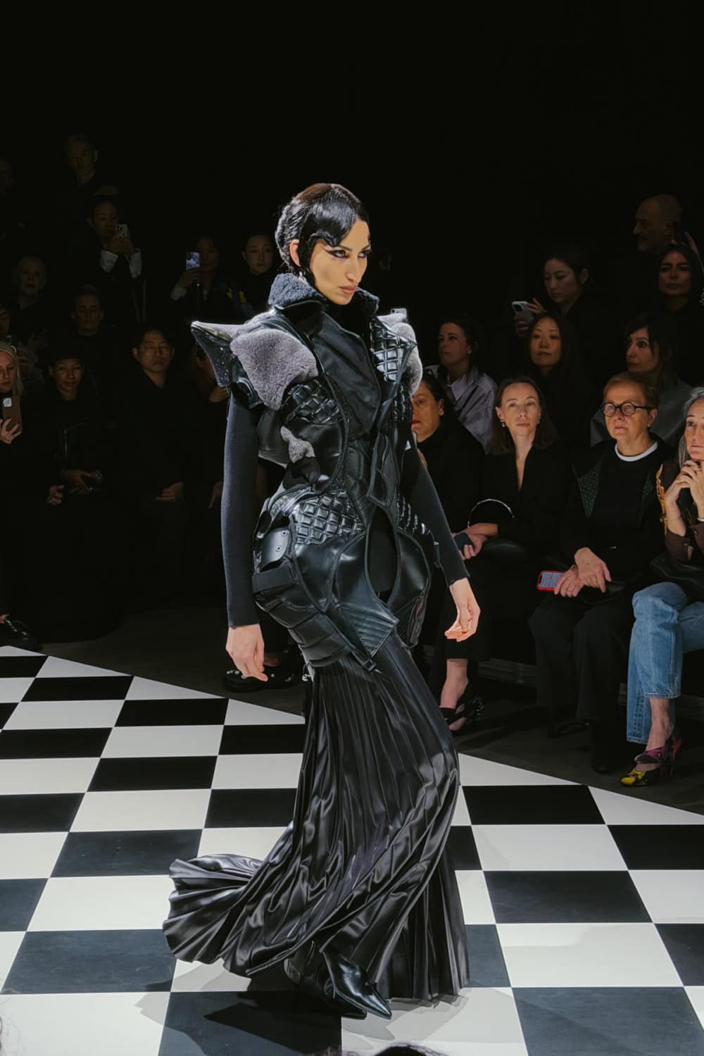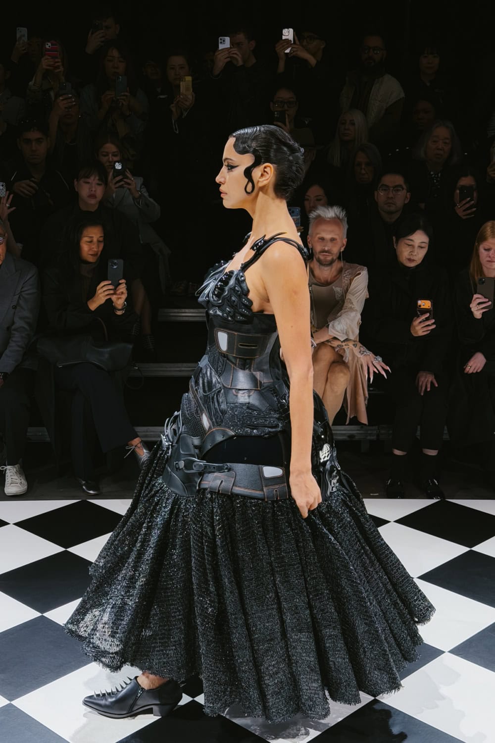 Old biker jackets, gloves and fragments of helmets, as well as heavy straps, scraps of fabric and protective pads and panels were recomposed into a series of striking bricolage gowns.