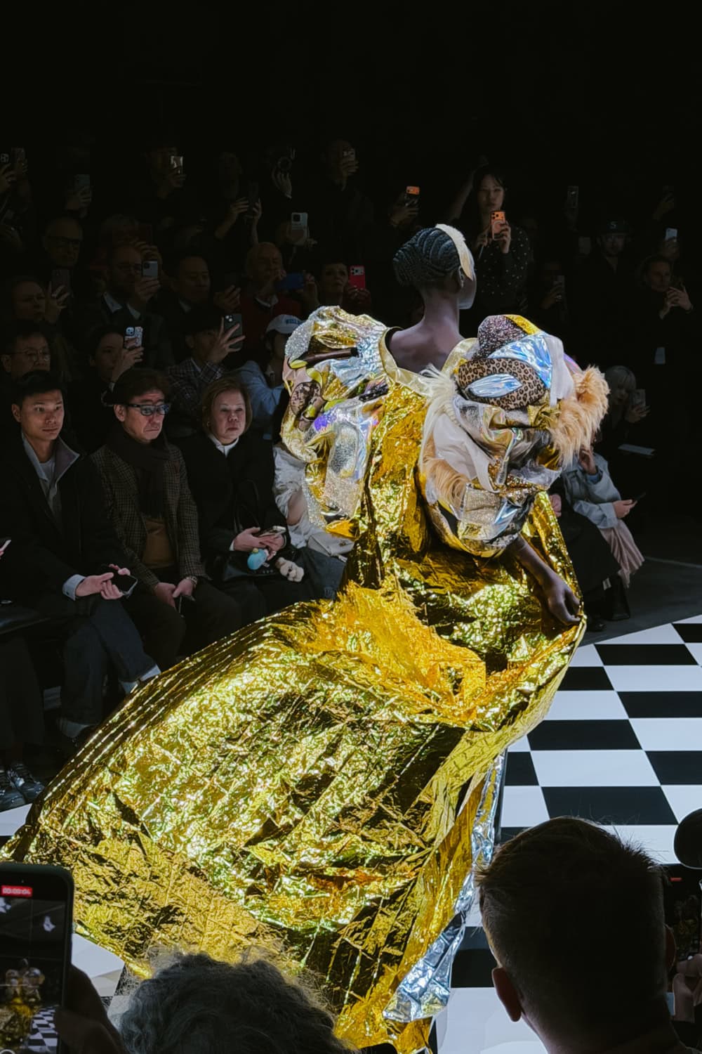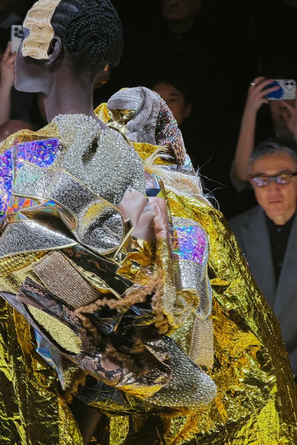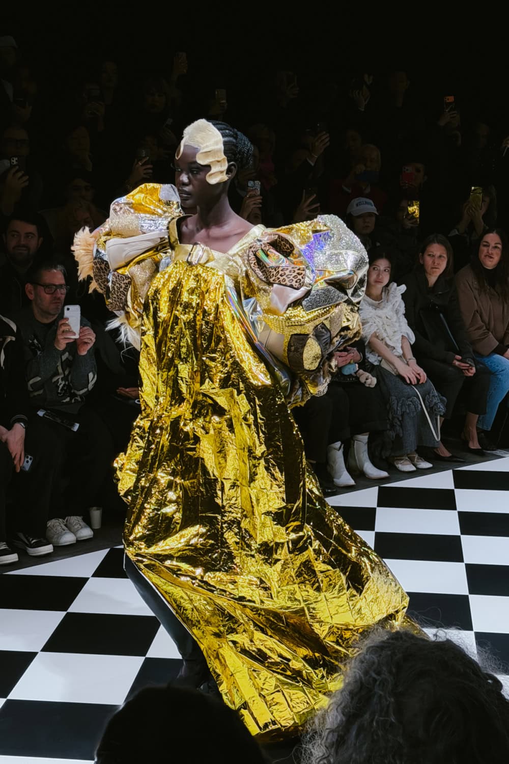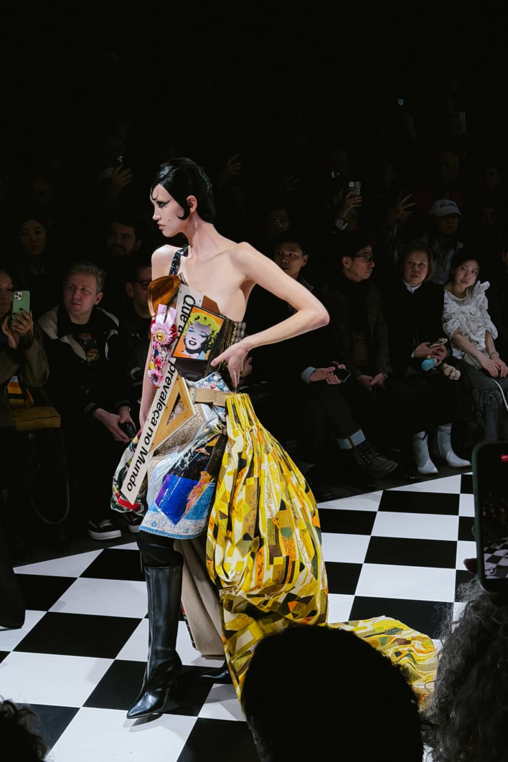There were so many ingenious, I-can’t-believe-my-eyes moments. Was that really a gown made from the metallic foil blankets given to marathon runners at the finish line? Stiletto boots became the sleeves and back panel of a swing-jacket. One model wore a stole made from stuffed animal toys. A pair of printed 1950s curtains looked like they’d been whipped off the window and attached to the back of one look to form a sweeping train. The front of that look had a bodice made from wooden set squares, a prize rosette and a glittery portrait of Marilyn Monroe. A strip of signage, worn across the body like a beauty queen’s sash read in Spanish: “May peace prevail in the world”.