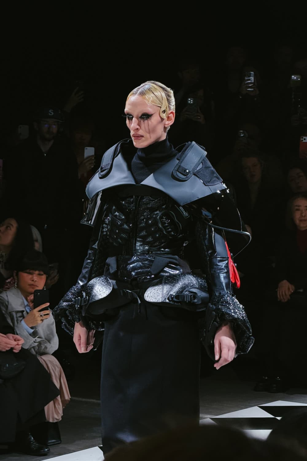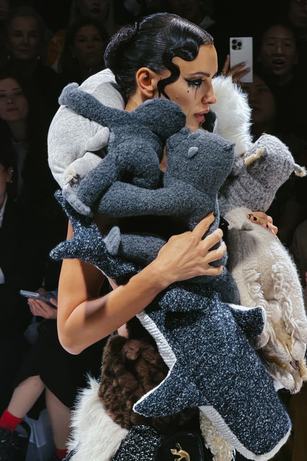 Watanabe presented it with a layer of theatre. Working with movement director Pat Boguslawski, he instructed his models, including Irina Shayk and couture favourite Maggie Maurer, to stalk the catwalk, vamping and throwing arch poses. With their hair gelled into retro kiss curls and Marcel waves, and their feline eyeliner running down their cheeks like tears, they looked like broken silent screen stars.