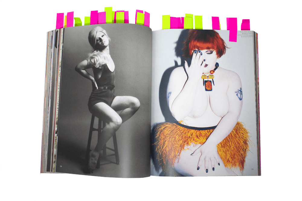 Flicking through the book, which is curated chronologically, Grand’s influence is palpable. She has helped to carve out new fashion norms, like photographing older women and including plus-size models in editorial – Love’s first issue famously featured a naked Beth Ditto from Gossip on the cover. She’s even been able to drag fashion’s biggest designers in front of the camera, too, including Miuccia Prada (who describes Grand as “a force of nature” in the book’s foreword), Marc Jacobs, or Phoebe Philo and Stella McCartney (Grand had the pair pole-dancing on the cover of the inaugural issue of Pop).