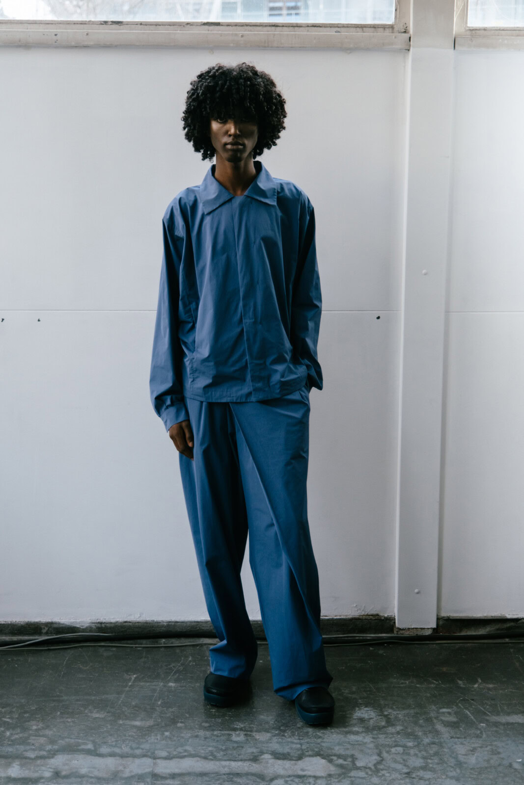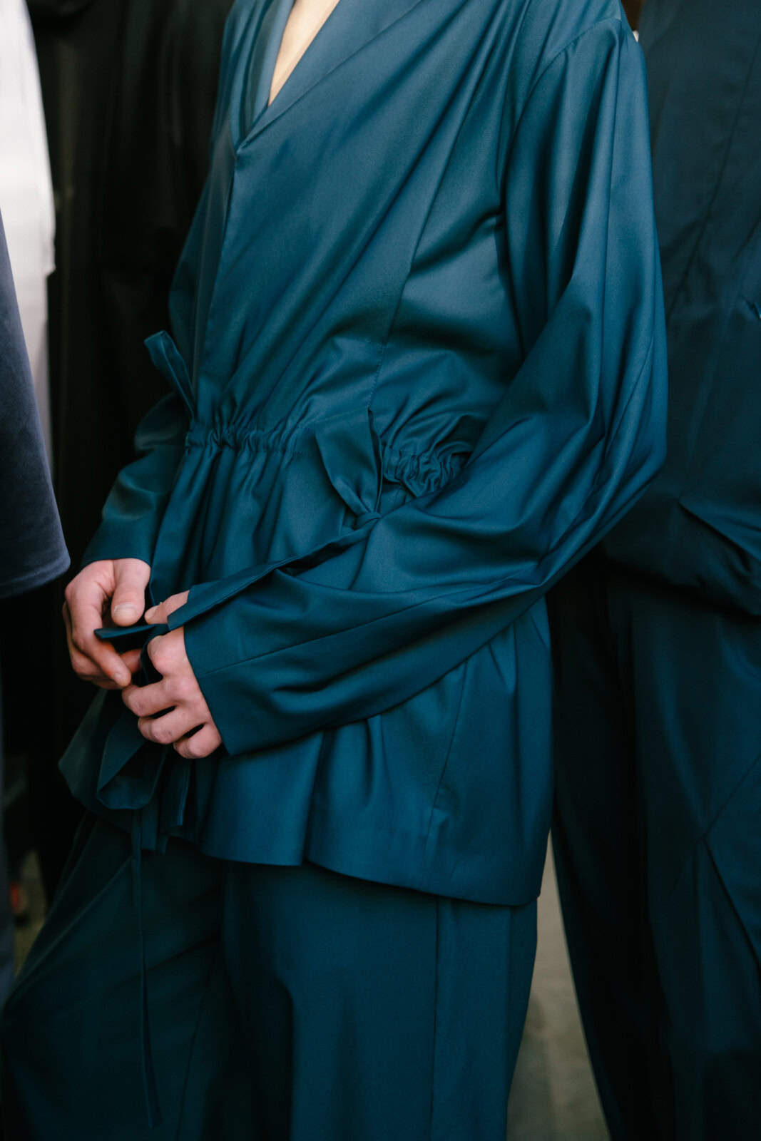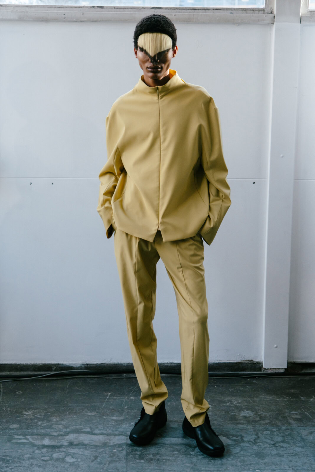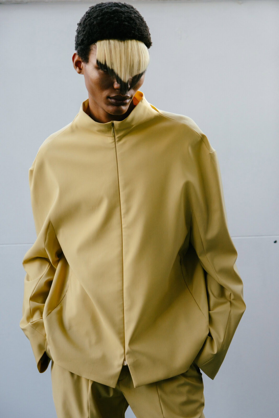 There was plenty to marvel at here. Tunic-style jackets came with origami folds. Silhouettes were fluid, from elongated suit jackets paired with slouchy trousers to swirling cotton dresses. As the collection progressed, blacks and muted blues transitioned into mustard yellows and crimson, where a series of all nylon looks that closed the show looked like jockey uniforms that were chopped and reconfigured. In stripping things back, you could truly appreciate the technical brilliance of Kostadinov’s work. It was another solid outing from one of London’s finest.