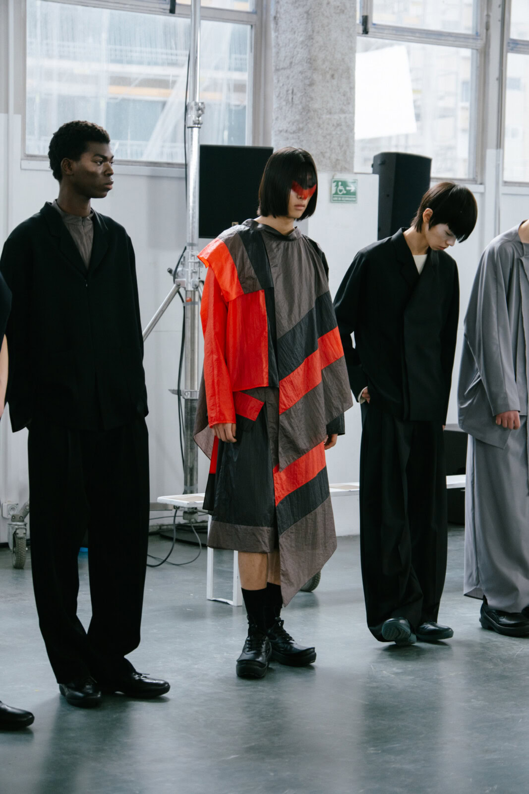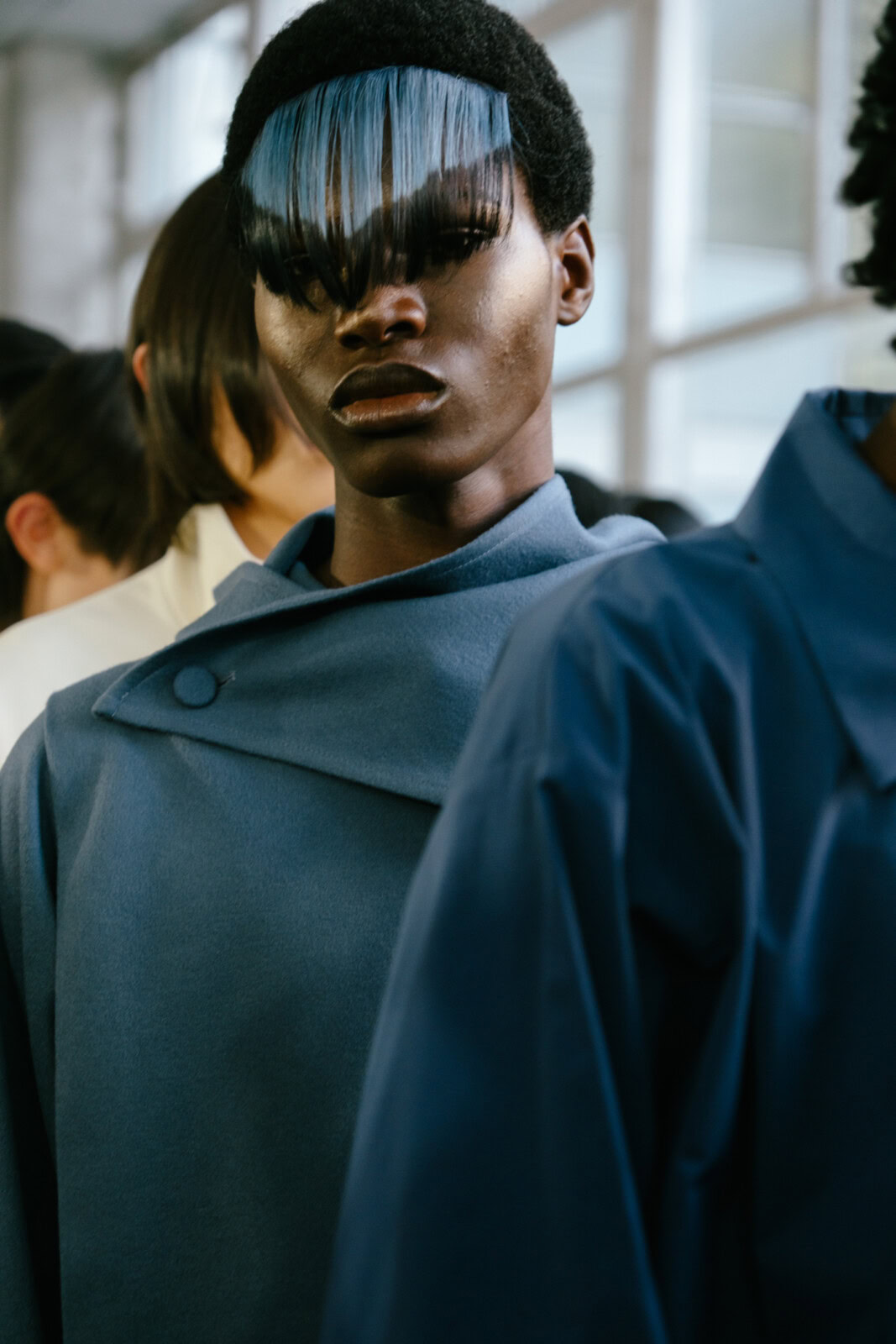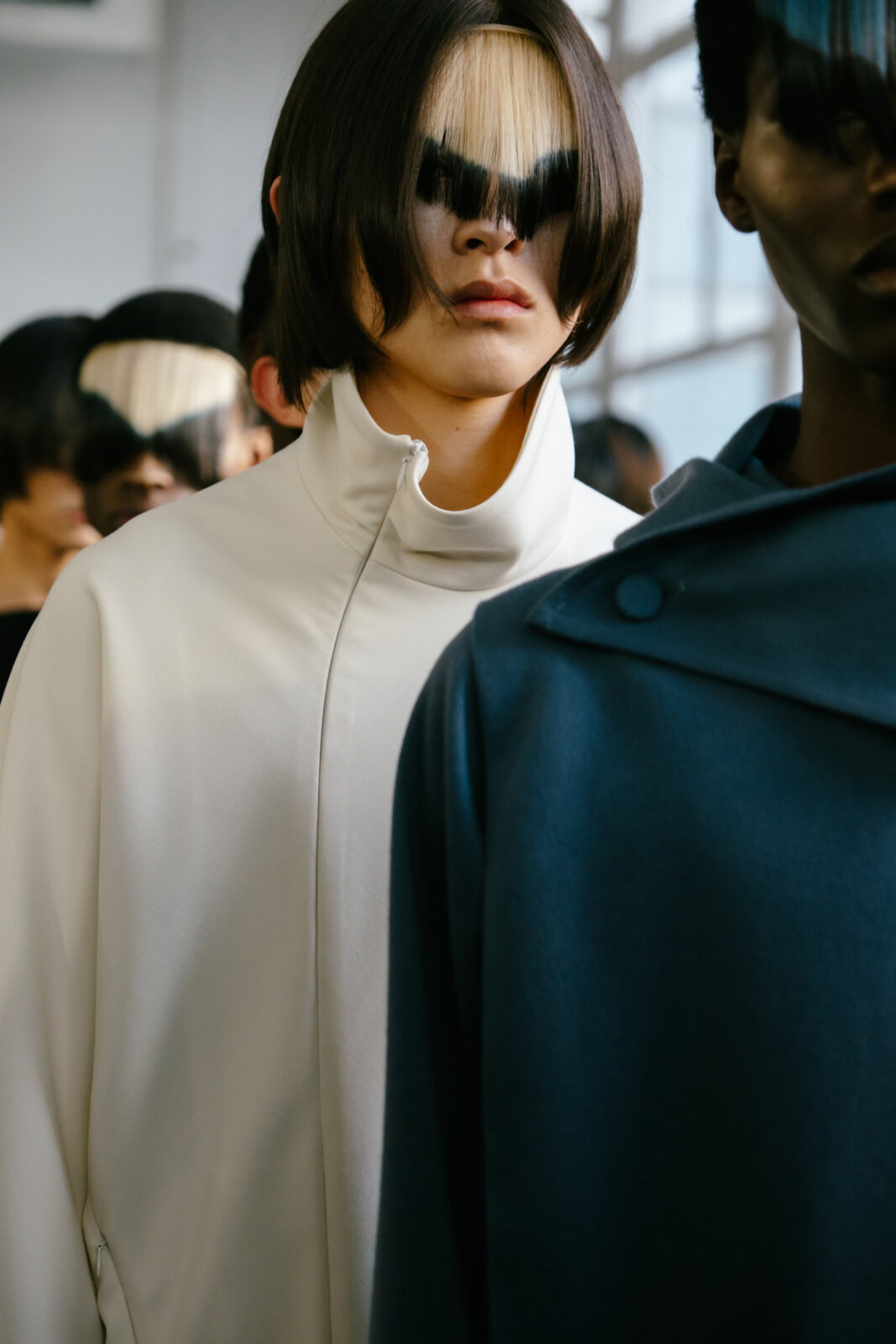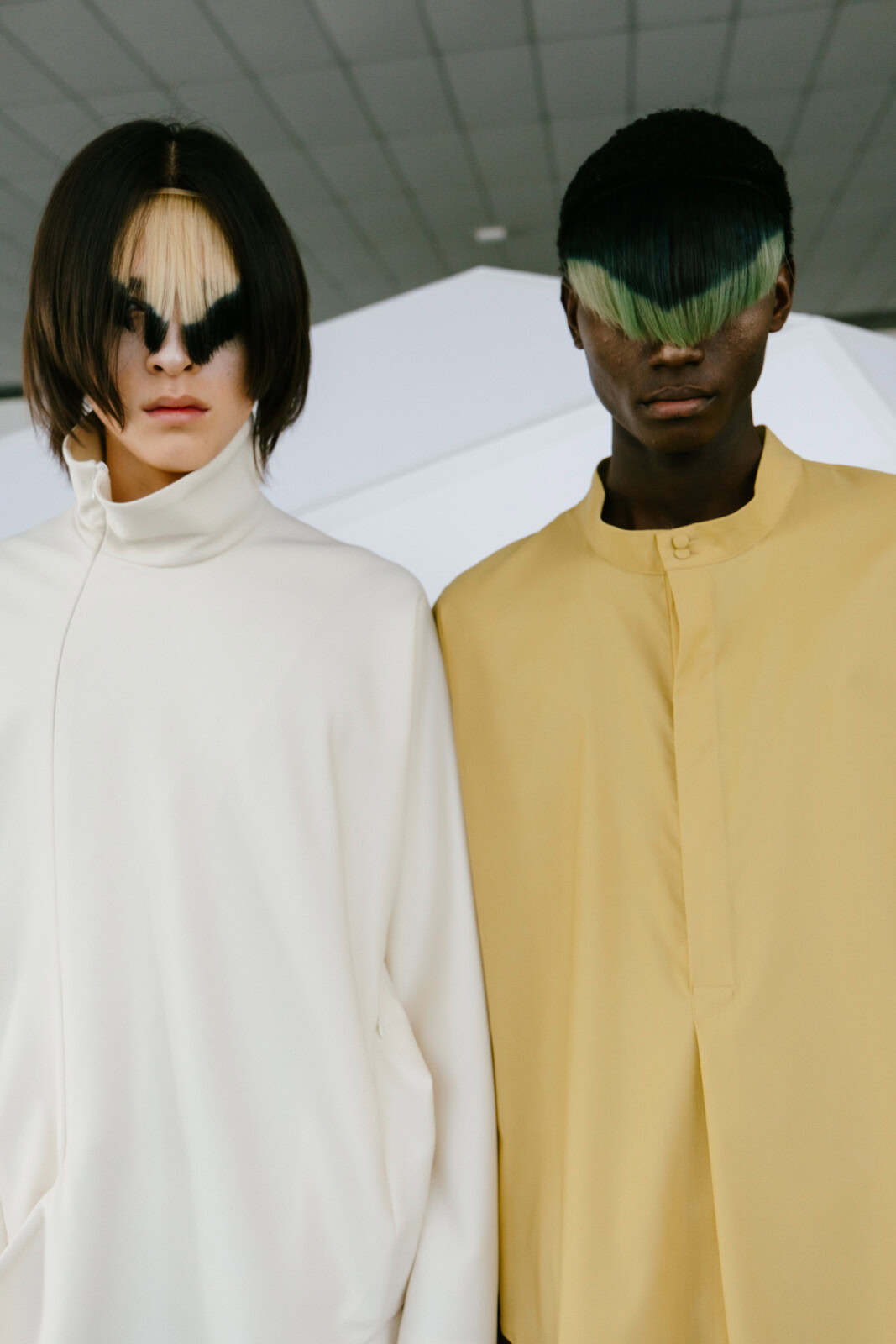 There was plenty to marvel at here. Tunic-style jackets came with origami folds. Silhouettes were fluid, from elongated suit jackets paired with slouchy trousers to swirling cotton dresses. As the collection progressed, blacks and muted blues transitioned into mustard yellows and crimson, where a series of all nylon looks that closed the show looked like jockey uniforms that were chopped and reconfigured. In stripping things back, you could truly appreciate the technical brilliance of Kostadinov’s work. It was another solid outing from one of London’s finest.