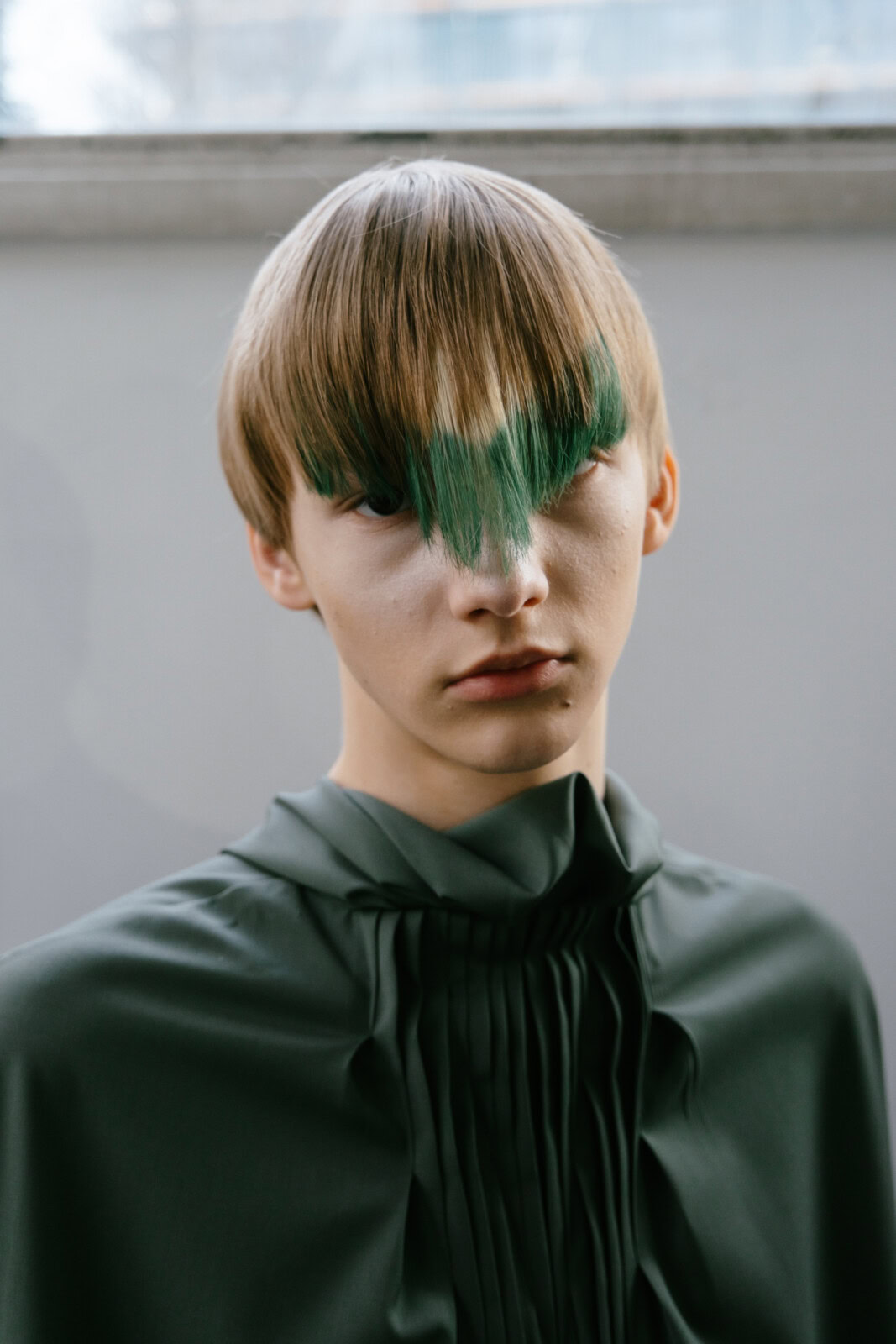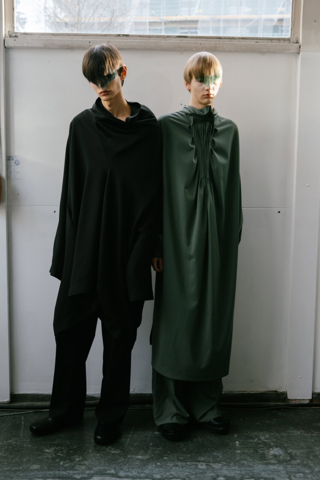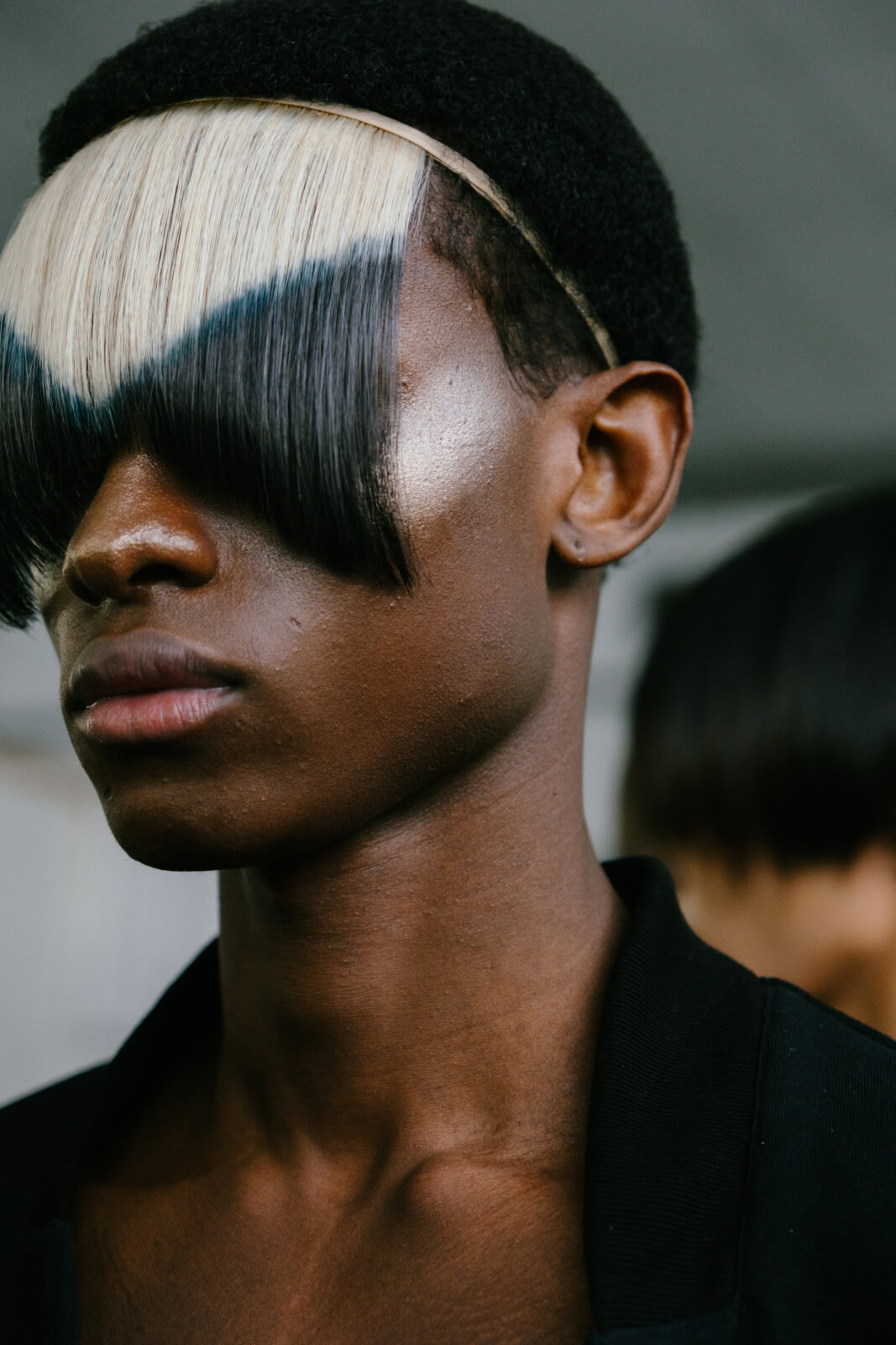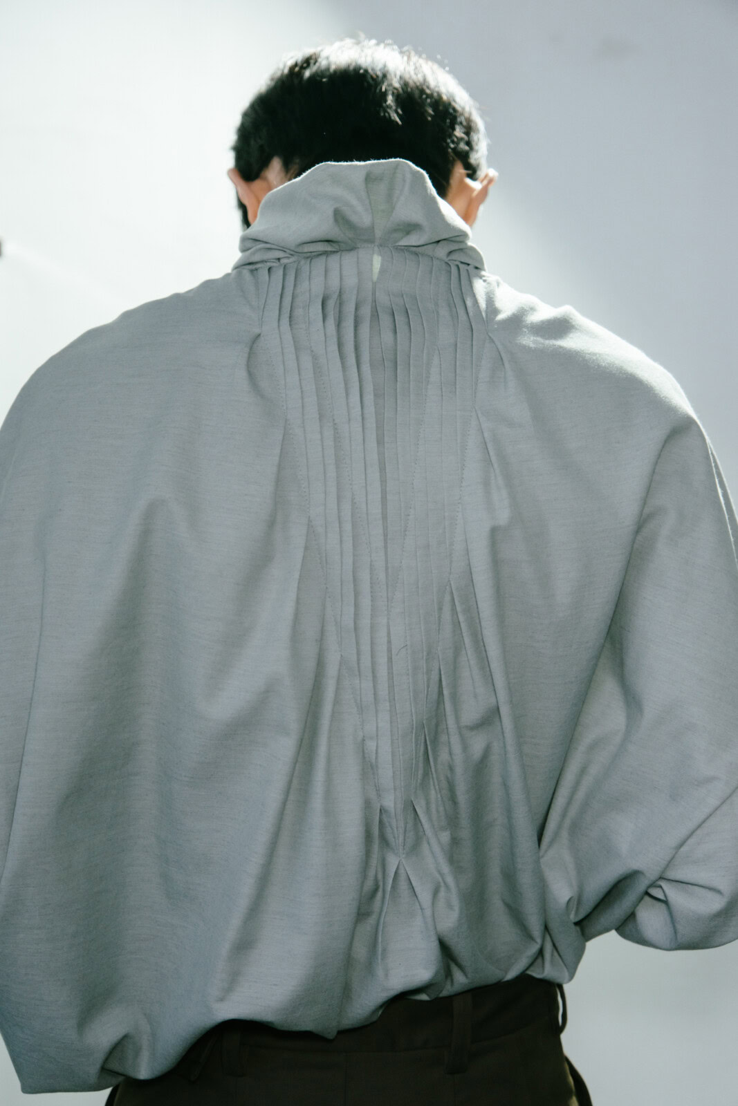 There was plenty to marvel at here. Tunic-style jackets came with origami folds. Silhouettes were fluid, from elongated suit jackets paired with slouchy trousers to swirling cotton dresses. As the collection progressed, blacks and muted blues transitioned into mustard yellows and crimson, where a series of all nylon looks that closed the show looked like jockey uniforms that were chopped and reconfigured. In stripping things back, you could truly appreciate the technical brilliance of Kostadinov’s work. It was another solid outing from one of London’s finest.