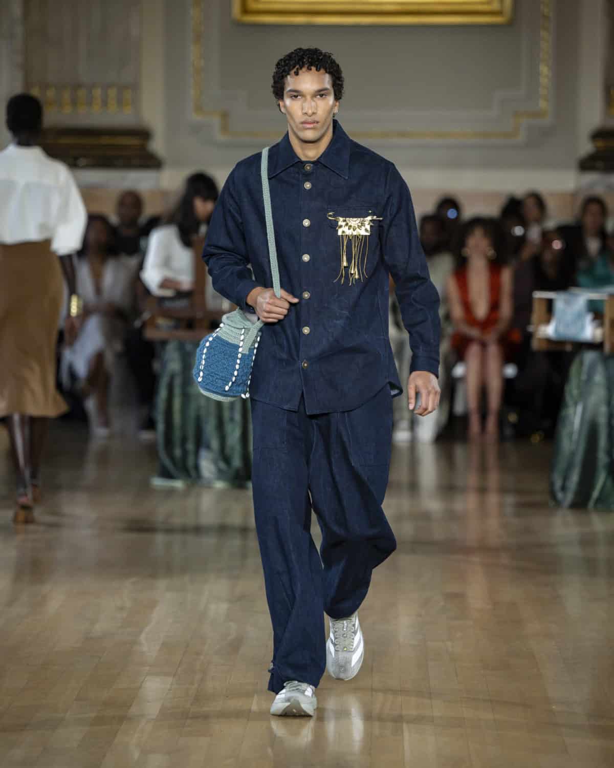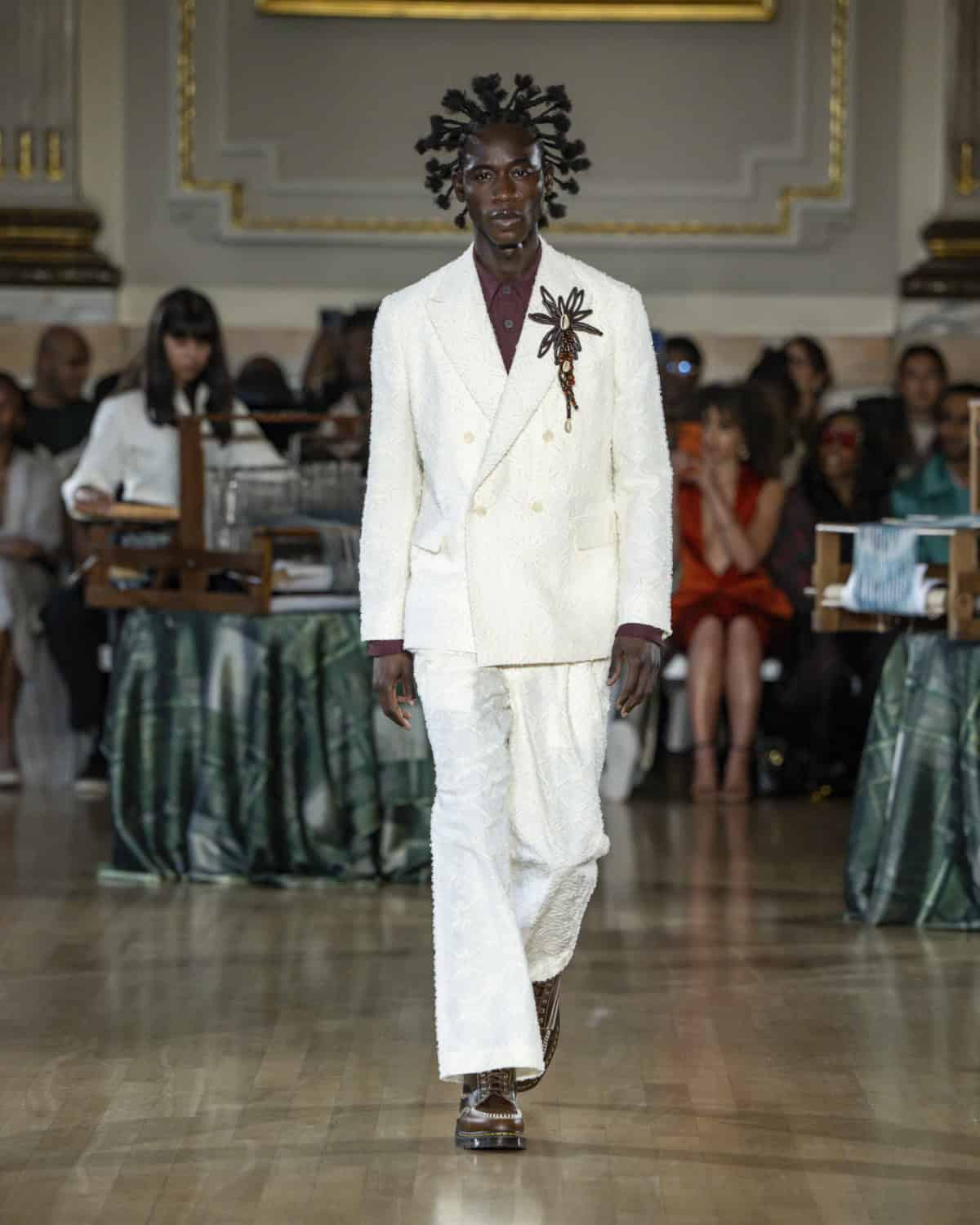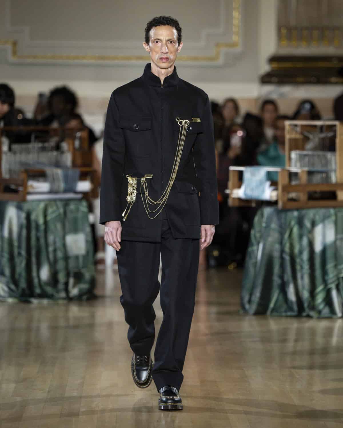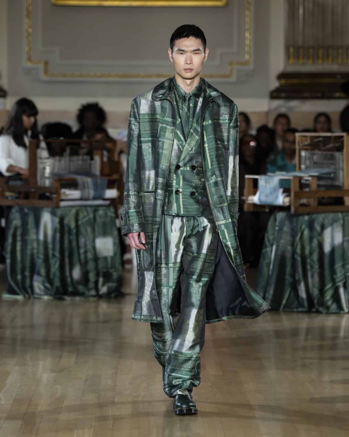 Staged within an ornate ballroom within One Great George Street, the collection, called Threads of Osmosis, placed British tailoring at the centre: structured overcoats, double-breasted suits and sharp trousers acting as a framework for fabrics with roots in West Africa, Asia and across Europe. The point wasn’t nostalgia. It was about how cloth records migration through weave, motif and cut, and how those histories can sit visibly within a Savile Row-coded silhouette.