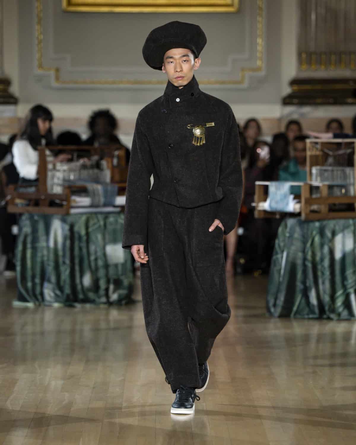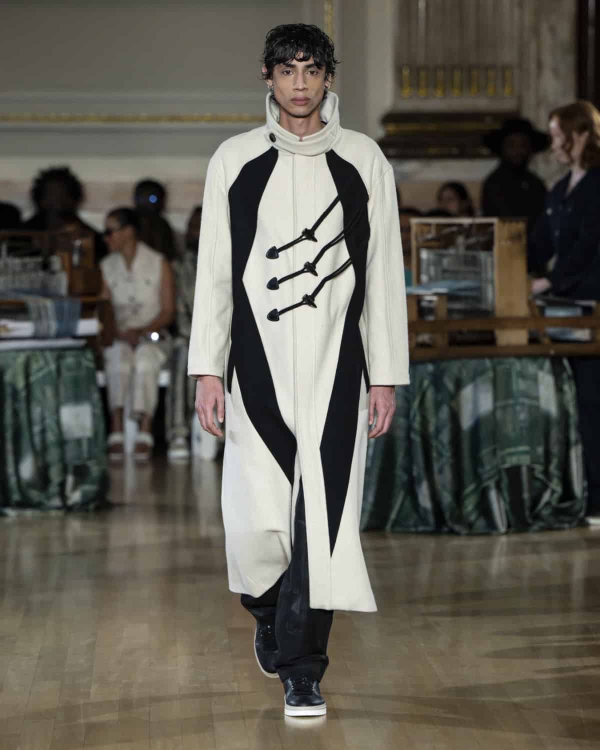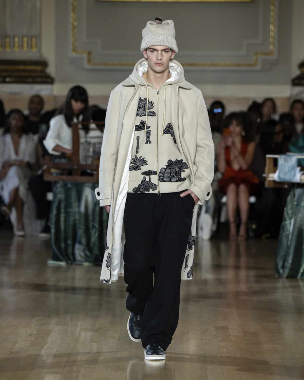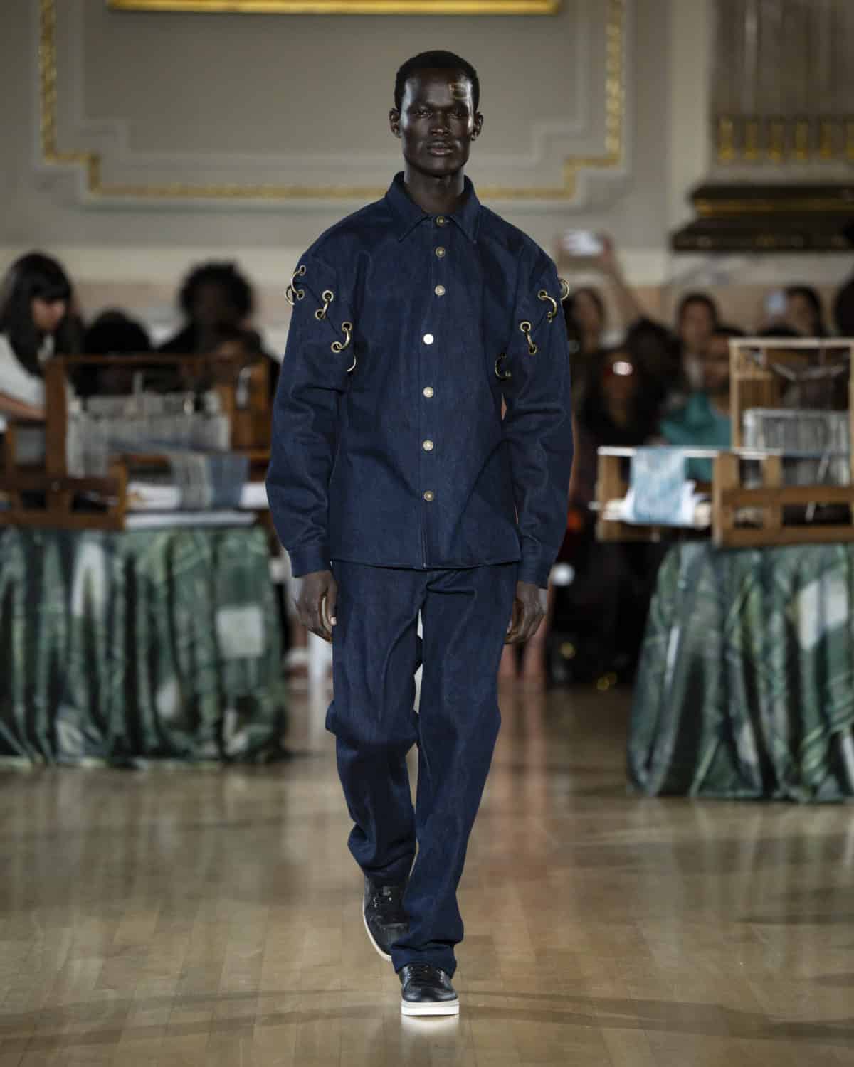 Staged within an ornate ballroom within One Great George Street, the collection, called Threads of Osmosis, placed British tailoring at the centre: structured overcoats, double-breasted suits and sharp trousers acting as a framework for fabrics with roots in West Africa, Asia and across Europe. The point wasn’t nostalgia. It was about how cloth records migration through weave, motif and cut, and how those histories can sit visibly within a Savile Row-coded silhouette.