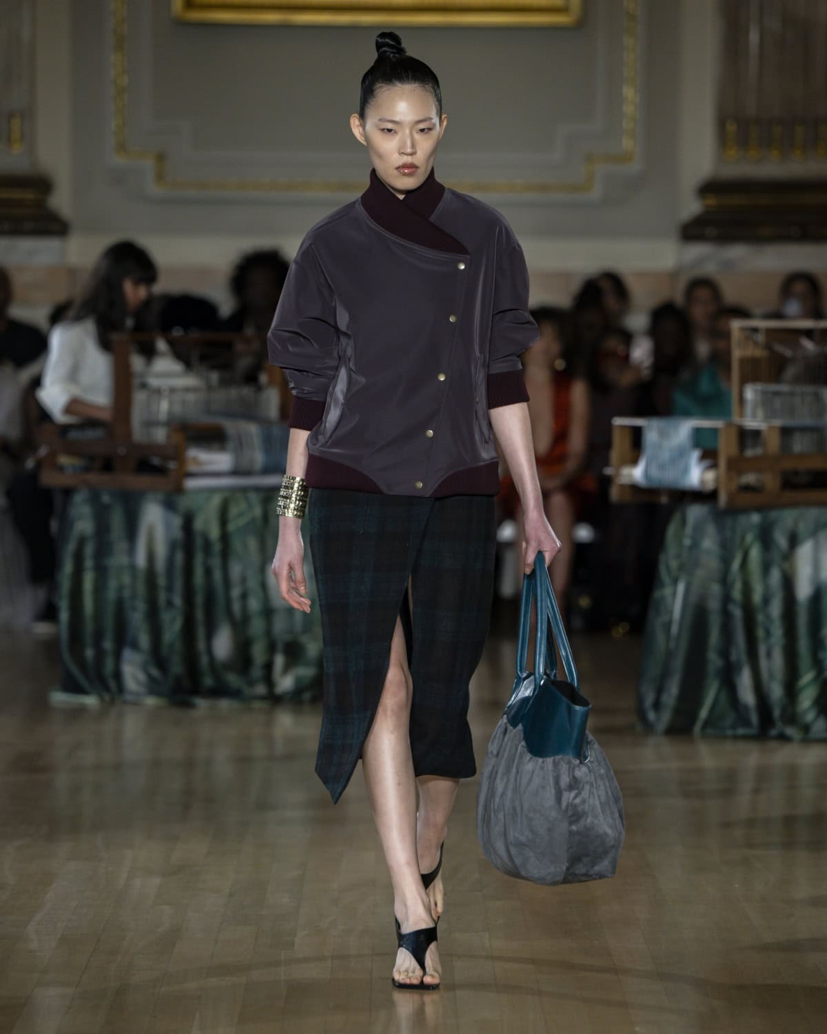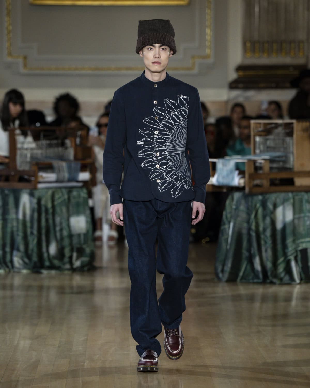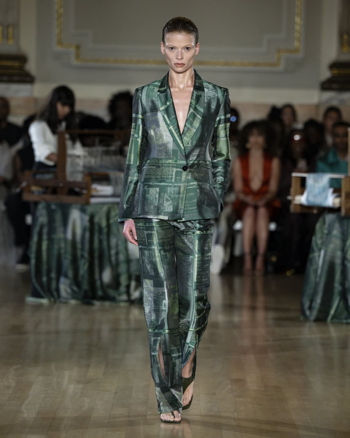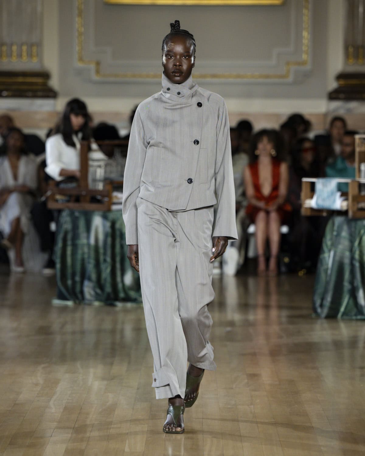 Staged within an ornate ballroom within One Great George Street, the collection, called Threads of Osmosis, placed British tailoring at the centre: structured overcoats, double-breasted suits and sharp trousers acting as a framework for fabrics with roots in West Africa, Asia and across Europe. The point wasn’t nostalgia. It was about how cloth records migration through weave, motif and cut, and how those histories can sit visibly within a Savile Row-coded silhouette.