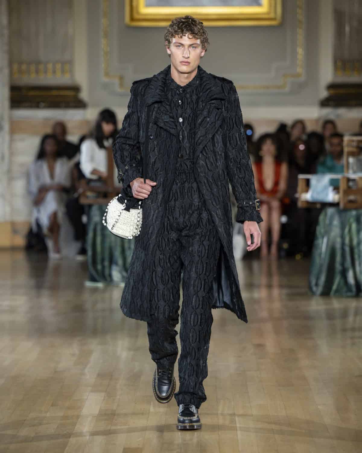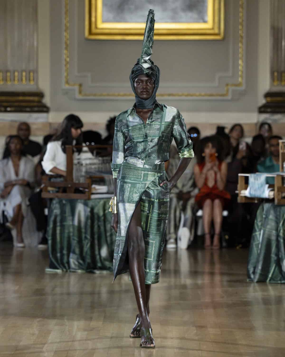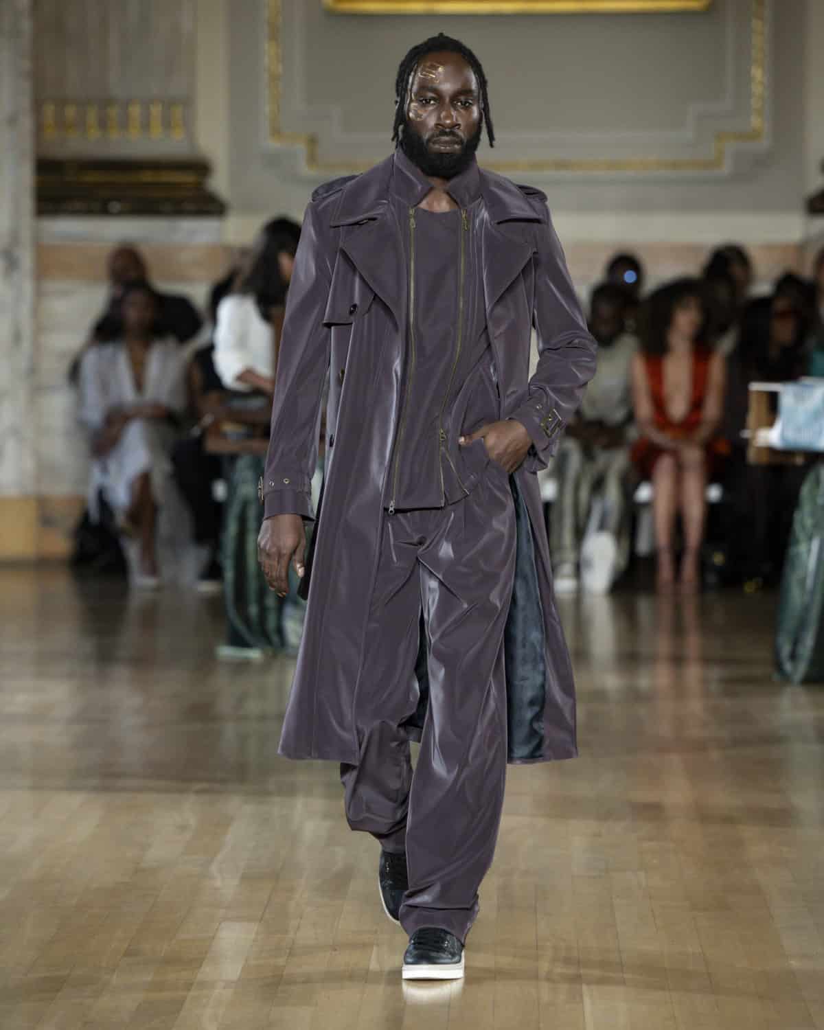 Some of the strongest looks came in a beautifully iridescent fabric that seemed to subtly shift colour under the lights and resembled a kind of patchwork of world maps stitched together. In tailored coats and relaxed two-pieces, it felt deliberate and modern rather than decorative. The collection made a clear case: textiles don’t just decorate the body, they document. Dumbaya knows exactly how to cut that story into something sharp and wearable.