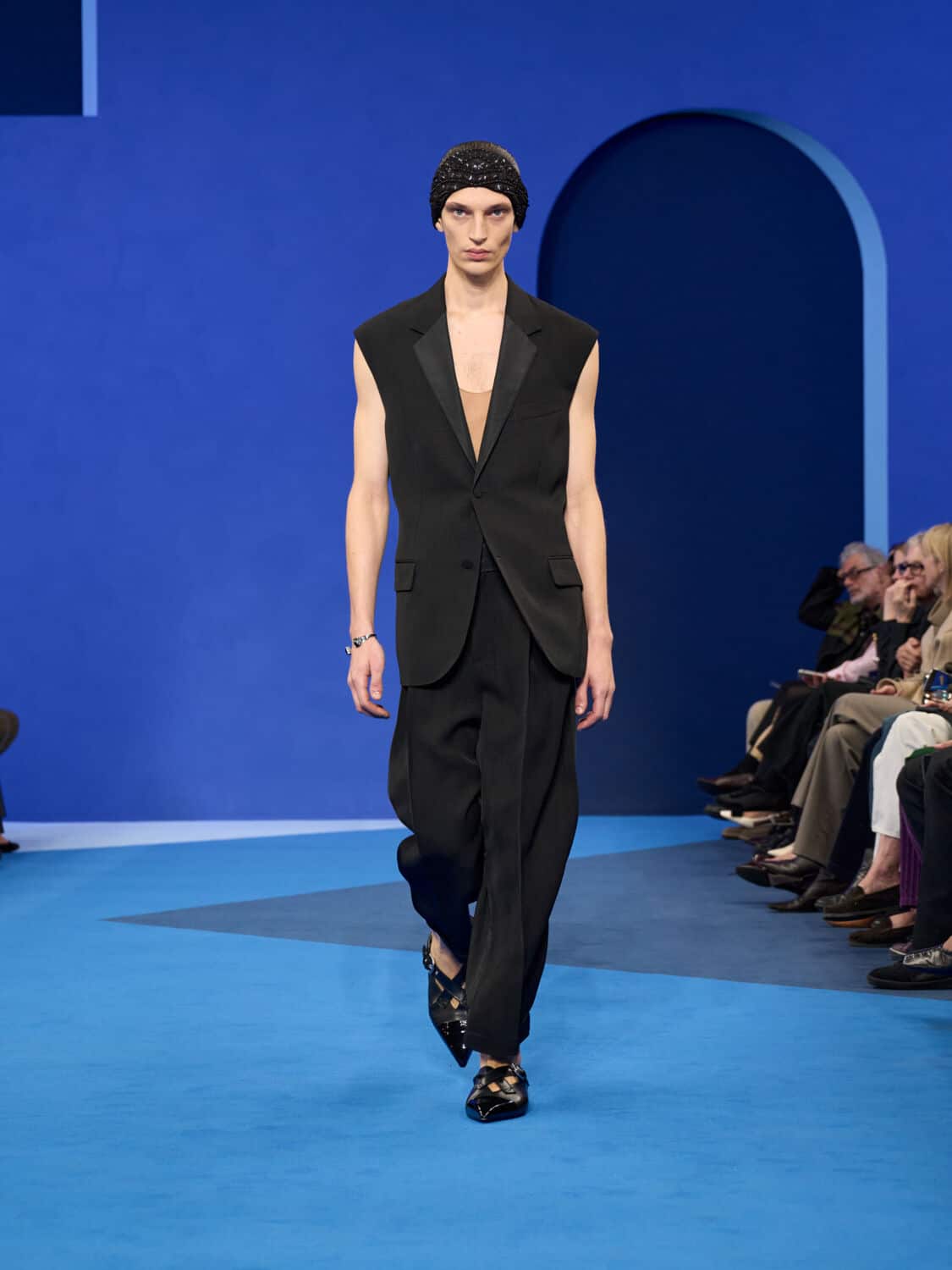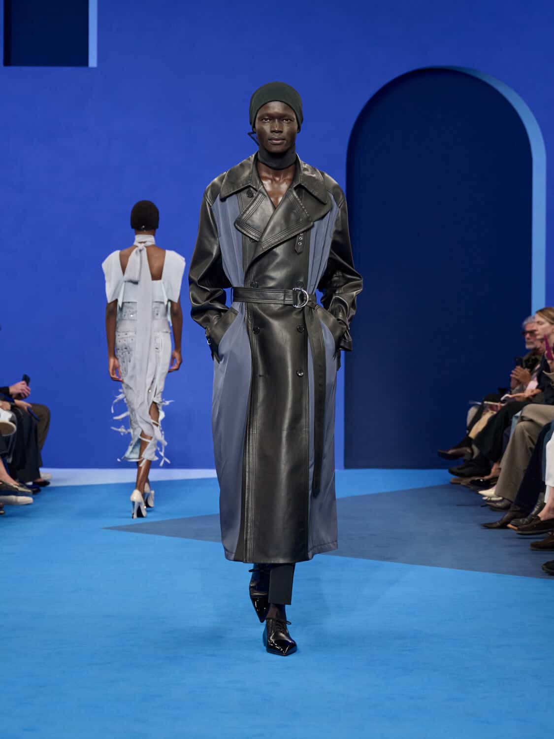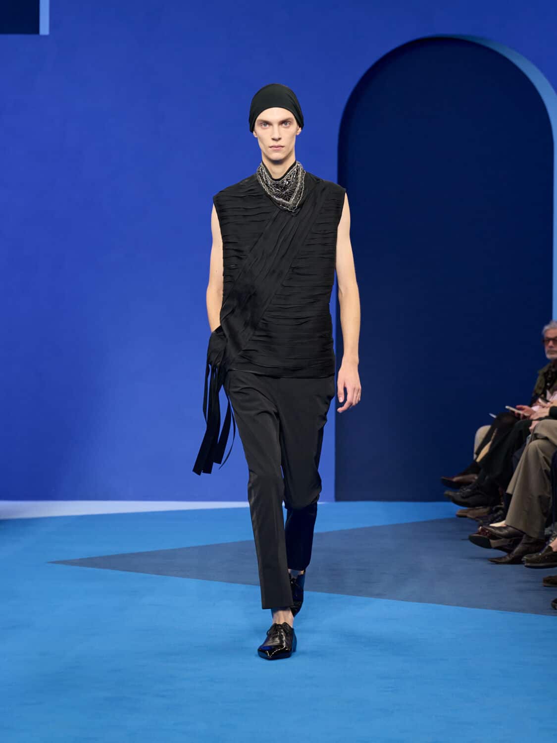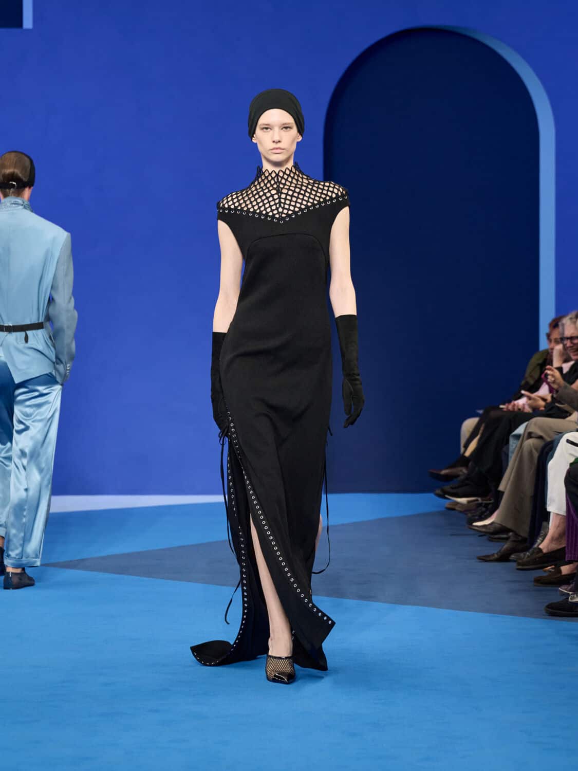Blue – not just ‘Lanvin blue’ but a whole spectrum of it – washed through the collection, bringing with it a calm clarity. Evening gowns suspended by grosgrain ribbons felt simultaneously delicate and strong, while the same ribbon transformed into men’s evening tops with a flicker of irreverence. The interiors of garments became exteriors, seams and revers celebrated as decoration, in an echo of Jeanne Lanvin’s obsession with refinement from every angle.