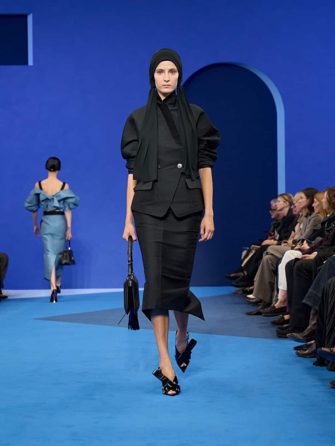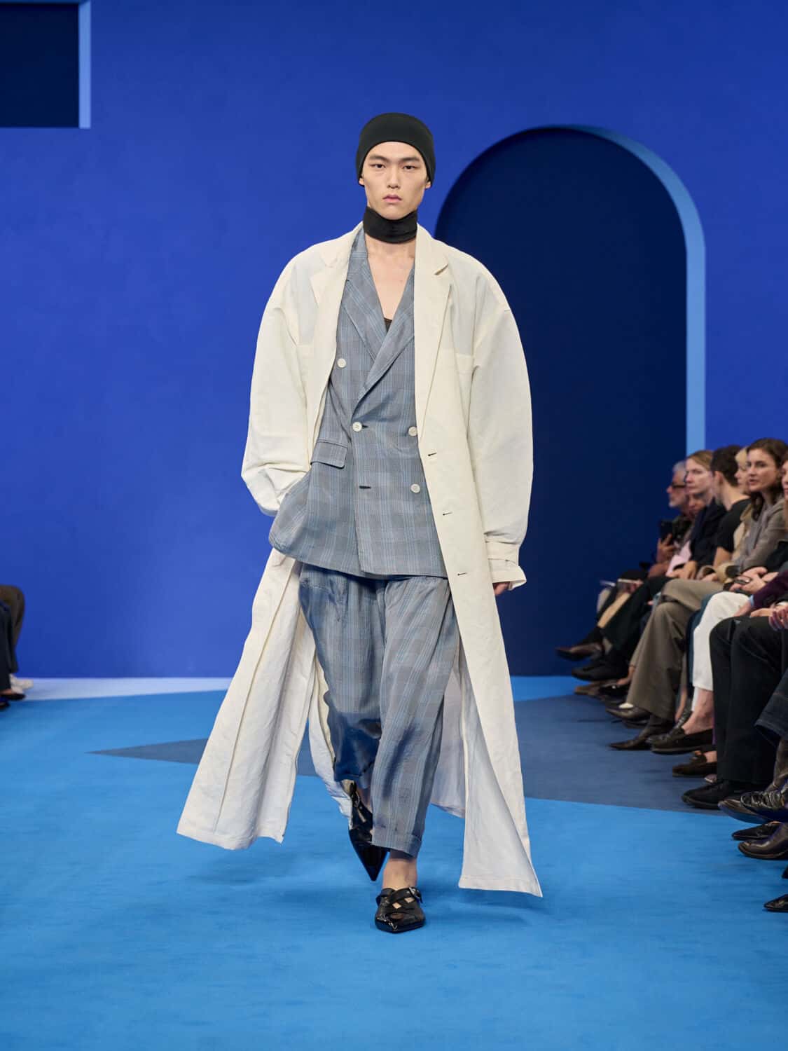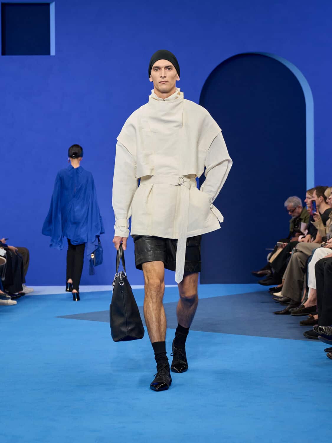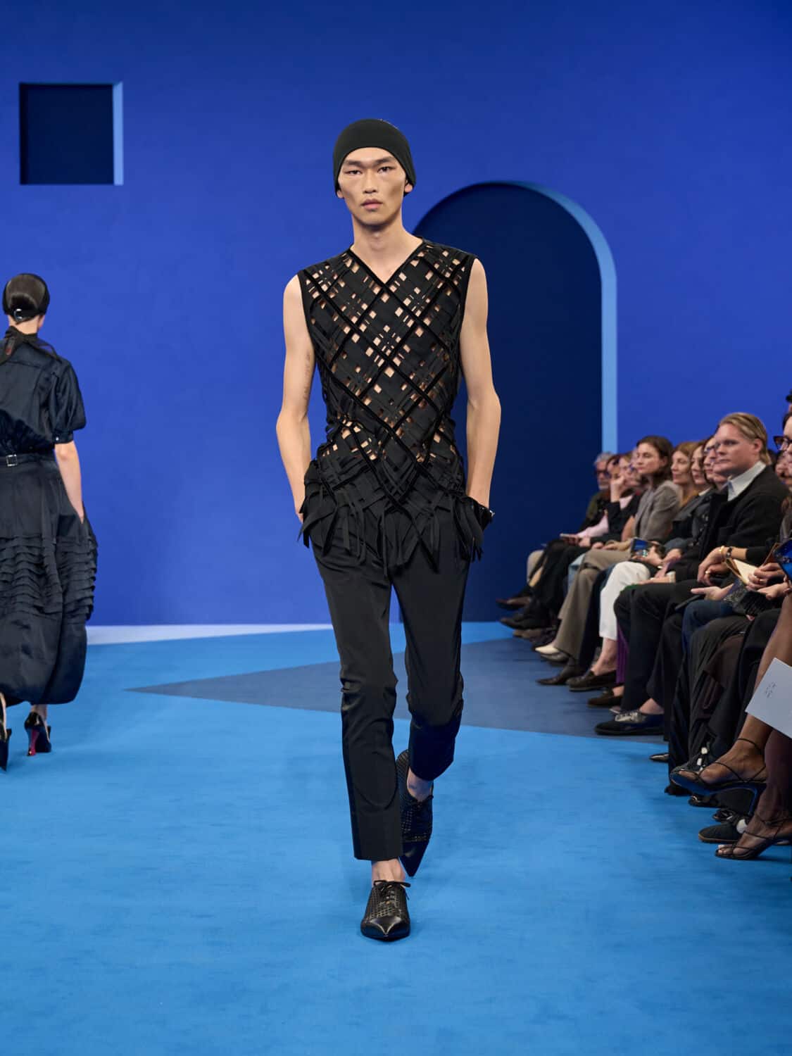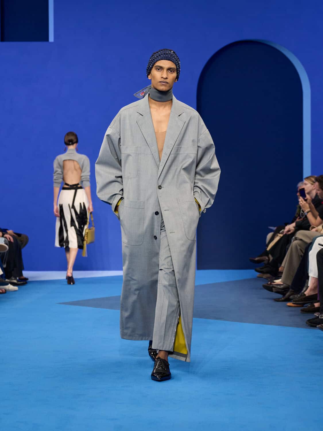 Blue – not just ‘Lanvin blue’ but a whole spectrum of it – washed through the collection, bringing with it a calm clarity. Evening gowns suspended by grosgrain ribbons felt simultaneously delicate and strong, while the same ribbon transformed into men’s evening tops with a flicker of irreverence. The interiors of garments became exteriors, seams and revers celebrated as decoration, in an echo of Jeanne Lanvin’s obsession with refinement from every angle.