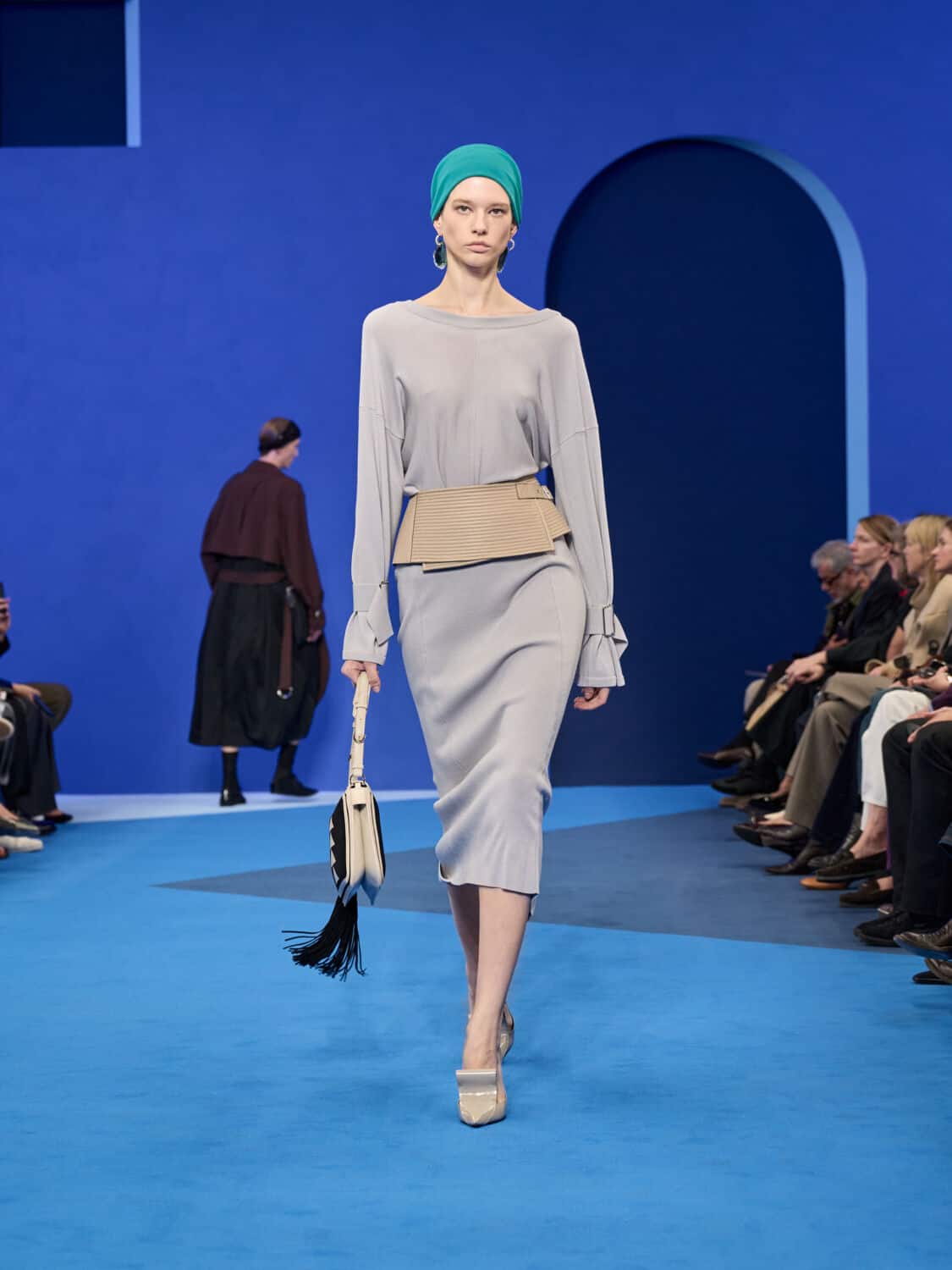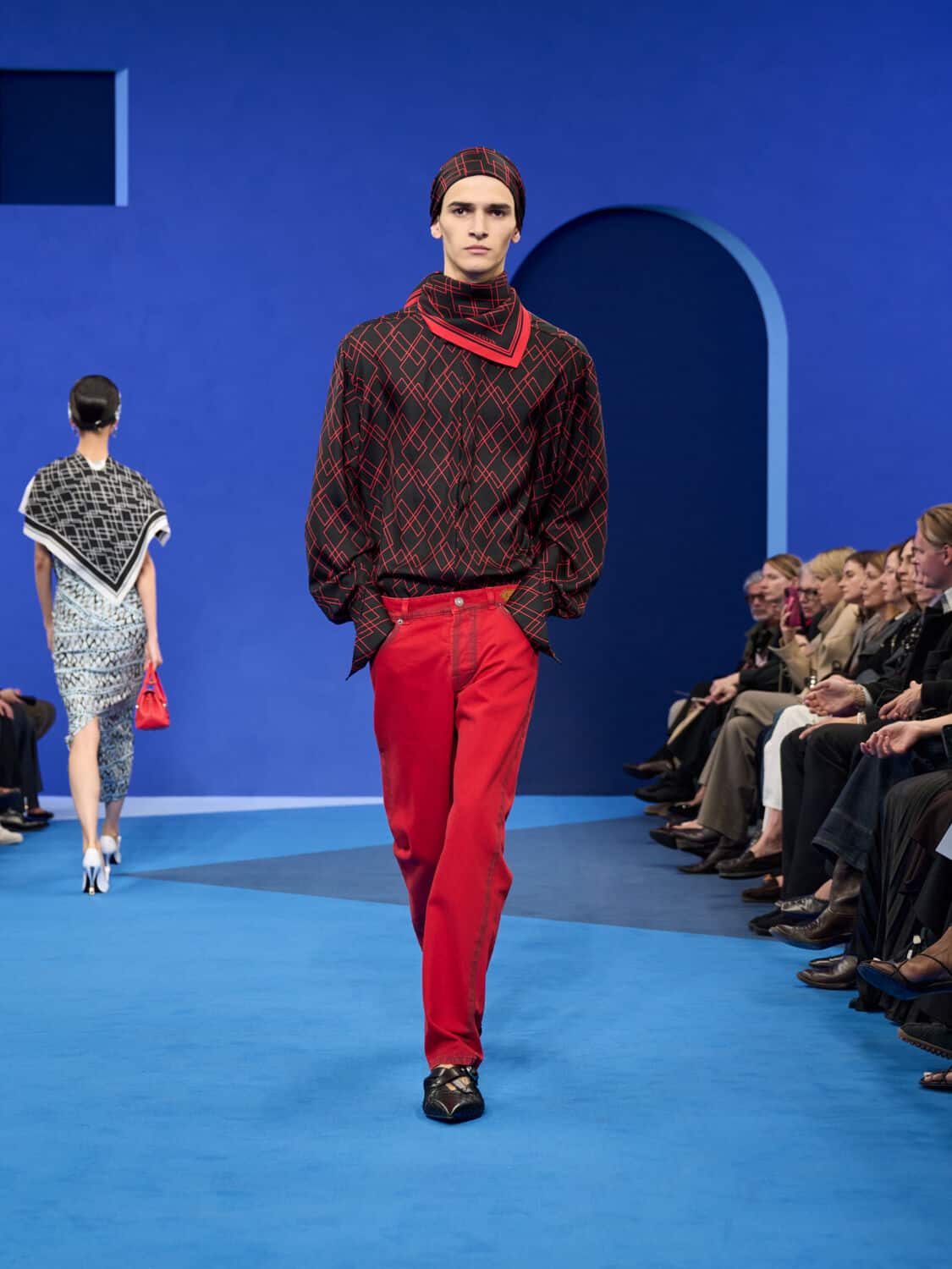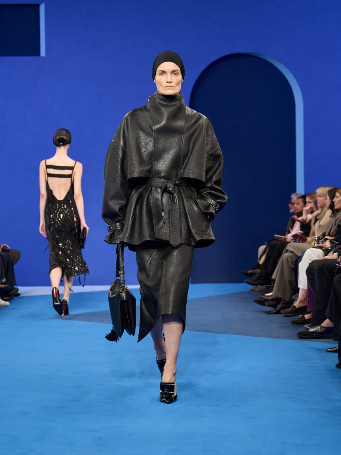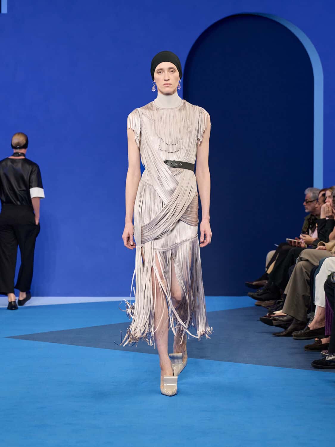 Blue – not just ‘Lanvin blue’ but a whole spectrum of it – washed through the collection, bringing with it a calm clarity. Evening gowns suspended by grosgrain ribbons felt simultaneously delicate and strong, while the same ribbon transformed into men’s evening tops with a flicker of irreverence. The interiors of garments became exteriors, seams and revers celebrated as decoration, in an echo of Jeanne Lanvin’s obsession with refinement from every angle.