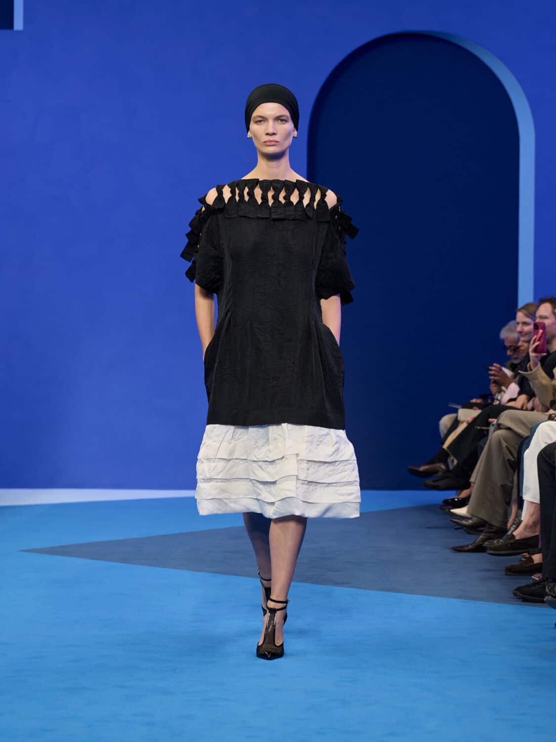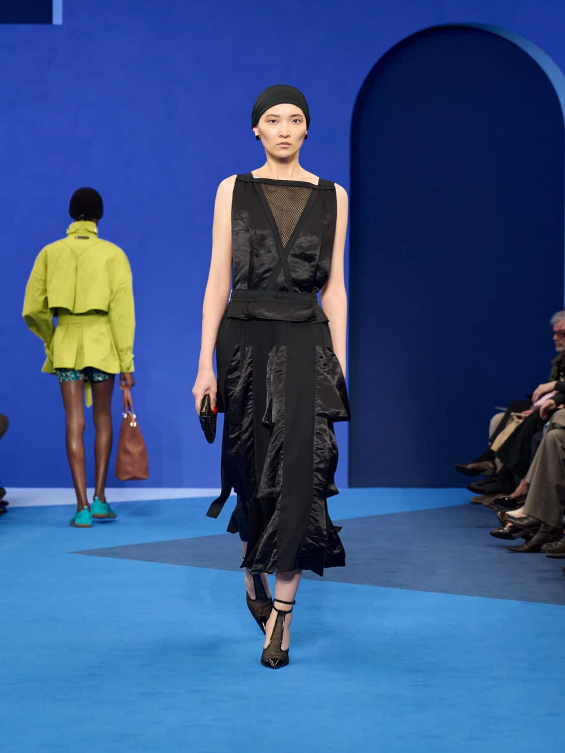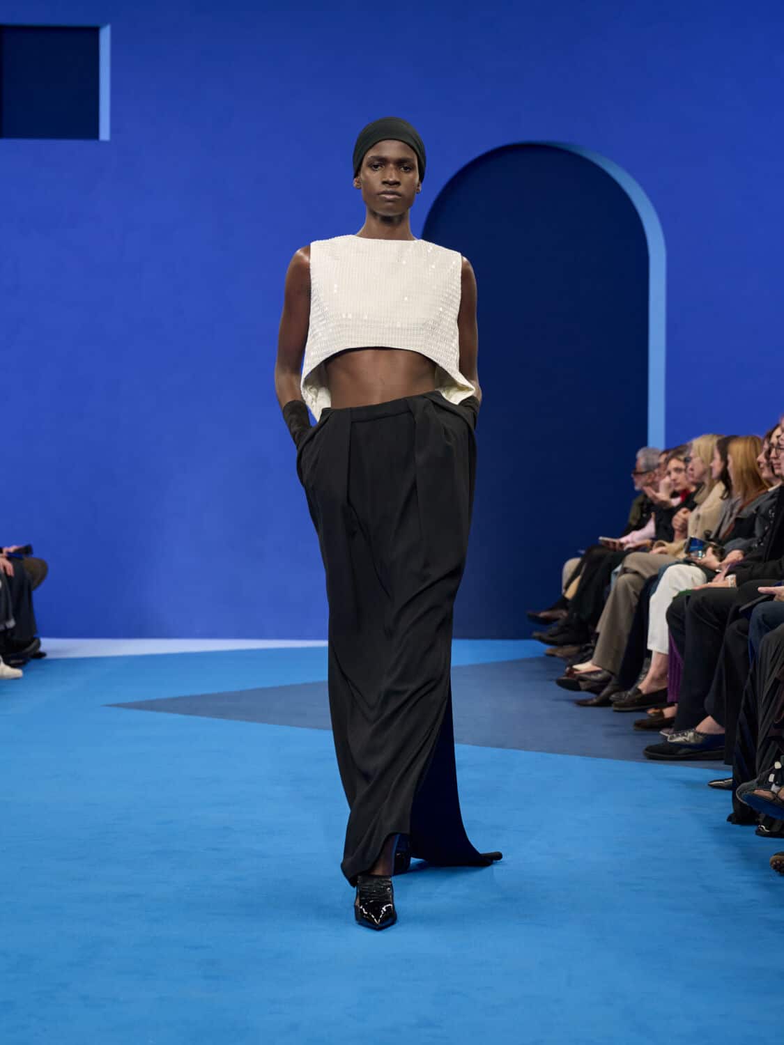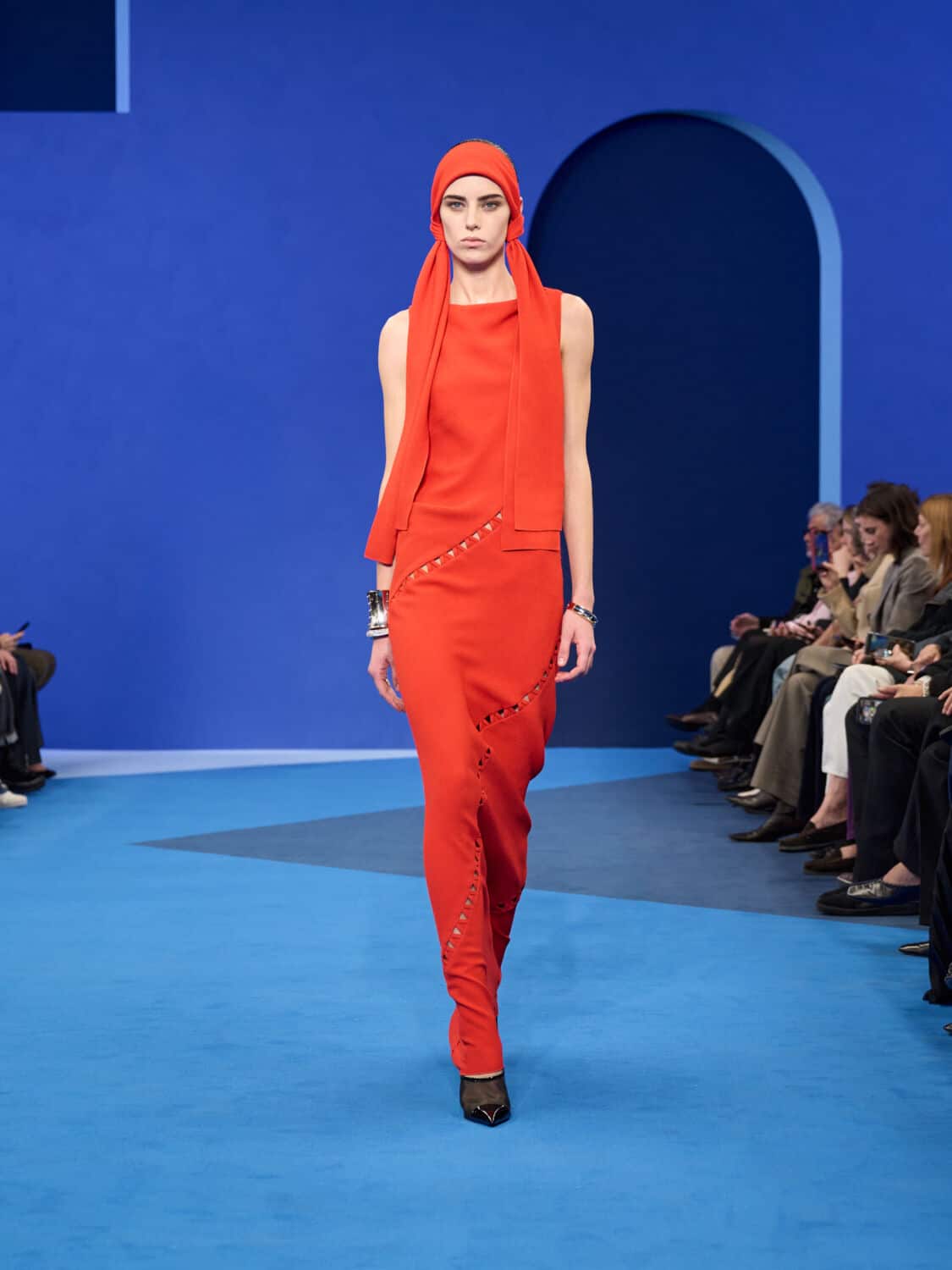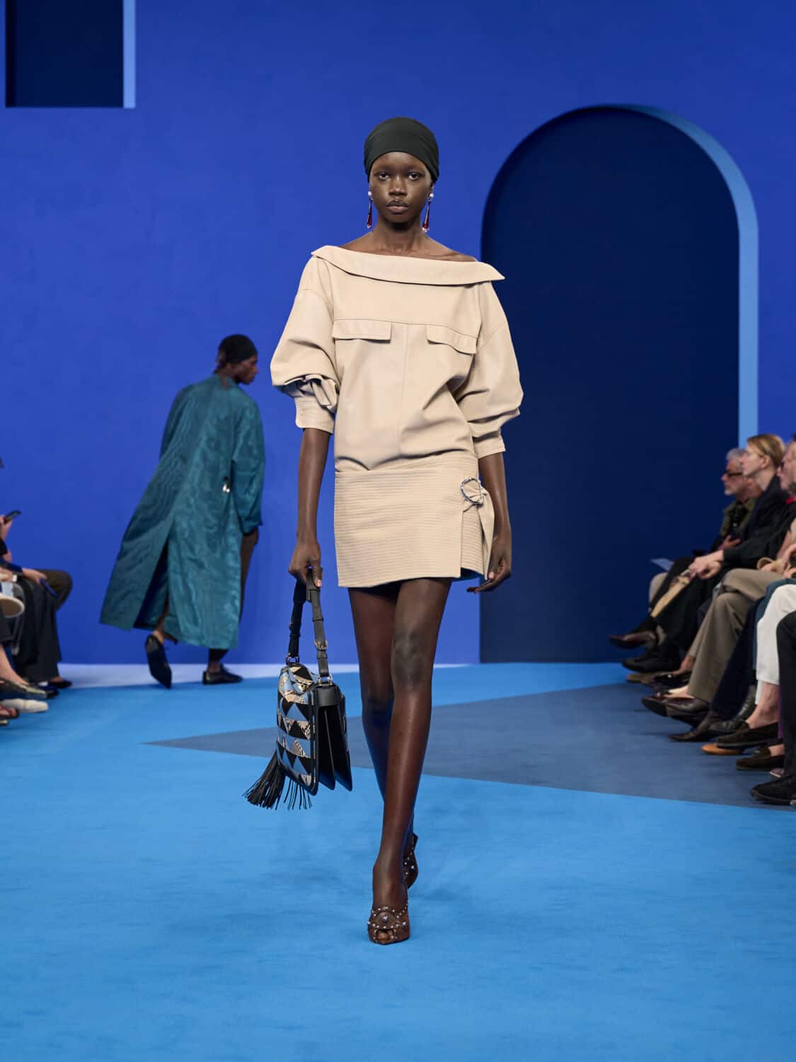 Blue – not just ‘Lanvin blue’ but a whole spectrum of it – washed through the collection, bringing with it a calm clarity. Evening gowns suspended by grosgrain ribbons felt simultaneously delicate and strong, while the same ribbon transformed into men’s evening tops with a flicker of irreverence. The interiors of garments became exteriors, seams and revers celebrated as decoration, in an echo of Jeanne Lanvin’s obsession with refinement from every angle.